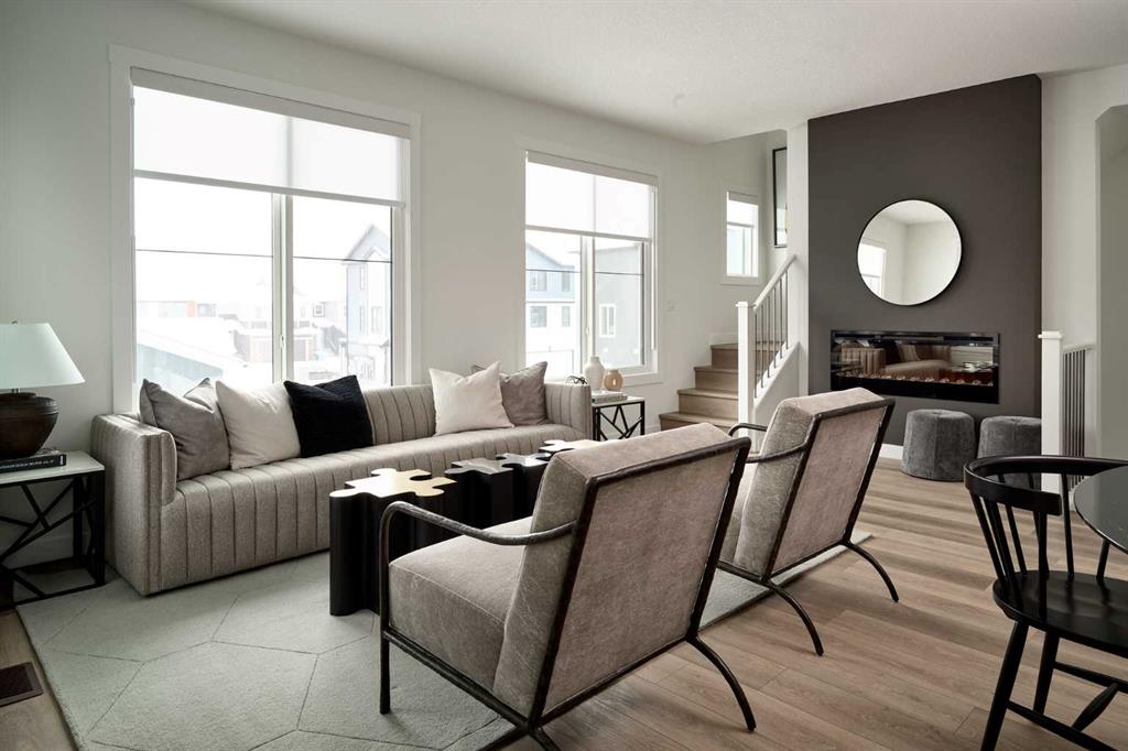 LIMITED TIME PROMOTION - Choose 2 of 3: | FREE A/C (SUPPLY & INSTALL) | 2 YEARS FREE CONDO FEES | $5,000 TOWARD WINDOW COVERINGS! The Armstrong by Brookfield Residential offers style, comfort, and convenience in the heart of Livingston. This brand-new, upgraded home features 3 bedrooms, 2.5 bathrooms, two private balconies, and a private double attached garage. The open-concept main level is ideal for entertaining, with a timeless kitchen showcasing full-height cabinets, quartz countertops, stainless-steel appliances including a chimney hood fan and built-in microwave + a spacious island for additional dining space. A bright living area with south-facing windows floods the space with natural light, while the dining area seamlessly connects to the kitchen. On the upper level, the ~11’x12’ primary retreat includes its own private balcony as well as a walk-in closet and ensuite with a walk-in shower. The upper level is completed by two additional bedrooms, a full bathroom, and laundry. Upgrades include A/C rough-in, a gas line for your BBQ on the main level balcony, and durable LVP flooring on the entry stairs. With nearly 1,200 ft² of living space (RMS: 1,170 / Builder: 1,255), this home is perfect for professionals, small families, or investors seeking a hassle-free property. Complete with full builder and Alberta New Home Warranty, this is your opportunity to enjoy the comfort and convenience of a brand-new home in one of Calgary’s most desirable new communities. Start enjoying the maintenance-free lifestyle this winter with no more snow shovelling!