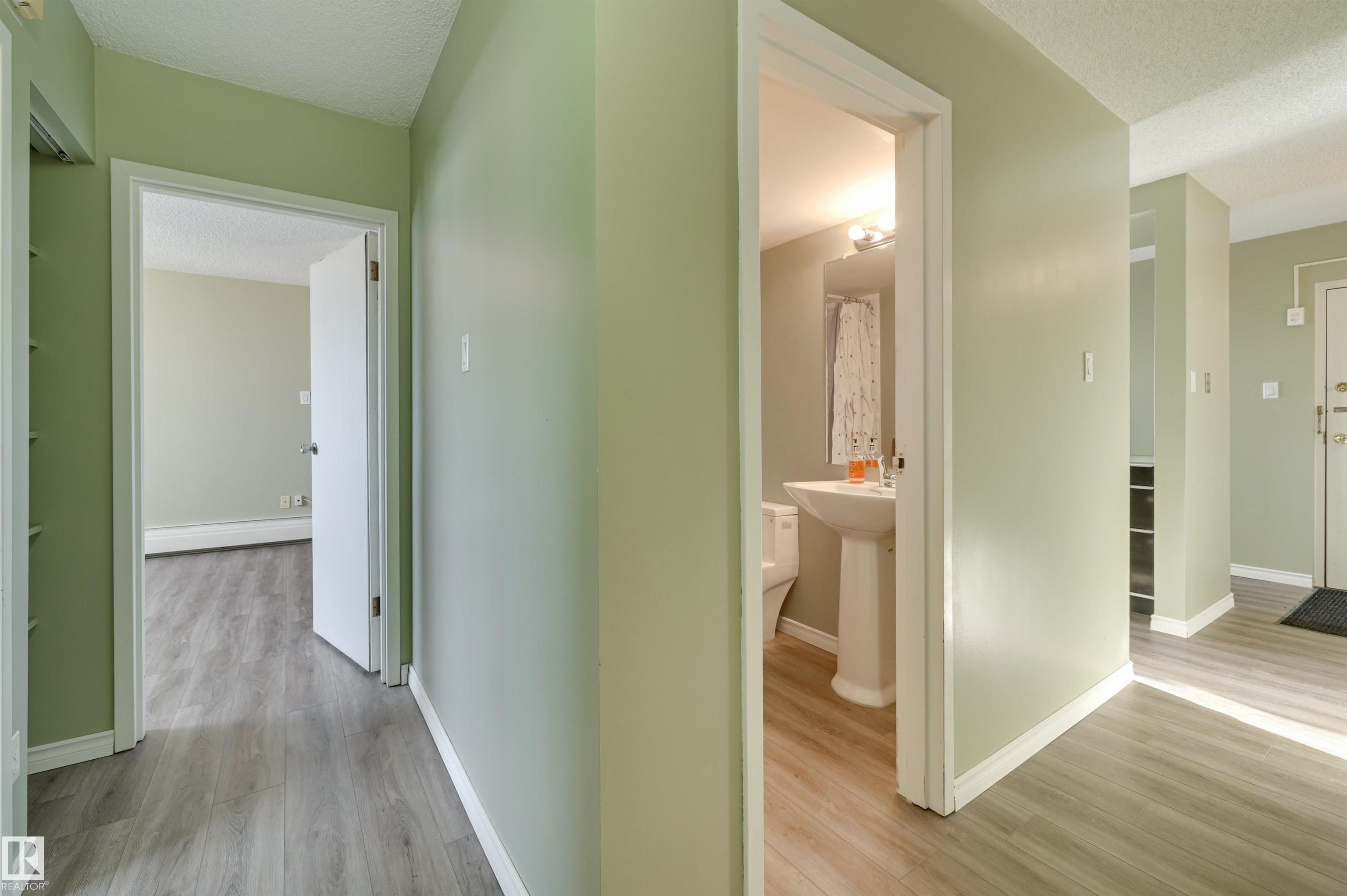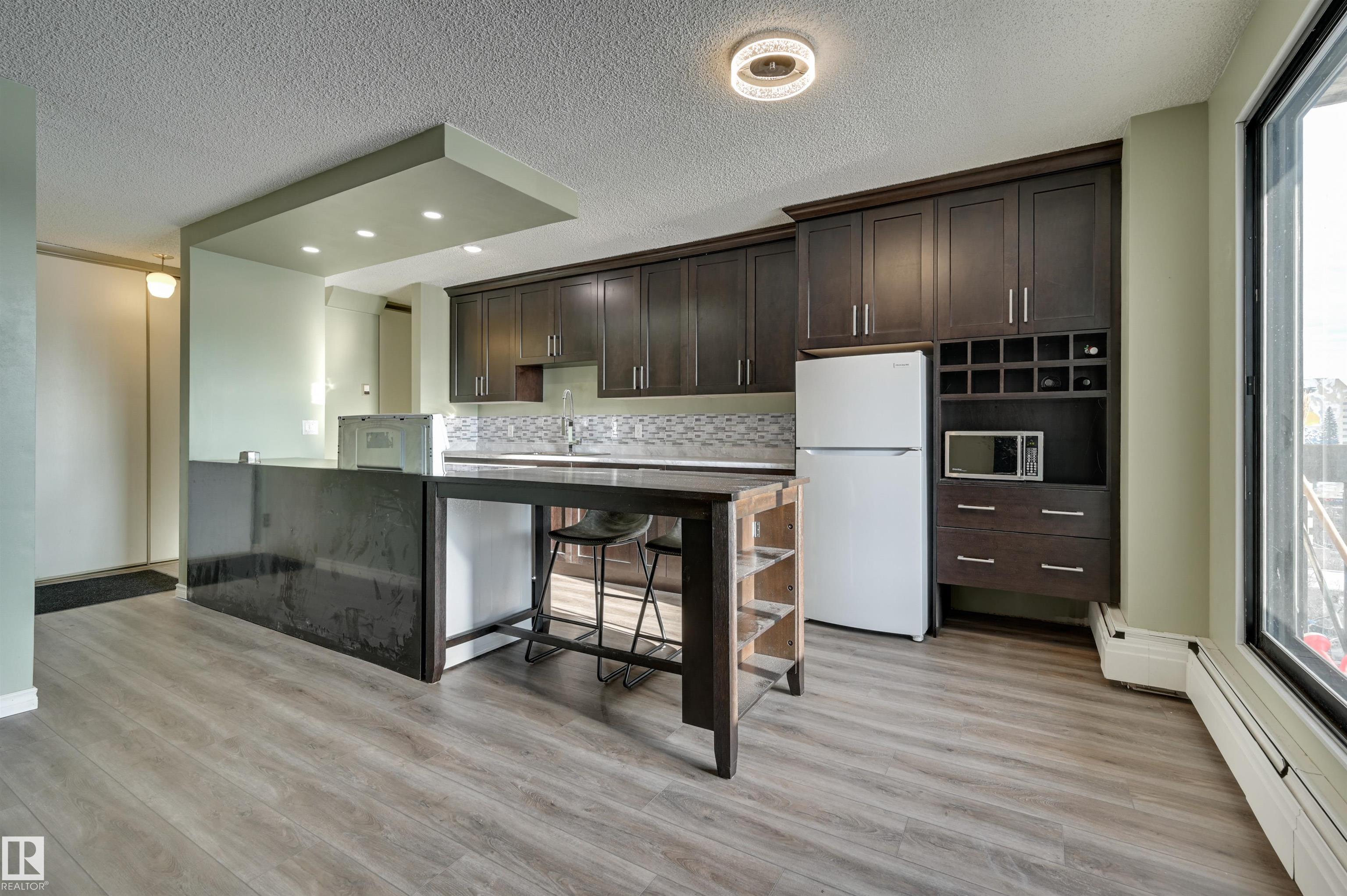 Welcome home to this SOUTHEAST FACING, RENOVATED, TOP FLOOR condo in B & H TOWERS conveniently located close to transportation, restaurants, coffee shops, shopping, the river valley/walking trails, MacEwan University & quick access to the U of A, Brewery & ICE Districts. This OPEN CONCEPT, BRIGHT condo has a gourmet kitchen with an oversize island with room for an eating area & an area for preparing your meals. This upgraded kitchen has Kitchen Craft espresso color cabinetry with soft close cupboards & drawers with lots of room for storage. The spacious living room can be split into two separate rooms because of the abundance of space. The sunny, south balcony can be your garden oasis with all the light. The 2nd bedroom & primary suite have views of Downtown. There is a sink in the primary suite for convenience. 4 piece main bathroom with a new toilet, pedestal sink & tub surround. Luxury vinyl plank flooring throughout & new baseboards. INSUITE LAUNDRY. Shows very well.