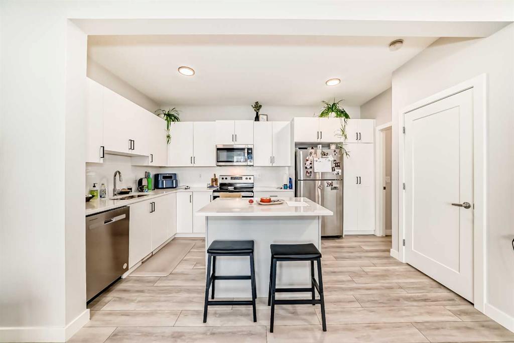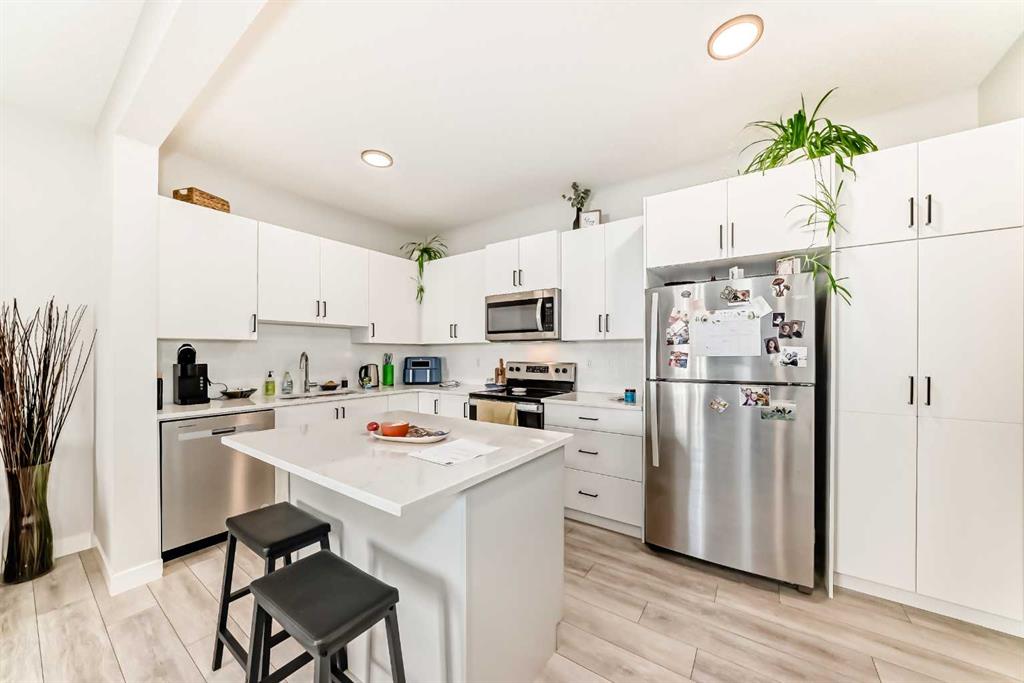 Welcome to your new 2-story townhouse nestled in the exclusive community of Tuscany. This upgraded unit with central air offers a bit of tranquility and convenience. The main living space boasts extra cabinets in the kitchen, complemented by upgraded sleek quartz countertops, an island and stainless steel appliances. An additional powder room has been added for your guests convenience, luxury vinyl flooring adds a touch of elegance. The upper level features a generously sized second room and convenient laundry with front load washer, dryer, along with a large main bathroom. Retreat to the master bedroom, complete with a large walkin closet and ensuite with; a walk-in shower, roller blinds on every window, including blackout blinds in the bedrooms. Out front you will find a private patio, with a gas bbq line to enjoy on summer nights. Located close to all amenities, including Crowchild Trail and Stony Trail, this townhouse offers both comfort and accessibility. Don’t miss the opportunity to make this your new home sweet home.