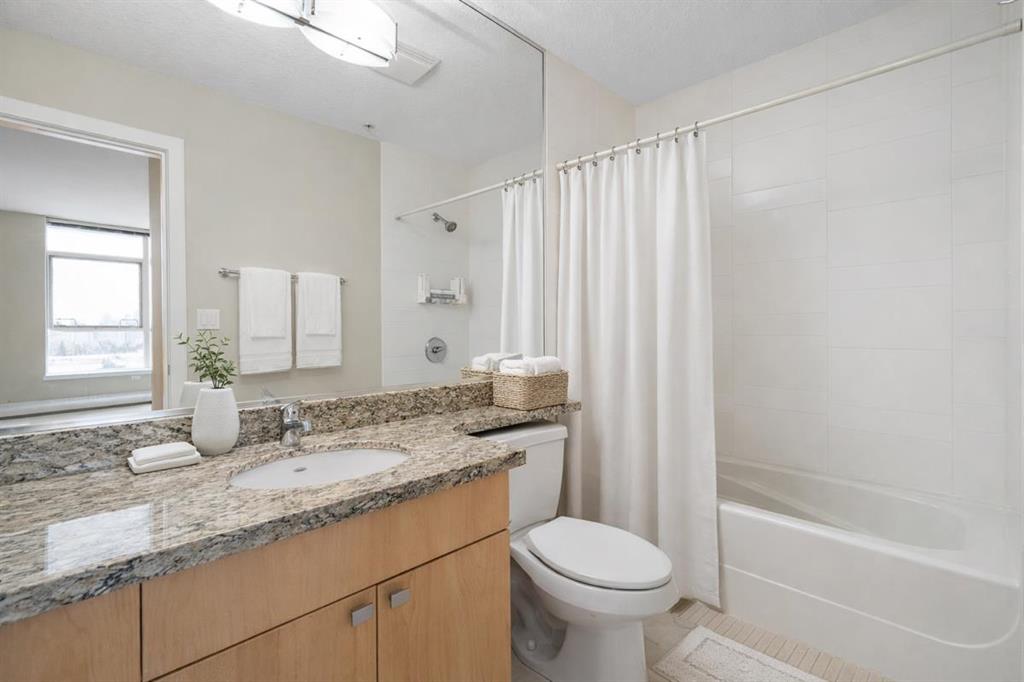 Welcome to Encore at Westgate Park, a well-managed concrete high-rise condo offering panoramic east-facing views of downtown Calgary and Shaganappi Golf Course. This 2 bedroom, 2 bathroom condo combines space, light, privacy, and unbeatable west-side convenience—perfect for professionals, downsizers, or investors seeking a view-oriented home in a highly connected location. The thoughtfully designed layout features 9-foot ceilings and large windows that flood the home with natural light throughout the day. The open-concept living area is anchored by a cozy gas fireplace and flows seamlessly into the kitchen, which offers granite countertops, a large centre island, and ample cabinet space—ideal for entertaining or everyday living. Steam-cleaned carpets and a well-maintained interior makes this property move-in-ready. The primary bedroom is generously sized and includes a massive walk-in closet and a private 4-piece ensuite bathroom. The second bedroom offers excellent flexibility and works beautifully as a roommate space, home office, study, or creative retreat. A second full bathroom and in-suite laundry add everyday convenience. Air conditioning ensures year-round comfort. This home includes titled underground parking and a separate, secure storage locker located in a locked room—keeping belongings clean, dust-free, and more secure. Pet-friendly building (with board approval). The solid concrete construction provides superior sound insulation, offering a quieter living experience with minimal noise transfer. Residents enjoy resort-style amenities including a large indoor swimming pool, hot tub, fully equipped fitness centre, games and recreation room with pool table and table tennis, bike storage, bookable conference rooms, and 24-hour on-site security. Ample underground visitor parking adds extra convenience for guests. Condo fees include all utilities except electricity, offering excellent value and predictable monthly costs. Located in one of Calgary’s most connected west-side locations, the Westbrook LRT station is just steps away, providing quick access to downtown. Westbrook Mall is connected via skywalk, offering direct indoor access to Walmart, Safeway, dining, and everyday services. Shaganappi Golf Course is next door, while the Bow River pathway system, Edworthy Park, and Douglas Fir Trail are minutes away. Easy access to Bow Trail, Sarcee Trail, and the Trans-Canada Highway puts the mountains within reach. A rare opportunity to own a quiet, concrete condo with views, amenities, and unmatched transit access at Encore Westgate Park.