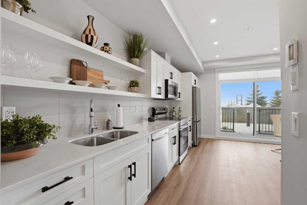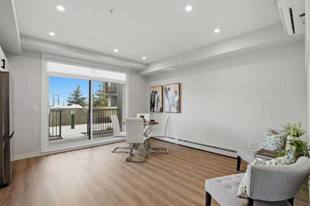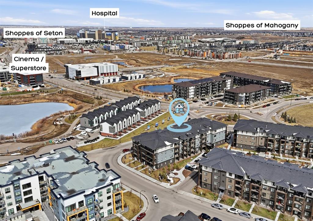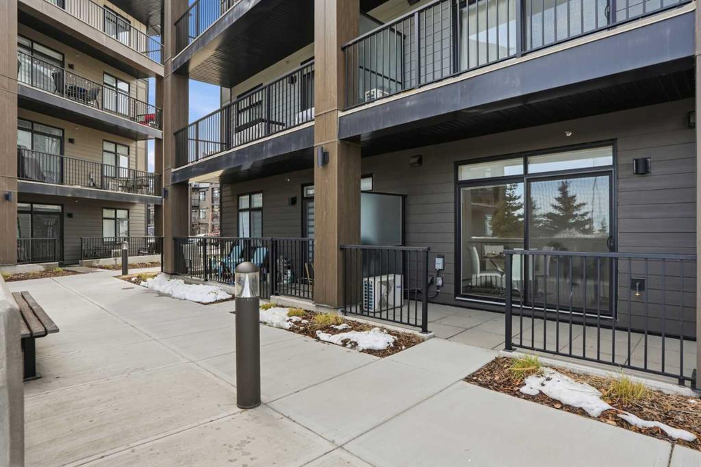 This is THE ONE! - 1 bed 1 bath on the 1st floor. | TOP 10 FEATURES: .1. 9' Ceilings .2. Dogs/Cats Allowed .3. Smart Vibrant Finishes & Design .4. Upgraded unit .5. A/C & Air Recirculation .6. 1 Titled Parking Stall (exterior) .7. Walk-Out to Grade/Courtyard .8. Quiet - Sound Attenuation .9. Convenient walk to Grocery, Restaurants, Shopping , Work, Transit, Greenspace .10. Life Simplified. | *****Welcome to Unit 1102 at 200 Seton Circle SE—a stylish upgraded 500 Sq Ft, 1 bedroom, 1 bathroom condo designed for simplicity, comfort, and connection. Perfectly positioned on the main floor, this home offers true walk-out living to a spacious courtyard, making it ideal for pet owners, retirees, or anyone who values easy access and low-maintenance living. Step inside and you’ll immediately notice the 9’ ceilings and the light, airy feel, enhanced by a smart, open-concept layout that maximizes both space and function. The large functional kitchen is a standout feature within the central living area, showcasing higher end cabinetry, quartz countertops, stainless steel appliances, and modern open shelving that adds both style and practicality. It grounds the the dining and living area, where large patio doors allow ample natural light and create a smooth transition to your personal outdoor patio and outdoor space. The oversized bedroom offers a calm and comfortable retreat, while the sleek 4-piece bathroom and convenient in-suite laundry complete the home. This upgraded unit also includes air conditioning and air recirculation for year-round comfort, along with Logel Homes’ Acoustic Shield system that enhances sound attenuation for a quieter living experience. You’ll also have a titled exterior parking stall, and the building is pet-friendly, allowing up to two pets with board approval. For dog owners, the lifestyle here is unmatched—simply walk out your door and head across the street to the off-leash park, or enjoy the enclosed dog run within the central courtyard. Located in the heart of Seton, you’re just steps from Market Street amenities including cafes, restaurants, grocery stores, fitness facilities, and more. The nearby South Health Campus, transit options, greenspaces and walking paths make this an incredibly convenient and connected place to live. Rentals are allowed (no short-term hotel style), making this a flexible option for both homeowners and investors. Whether you’re a retiree looking to right size, a working professional wanting a short commute, or a buyer seeking modern, low-maintenance living in a walkable community, this home delivers on every level. Life is simply easier here—book your private showing today and experience why this is THE ONE.