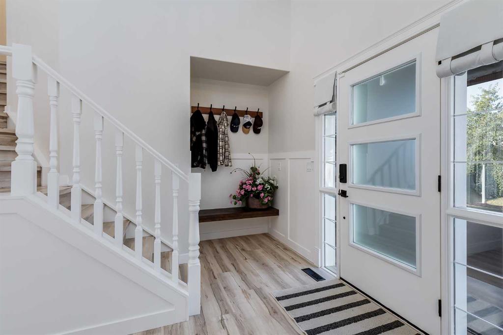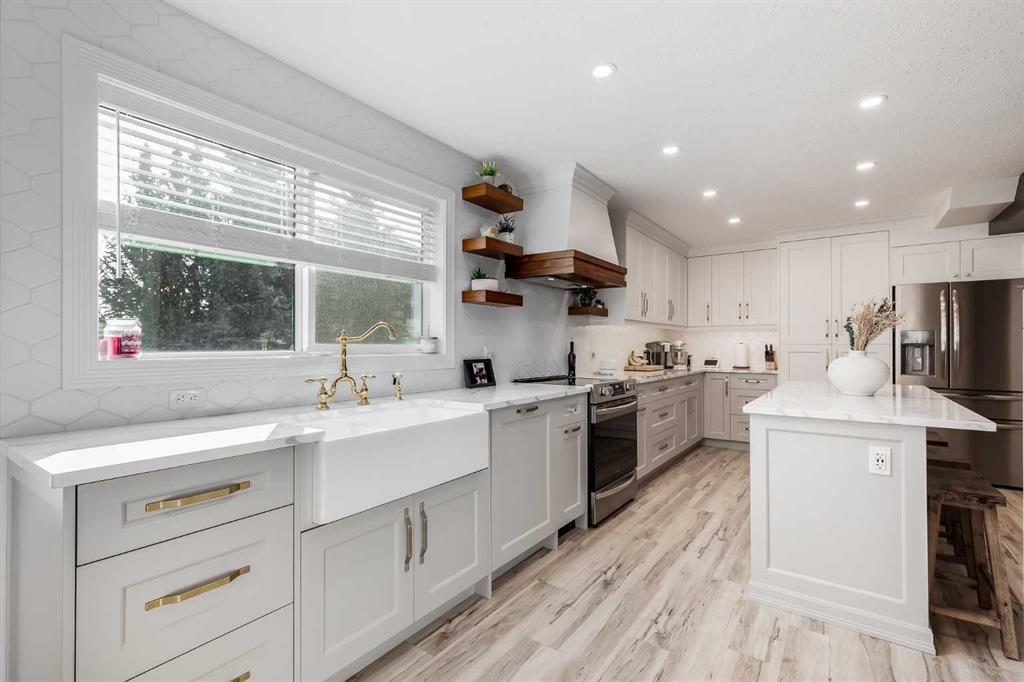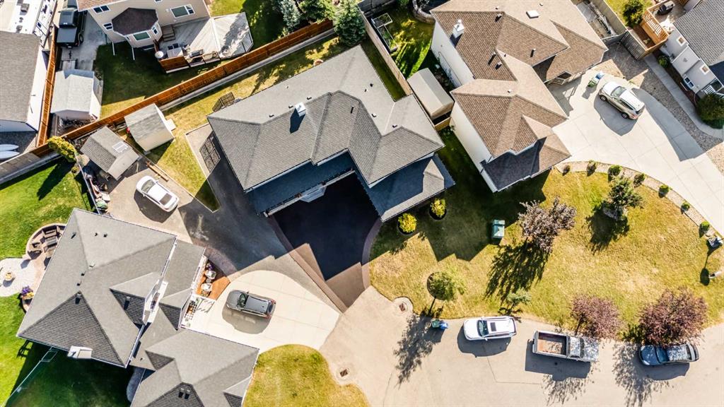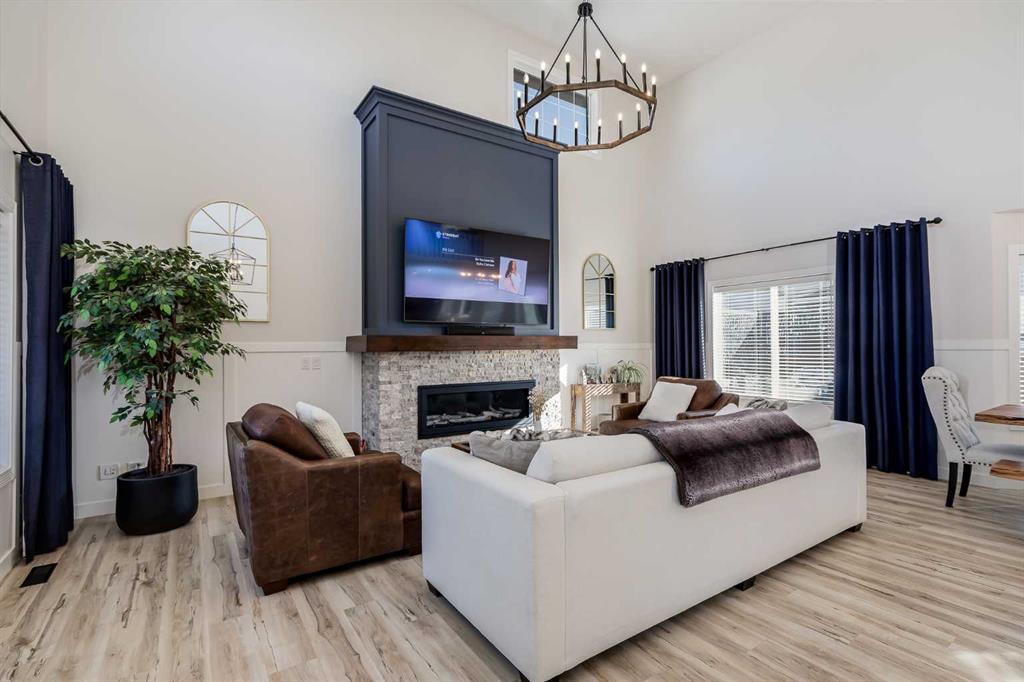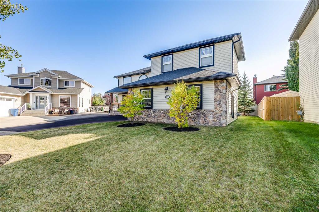 Stunningly renovated with high-end finishes throughout, this gorgeous home sits on an extra-wide pie-shaped lot at the end of a quiet cul-de-sac, just steps from Airdrie’s scenic canals. An expansive front porch sets the tone, creating a welcoming spot for morning coffee or evening relaxation watching the sunset. Inside, soaring ceilings in the living room draw the eye upward, anchored by a striking stone-surround fireplace that invites you to unwind. Extra windows flood the open floor plan with natural light, highlighting the updated flooring, designer details and neutral colour palette. The heart of the home is the outstanding chef’s kitchen, thoughtfully appointed with upgraded stainless steel appliances, full-height cabinetry, stone countertops, modern finishes and a large walk-in pantry. A central island with casual seating and an adjacent breakfast nook with patio doors make everyday living seamless, while a separate dining space with built-in serving bar is ideal for entertaining. Upstairs, a lofted flex area provides the perfect home office or study space. The elegant primary retreat includes a massive custom walk-in closet and a spa-like ensuite with dual sinks, refined finishes and an oversized multi-head shower. Two additional bedrooms and a full bath complete this level. The finished basement extends your living space with a huge recreation room, including areas for media, games and a built-in bar for convenient refreshment and snack refills. Outdoors, the backyard is designed for both play and leisure, featuring a large deck with privacy screen, a built-in firepit for endless summer nights roasting marshmallows and a wide grassy area for kids and pets to play. Parking is plentiful with a double attached insulated side-profile garage, plus an extended driveway with space for an RV or boat. The location is exceptional, offering effortless access to Airdrie’s canals with 6 km of pathways for year-round recreation including kayaking, skating and wildlife watching. Nearby Chinook Winds Park provides playgrounds, spray park, skate park, sports courts and seasonal concessions, while golf, schools, shopping and every city amenity are close at hand. This home perfectly blends upscale design with family-friendly function in a sought-after neighbourhood surrounded by natural beauty!