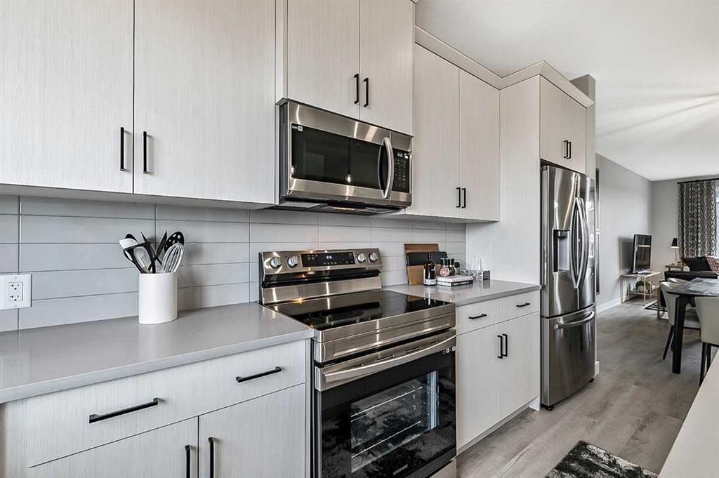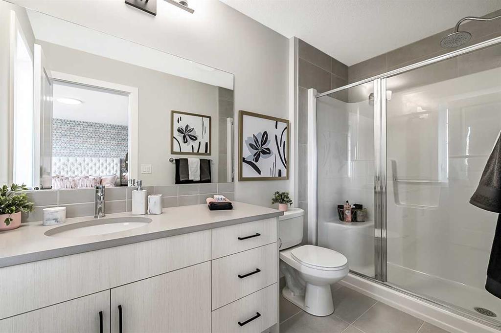 This 1,700 sq ft townhome in Vermilion Hill offers a balanced combination of space, function, and location. Designed with modern finishes and a double detached garage, the home features an open-concept main floor with high ceilings and large windows for natural light. The entryway includes built-in storage and connects to a kitchen equipped with stainless steel appliances, quartz countertops, and a central island. The upper level includes a primary bedroom with a walk-in closet and ensuite, two additional bedrooms, and a loft providing flexible living options. The property is situated approximately 20 minutes from downtown Calgary and within minutes of major amenities such as Costco. Mountain and downtown views contribute to the appeal of the area, which is known for its accessibility and new community design. Renderings and photos are representative.
