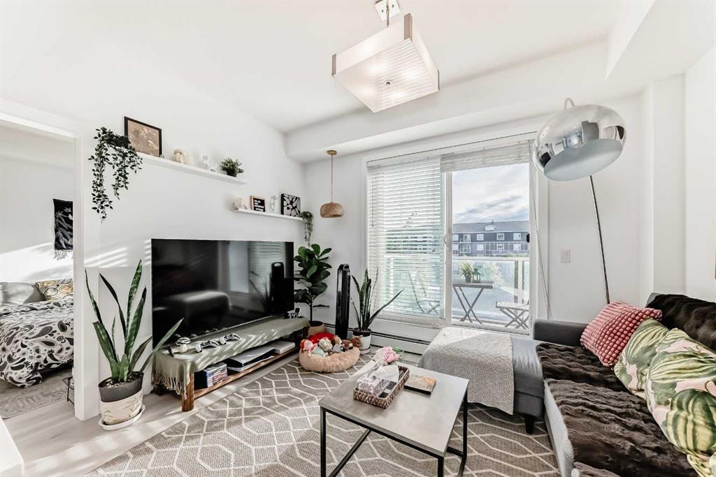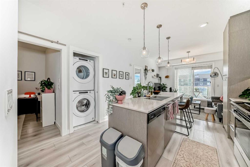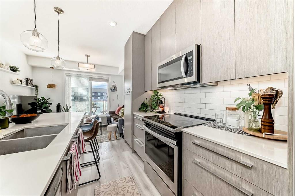 Welcome to the Legends of Cornerstone, where thoughtful design, premium amenities, and a prime northeast location combine to offer an unparalleled lifestyle. This stunning suite is a true gem, showcasing modern elegance and functionality. Step into the inviting foyer and be greeted by beautifully appointed interiors bathed in natural light. The heart of this home is the showstopping kitchen, featuring floor-to-ceiling contemporary cabinetry with integrated storage, sleek quartz countertops, an undermount single sink, and a versatile cutlery drawer. Soft-close cabinetry, a spacious pantry, and high-end energy-efficient integrated appliances elevate the culinary experience. The bright and open living area is perfect for showcasing your finest furniture, flowing seamlessly onto a covered balcony with breathtaking blue sky views and a BBQ gas line, ideal for enjoying Calgary’s beautiful weather year-round. Retreat to the primary bedroom, where east-facing windows welcome stunning sunrises. Complete with a walk-in closet and a luxurious 4-piece ensuite, the contemporary finishes and upgraded fixtures create a spa-like atmosphere for ultimate relaxation. Enjoy exclusive amenities, including: Owners Lounge: Perfect for hosting large gatherings, with comfortable seating, entertainment, and billiards. Fitness Centre: Stay active with on-site cardiovascular and strength training equipment. Community Garden: Cultivate your own produce in a private garden, enhancing your health and lifestyle. Don’t miss your chance to own this exceptional home in the vibrant Legends of Cornerstone community. Schedule a viewing today!
