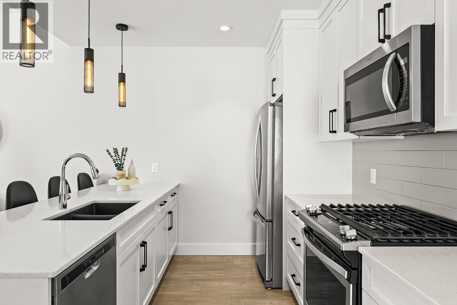 Modern half duplex living in North Glenmore – with NO STRATA! Completed in 2020, this 3 bedroom + flex / 2.5 bath home blends style, comfort, and functionality. The main level showcases bright, open spaces with large windows, a sleek gas range, soft-close cabinetry, and an oversized quartz island that naturally becomes the heart of the home. Upstairs, the primary retreat impresses with a spacious ensuite featuring dual sinks and quartz counters, plus a generous walk-in closet. Two additional bedrooms enjoy great natural light, while the versatile flex space can easily serve as a home office, gym, or media room. The fenced backyard offers privacy and plenty of room for kids and pets to play—without restrictions while you enjoy the mountain views. Designed for today’s busy lifestyles, this home also includes excellent storage solutions, a convenient upper-floor laundry, and ample parking with space for up to 5 vehicles. Tucked into a friendly North Glenmore neighbourhood, you’ll love the easy access to schools, shopping, parks, and transit. A rare, move-in ready opportunity in a sought-after location!