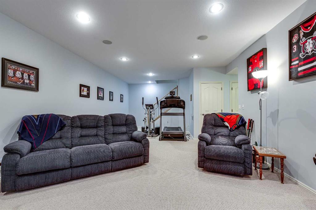 Welcome to this exceptional Canada West–built 2-storey home, perfectly situated on a quiet close in the highly sought-after Aspen Ridge neighbourhood. Surrounded by schools, shopping, and an abundance of parks and trail systems, this location offers the ideal balance of convenience and tranquility. Step inside to a grand foyer that immediately impresses with open sightlines to the main living area and a stunning custom staircase leading to the upper level. The chef-inspired kitchen is sure to impress with its quartz countertops, raised maple cabinetry, full tile backsplash, corner pantry, raised eating bar, and premium stainless-steel appliances—including a gas range. The spacious living room exudes warmth and style, featuring oversized windows, an elegant natural gas fireplace with a stone surround and mantle, and built-in wall speakers for the ultimate entertaining experience. The adjoining dining area offers seamless flow between the kitchen and living spaces, perfect for family gatherings or hosting guests. A main floor office (or potential bedroom), convenient 2-piece powder room, and well-appointed laundry room complete the main level. Upstairs, the thoughtful design continues with three generous bedrooms and two full bathrooms. The luxurious primary suite is a true retreat—complete with a large bedroom, private den or office space, spa-inspired 4-piece ensuite featuring an air-jetted tub, separate shower, makeup vanity, and an expansive walk-in closet. The fully finished basement is built for entertaining, showcasing a massive family large bedroom, a 4-piece bathroom, and a custom home theatre room—perfect for cozy family movie nights. Not to be overlooked, the oversized heated garage is a dream for any hobbyist, featuring epoxy flooring, a floor drain, and plenty of built-in storage. Step outside and enjoy your private east-facing backyard oasis with a covered deck (including a natural gas BBQ line), lower patio, mature trees, and a handy storage shed. Additional features include operational in-floor heating, central air conditioning, and central vacuum system. This meticulously maintained home offers the perfect blend of comfort, elegance, and functionality—an exceptional opportunity in one of Red Deer’s most desirable communities.