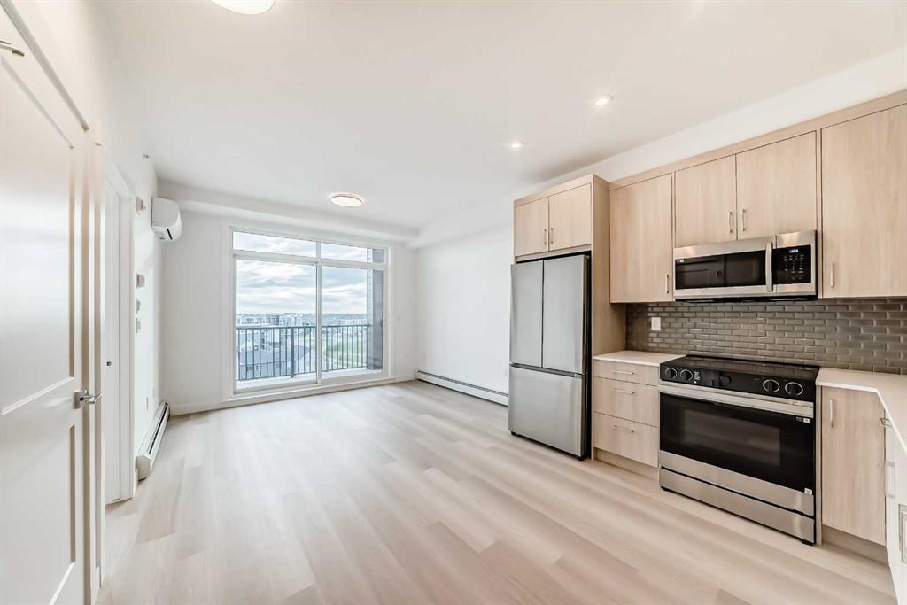 Welcome to the Curnoe 2 by Logel Homes—a well-designed unit featuring cabinets with full-height fronts, quartz countertops, and luxury vinyl plank flooring throughout, with tile in the bathroom. The upgraded kitchen includes a modern backsplash, premium sink and faucet, and comes with stainless steel appliances. Enjoy year-round comfort with air conditioning, plus the convenience of an in-suite washer and dryer. Nine-foot ceilings and large windows provide plenty of natural light. This home includes a titled parking stall and is backed by the Alberta New Home Warranty. Located close to shopping, public transit, and major routes like Crowchild and Stoney Trail, it offers easy access across the city. With affordable condominium fees, this is a great opportunity to own a well-appointed home in a convenient location.