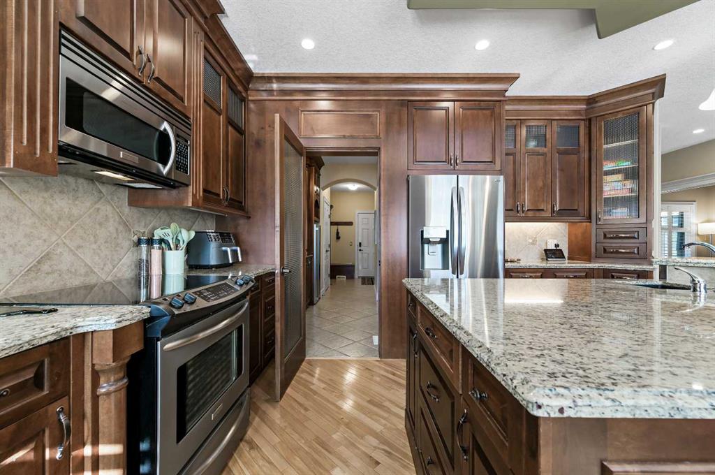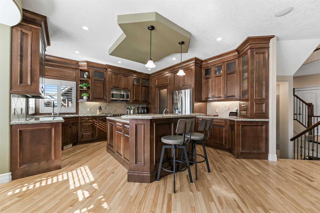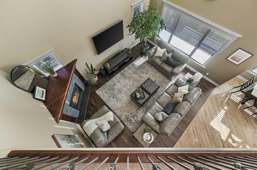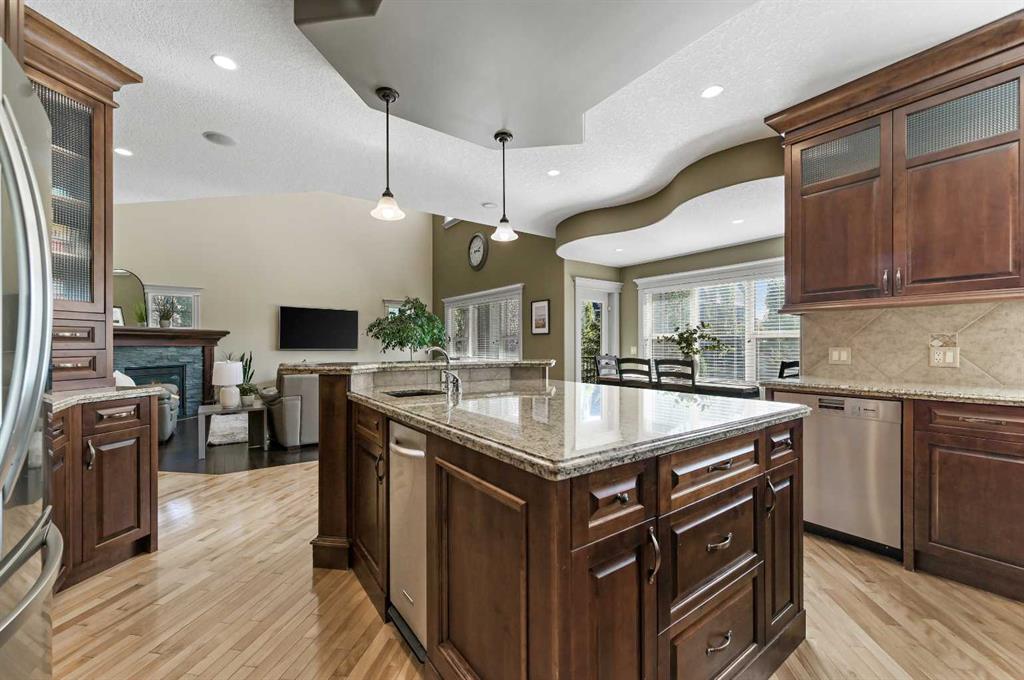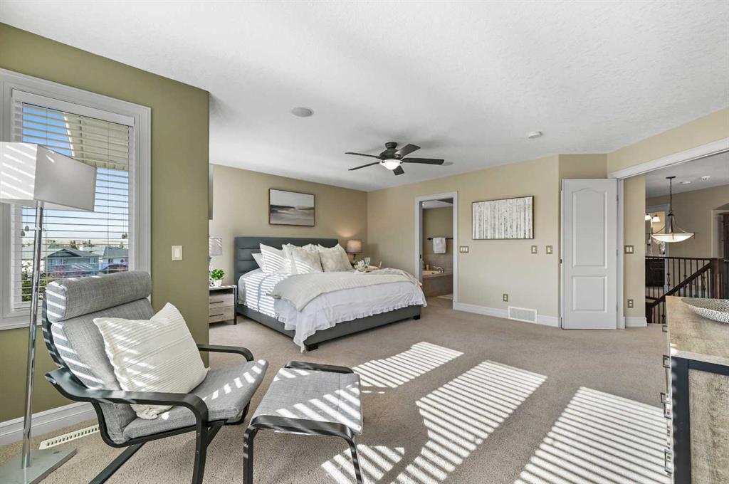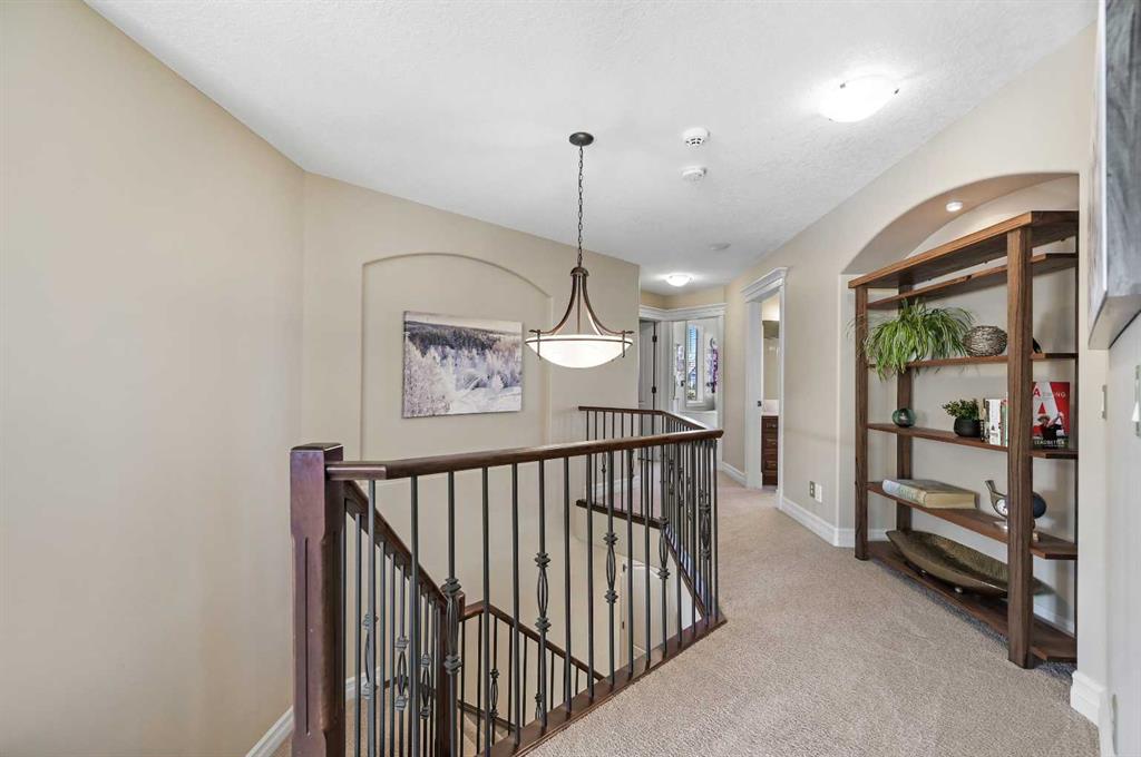 Executive Walkout Home in Coopers Crossing! Discover a home designed for both family living and entertaining in this highly sought-after community, perfectly positioned on a quiet cul-de-sac and backing directly onto walking paths and green space enjoying a sunny south exposure. This executive walkout property offers a rare combination of privacy, functionality, and luxury upgrades throughout. The open concept main floor features soaring ceilings, maple hardwood flooring, a gourmet kitchen, butler’s pantry, gas fireplace, and central A/C. The living room is anchored by dramatic floor-to-ceiling windows extending to the upper level, flooding the space with natural light. The kitchen is as functional as it is stylish, with granite counters, stainless steel appliances, a large center island, and a walk-through butler’s pantry for added storage. The dining area, surrounded by southwest exposed windows, opens to a large rear deck which is perfect for hosting or enjoying tranquil views of the park. A private den/home office and mudroom complete this level. Upstairs, a sweeping curved staircase leads to the luxurious primary retreat, featuring a spa-inspired 5-piece ensuite and a custom walk-in closet. This level also includes two generous bedrooms, a full bathroom, and a convenient upper floor laundry room. The fully developed walkout level expands the living space with a spacious rec room, corner fireplace, games area, wet bar, full bathroom, and an additional bedroom. Step outside and you’ll find a beautifully landscaped southwest-facing backyard (complete with irrigation system) offering sun-filled afternoons, privacy, and direct access to pathways and green space. A covered hot tub area adds the perfect spot to unwind year-round. Additional highlights include a heated double garage, fully finished with insulation, drywall, and epoxy flooring. Beautifully maintained, this home reflects exceptional pride of ownership and is sure to impress. Book your private showing today and experience all that Coopers Crossing has to offer.