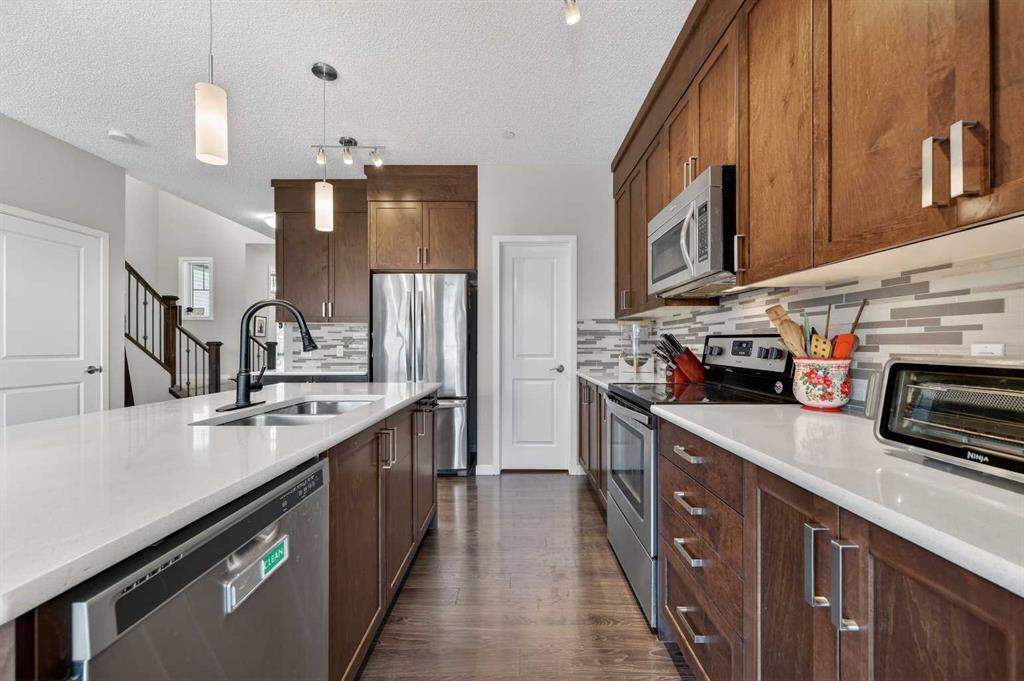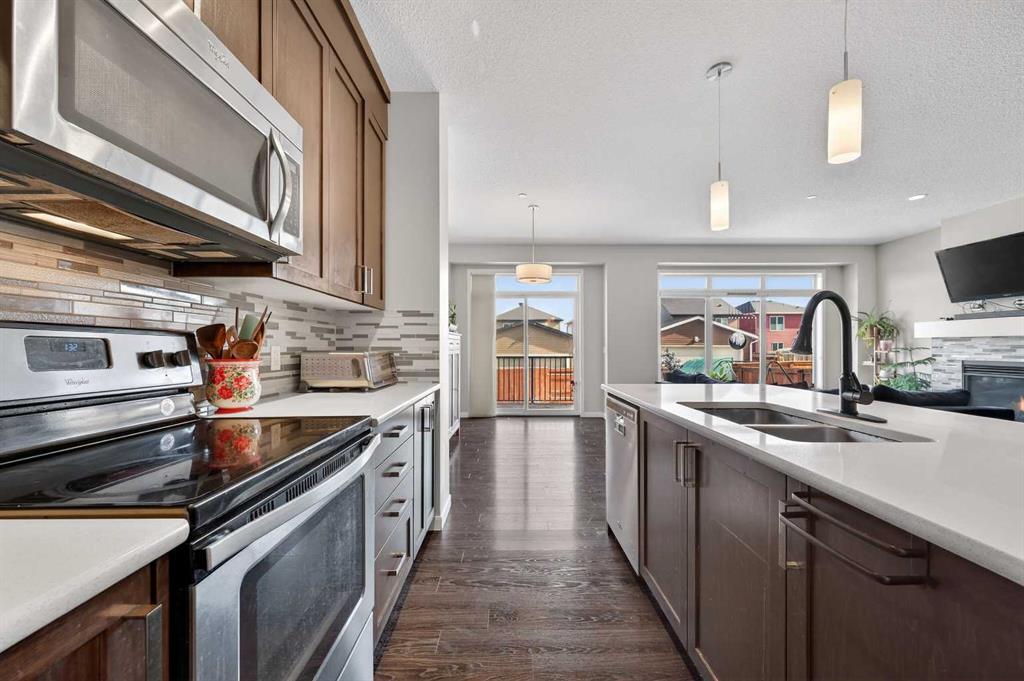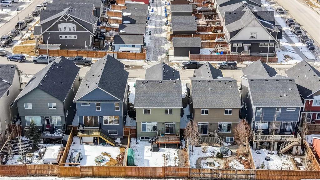 This very well maintained Cochrane 2-storey home in family-friendly Fireside offers over 2,066 square feet of functional above-grade living space designed for modern comfort. Built in 2016, your next home features a smart layout and numerous builder upgrades throughout. The open-concept main floor is anchored by 9-foot ceilings and large windows that fill the space with natural light. The kitchen is a chef’s dream, featuring quartz countertops, a massive island with a breakfast bar, stainless appliances, and a walk-through pantry for effortless organization. Adjacent to the kitchen, the spacious living room is centered around a cozy fireplace and flows seamlessly into the dining area. From here, step out onto the elevated deck to enjoy summer barbecues in the large, fully fenced backyard. A well-appointed mudroom and a 2-piece powder room complete the main level. Upstairs, the family retreat begins with a generous central bonus room that provides a versatile space for a home office, media area, or playroom. The west-facing primary bedroom is a true standout, offering mountain views, a large walk-in closet, and generous 5-piece ensuite with double vanities and a soaking tub. Two additional large bedrooms, a central 4-piece bathroom, plus a dedicated laundry room ensure convenience for the whole family. The undeveloped basement with 8-foot ceilings offers nearly 900 square feet of additional potential for a future recreation room, gym, or guest suite. Practical features include an insulated double attached garage.. Located close to schools, parks, and shopping with easy access to the walking trails and nature that Cochrane is known for. This home is move-in ready and perfectly positioned for your family's next chapter.