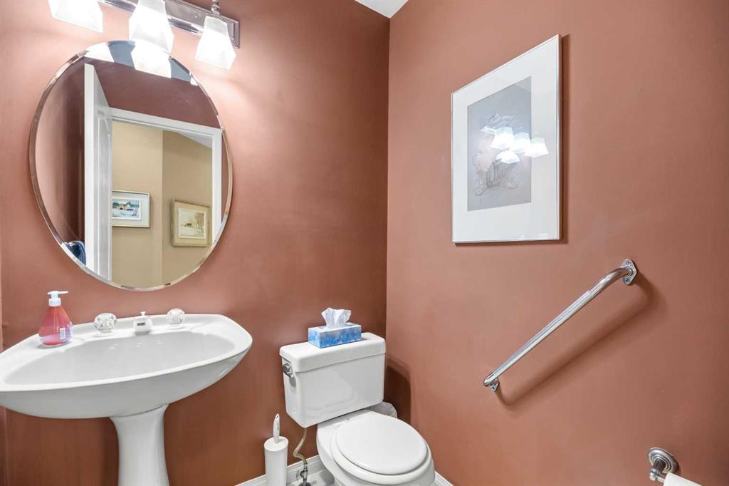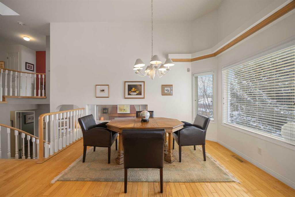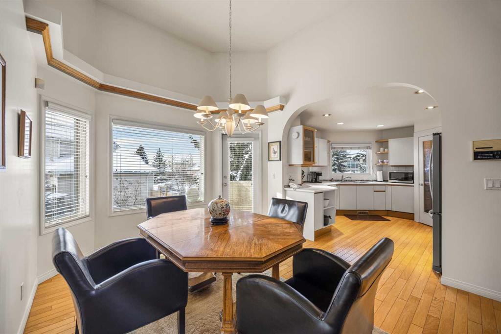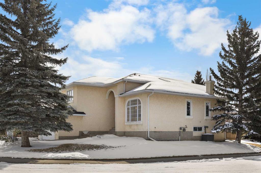 Former show home in prestigious Nirvana Point Estates! Welcome to this impressive 4-level split home on a spacious corner lot in the sought-after community of Hawkwood, offering 3 bedrooms, 2.5 baths, and 2,353 sq ft of bright, well-designed living space. Step inside and be greeted by a dramatic 12'5" foyer with hardwood flooring extending throughout most of the main living area. A stunning skylight at the highest point and centre of the home floods the space with natural light, creating a bright and inviting atmosphere. To your right, the spacious 13'9" vaulted ceiling Living room offers an elegant space for relaxation and entertaining. The formal Dining room also features soaring vaulted ceilings, perfect for hosting memorable gatherings. The well-sized Breakfast nook flows seamlessly into the Sanidero Italian euro-style white Kitchen, complete with newer refrigerator, Bosch dishwasher, and corner pantry for ample storage. Walk down a few steps to the lower level, where the bright Family room is anchored by a cozy gas fireplace—ideal for family movie nights and casual entertaining. This level includes a versatile Den with built-in desk perfect for a home office, a Laundry room, powder room, and an oversized double attached garage. Step through the patio door to your sunny South-facing backyard—a private retreat with mature trees and landscaping on this generous 6,700 sq ft corner lot. Stairs from the backyard provide convenient access back to the Breakfast nook. On the upper level, the spacious and sunny Primary bedroom offers a peaceful retreat with a walk-in closet and 5-piece ensuite bath featuring double vanity, jetted tub, and separate shower. Two additional well-sized bedrooms share a 4-piece bath. The unfinished basement with 3 windows offers excellent potential for future development, providing additional living space to suit your needs. Recent updates and premium features include a roof updated with durable Euroshield tile, furnace (still partially under warranty), water softener, air conditioning (under partial warranty), newer washer and dryer, and updated eavestroughs and garage door (3 years old). Located in the prestigious Nirvana Point Estates within Hawkwood, this home is within walking distance to schools and close to parks, shopping, transit, Nose Hill Park, and major routes including Crowchild Trail and Stoney Trail. This is a rare opportunity to own a meticulously maintained former show home in one of Calgary's most desirable Northwest communities!