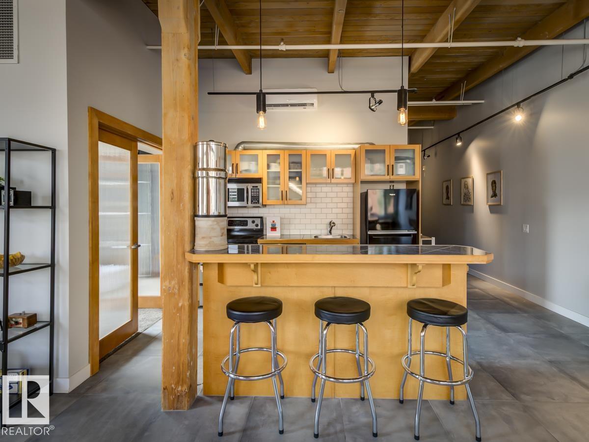Step into one of Edmonton’s rarest lofts: a top-floor, corner residence in the iconic 1929 John Deere Warehouse, reimagined by DUB Architects as Seventh Street Lofts. This 945 sq ft space delivers true loft living with soaring 13-ft fir-beam ceilings, exposed brick, rare and expansive south- and east-facing windows flooding the loft with natural light. Industrial meets modern with imported porcelain tile, fresh paint, a sleek renovated 4-piece bath, and brand-new A/C. The open kitchen, with stainless appliances and a generous island—is made for hosting, while the private bedroom and full wardrobe keep life effortless. Flexible, bold, and unapologetically different, this loft adapts to your lifestyle. In-suite laundry, parking, and Airbnb-friendly bylaws offer flexibility. Steps to the Ice District, MacEwan, cafés, markets, nightlife, and the future LRT—this isn’t just a home, it’s a piece of Edmonton history you can live in