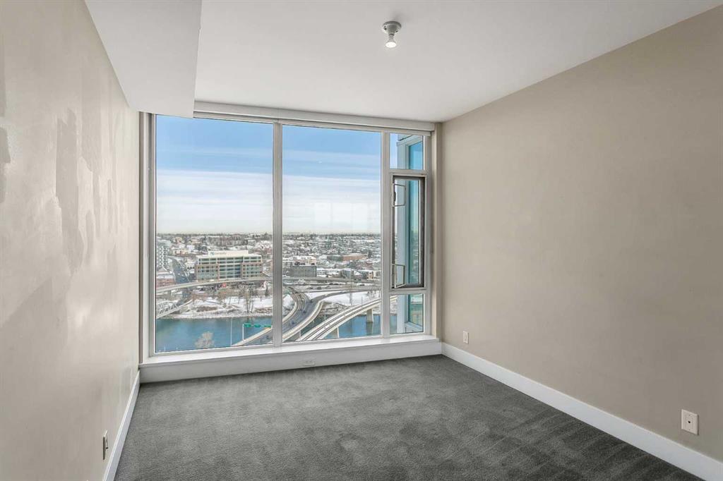 Welcome to the 21st floor of Evolution, where elevated living meets modern design in the heart of the city. This spacious 1,121 sqft unit offers a functional layout with a versatile front den that is perfect for a home office or flex space and the convenience of in-suite laundry. The kitchen is thoughtfully designed with granite countertops and a full-height granite backsplash, under-cabinet lighting, two-toned cabinetry, and a eating bar. The dining area is bathed in natural light, while the expansive living room offers flexibility to accommodate a variety of furniture options. Enjoy stunning northeast-facing views of the Bow River, along with breathtaking sunrises that fill the home with natural light creating a bright and inviting atmosphere throughout the day. The primary bedroom features a walkthrough closet leading to a stunning 5-piece ensuite complete with heated floors, dual sinks, granite countertops, a soaker tub, and a 10mm glass shower. The second bedroom is generously sized with ample closet space, and the additional 3-piece bathroom also includes heated floors, granite counters, and a 10mm glass shower. Residents of Evolution enjoy premium amenities located on the second floor, including a fully equipped fitness centre, sauna, party room, and rooftop patio. This unit includes one assigned underground parking stall and a storage locker.