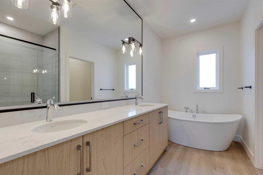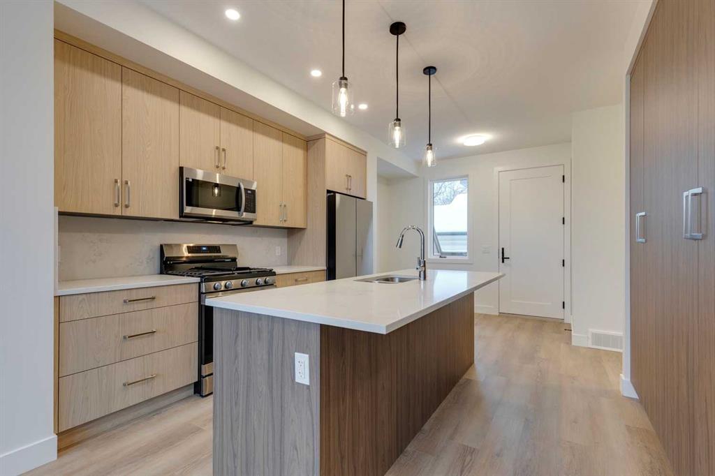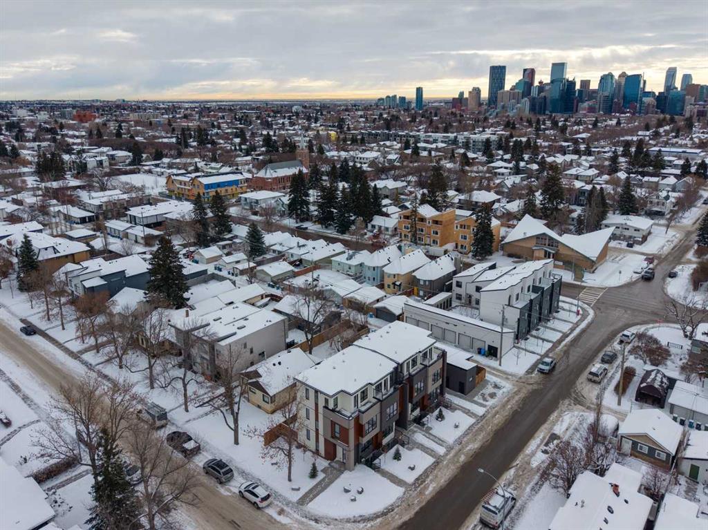 Mount Pleasant - 2124 7 Street NW: Welcome to this beautiful townhome offering 3 bedrooms, 4.5 bathrooms, a single-car garage, and over 2,100 sq ft of developed living space. Designed by respected Calgary architect John Trinh and Associates, this project showcases high-level craftsmanship, thoughtful material selection, and exceptional attention to detail throughout. The main floor features a spacious front entry, a bright living room with an electric fireplace and built-in shelving, and a central kitchen complete with stainless steel appliances, an island with seating, a pantry cupboard, and a dining area with access to the deck. A convenient two-piece powder room completes this level. The second floor offers two generously sized bedrooms, each with its own 4 pc ensuite. A well-equipped laundry room with cabinets, a sink, and a folding counter adds everyday convenience. The entire third level is dedicated to the primary retreat, featuring exclusive access to the top-floor balcony, a walk-in closet, and a luxurious five-piece ensuite with dual sinks, a soaker tub, and a walk-in shower. The fully developed basement includes a separate entrance, a spacious rec room, and a four-piece bathroom, providing additional living space and flexibility. Ideally located in the heart of Mount Pleasant, one of Calgary’s most desirable mature communities, this home offers easy access to Confederation Park, SAIT, and the University of Calgary. Enjoy a quick commute to downtown along with nearby transit routes on 4 Street, Centre Street, and 20 Avenue, plus a great selection of local restaurants and coffee shops.