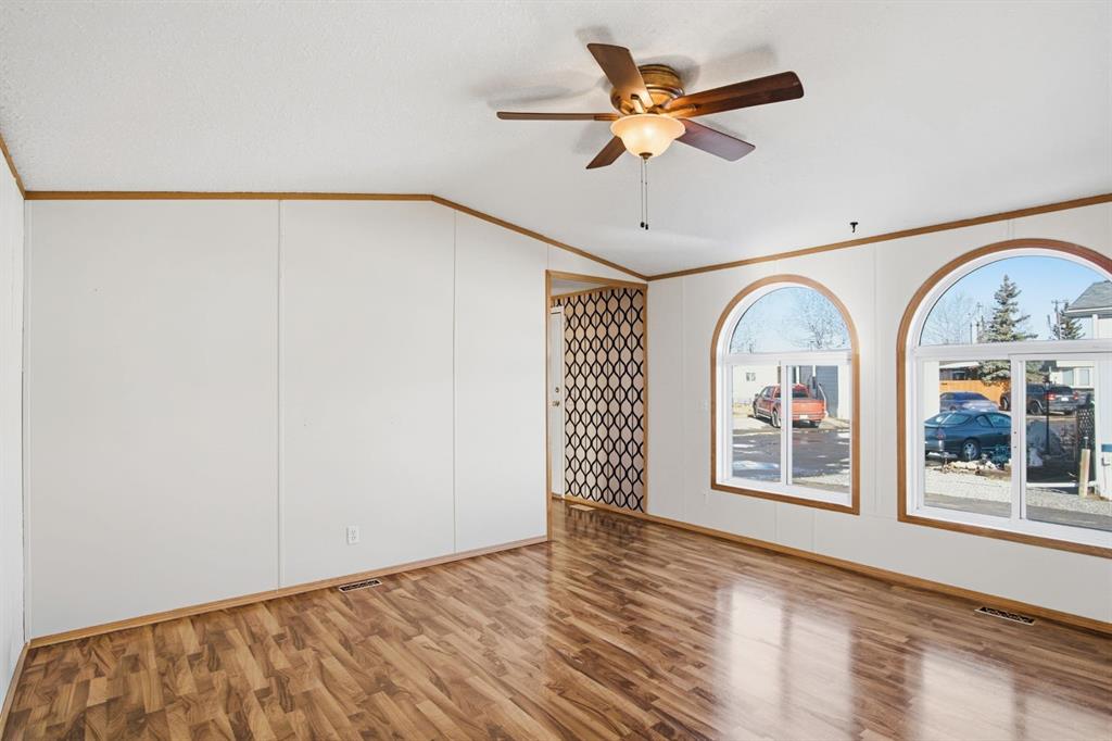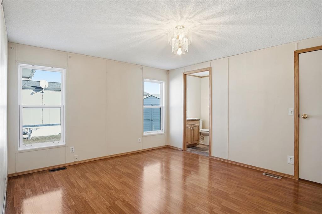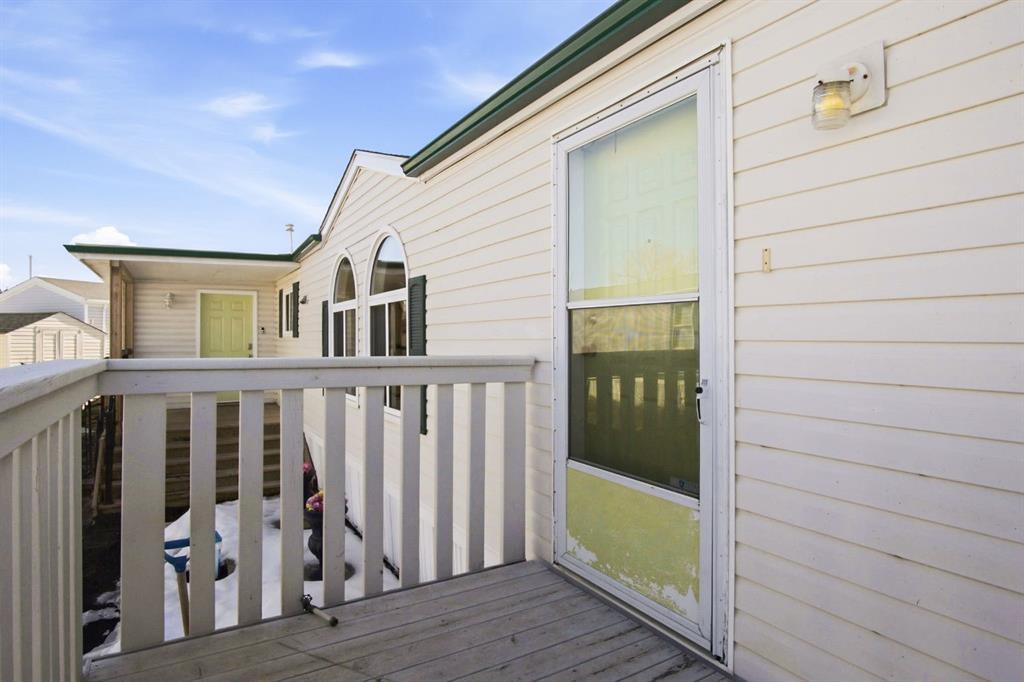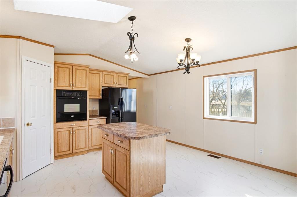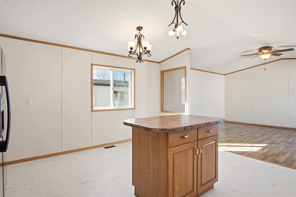 Welcome to this bright and well-maintained 3-bedroom mobile home offering over 1,190 sq ft of comfortable living space in the community of Olds. With a functional layout, great natural light, and thoughtful separation between living areas, this home is ideal for a variety of buyers. Step inside to a spacious and sun-filled living room, where large windows bring in an abundance of natural light, creating a warm and inviting atmosphere. The open-concept design flows seamlessly into the kitchen and dining area, making everyday living and entertaining effortless. The kitchen is both practical and spacious, featuring a central island, corner pantry, and plenty of cabinet and counter space to keep everything organized and within reach. Whether you're preparing meals or gathering with family, this space is designed to accommodate it all. The primary bedroom is privately situated at one end of the home, offering a quiet retreat complete with its own ensuite. On the opposite end, you’ll find two additional bedrooms and a full bathroom, providing great separation and flexibility for family, guests, or a home office setup. Additional highlights include a dedicated laundry area, durable laminate and linoleum flooring throughout, and an abundance of natural light that enhances the home’s bright and airy feel. Step outside to enjoy the rear deck perfect for relaxing or summer BBQs—along with a generously-sized yard and a convenient parking pad. Affordable, functional, and move-in ready, this is a fantastic opportunity to get into homeownership or downsize without compromise.