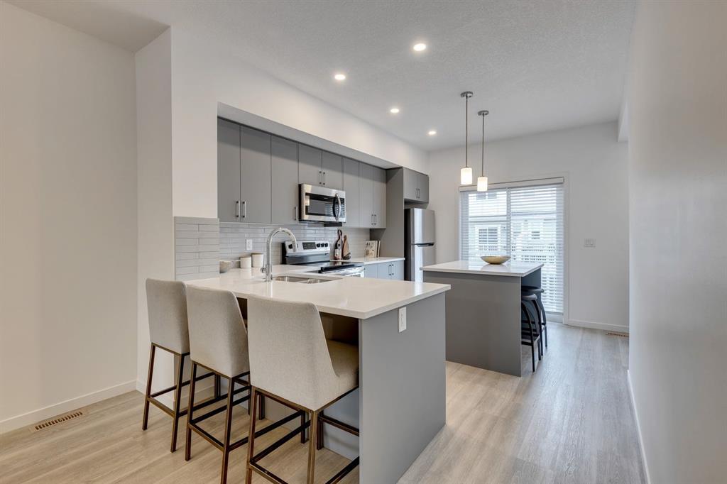 Welcome home to your bright, open concept, modern, and brand new townhouse! Located right next to a green space and close to schools and amenities, this home is perfect for a young family starting out, couple, or professional single. Beautiful townhouse with the perfect location in a newly built community. Right across from K-5 Copperfield school, playground, huge park, a block to the outdoor rink, community association, pond, and a quick drive to all amenities! Up the stairs you are greeted with an open floor plan including a bright and spacious living room, kitchen, half bath and dining room. Your brand new kitchen has a big island, stainless steel appliances, lots of counter space, and tons of cabinets, with large deck with more than enough room for patio furniture and a BBQ to enjoy the summer months coming up. The primary bedroom has generous room for a king-sized bed, as well as a walk-in closet and master ensuite with double vanity sinks. Also upstairs is your laundry room, made for convenience, two more bedrooms and another beautiful bathroom. This is a spacious and comfortable townhouse in a great neighborhood. With low condo fees, this townhome has exactly what you're looking for! Book your showing today!
