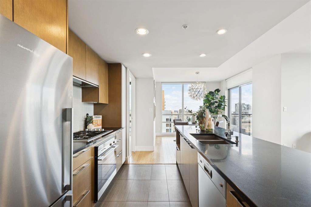 Experience elevated urban living in this stylish LUNA residence, where panoramic views stretch from the dazzling downtown skyline across North Hill, the Bow River valley, C.O.P., and out to the Rocky Mountains. Designed with one of the most sought after layouts, this bright and modern 2 bed/2 bath suite places the bedrooms on opposite sides for optimal privacy, with an open concept kitchen, living, and dining area at its heart. Flooded with natural light from floor-to-ceiling windows, the home exudes warmth while maintaining a sleek, contemporary aesthetic. The well equipped kitchen showcases warm wood cabinetry, black quartz counters, a glass backsplash, and premium stainless steel appliances including Fisher & Paykel refrigerator, gas cooktop, and oven, and a Blomberg dishwasher. A spacious island with seating flows seamlessly into the dining area, which opens onto a glass-railed balcony that's perfect for soaking in breathtaking panoramic views. The primary retreat offers a custom walk-through closet leading to a luxurious 5pc ensuite featuring in-floor heating, a deep soaker tub, and a separate shower. The second bedroom is equally well appointed with dual closets and convenient access to a 3pc cheater ensuite. Thoughtful touches like custom blackout blinds, air conditioning, in-suite laundry, and additional in-suite storage ensure everyday comfort and convenience. Residents of LUNA enjoy an exceptional array of amenities including a fully equipped gym, yoga studio, steam spa, party room, guest suites, concierge service, visitor parking, and a serene outdoor zen garden with fireplace. Located in the heart of the vibrant Beltline, you’re just steps from shopping, dining, the Bow River pathways, and everyday essentials. Complete with a storage locker (Level 3 #316) and underground parking (P1 #L28) this home offers the perfect blend of luxury, functionality, and unbeatable inner-city lifestyle.