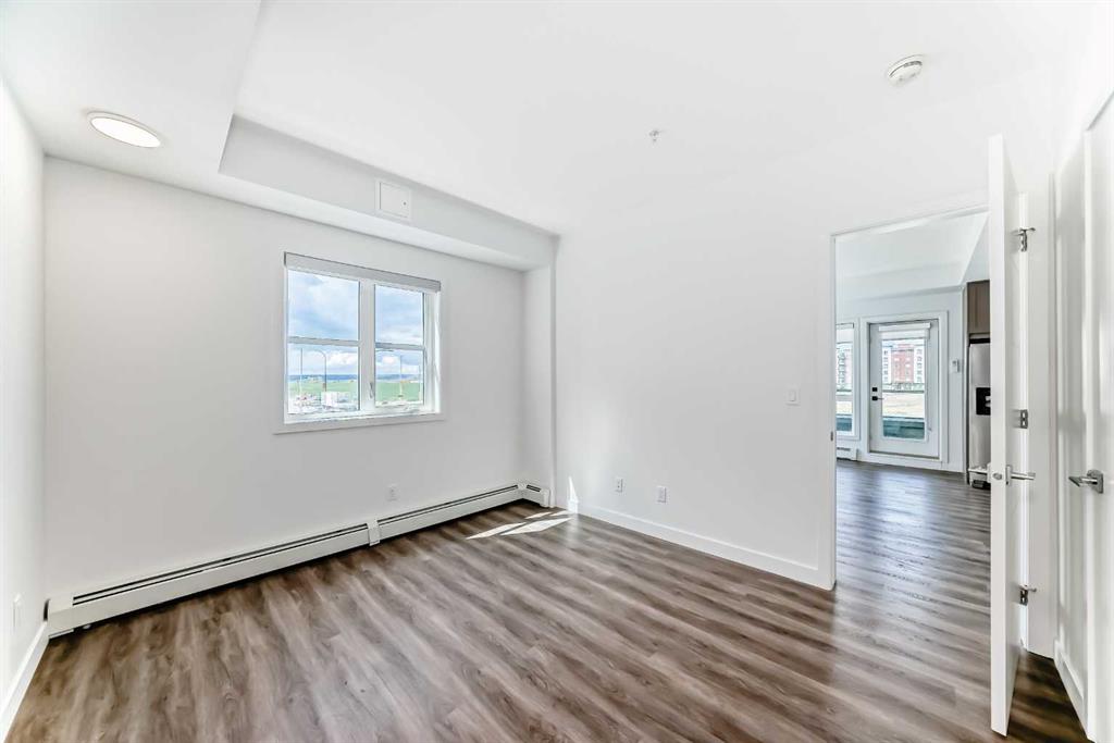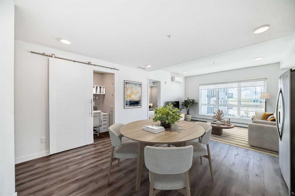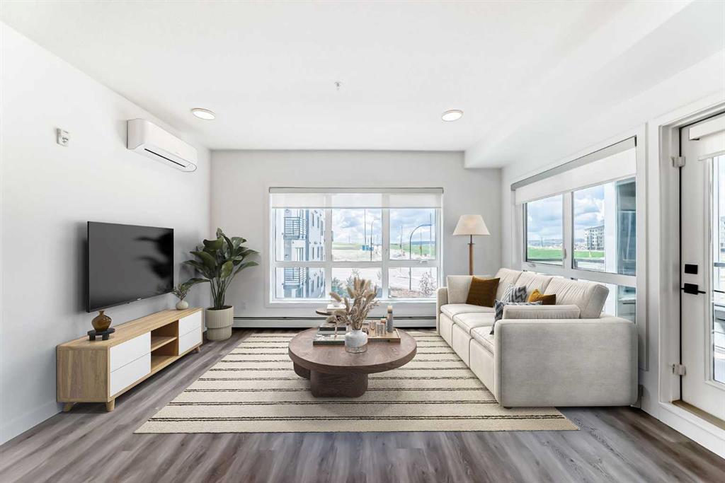 Welcome to the Maverick in Livingston — a beautifully upgraded, modern 2-bedroom + DEN, CORNER unit offering style, comfort, and exceptional natural light. Located on the 3rd FLOOR, this BRIGHT and SPACIOUS home features WINDOWS on TWO SIDES, filling the space with sunlight throughout the day. The open-concept layout seamlessly connects the kitchen, dining, and living areas, creating an inviting atmosphere for both everyday living and entertaining. The kitchen is thoughtfully designed with shaker-style cabinetry, ceiling-height cupboards, quartz countertops, tile backsplash, and stainless steel Whirlpool appliances. The primary bedroom includes a walk-in closet and a well-appointed 4-piece ensuite, while the second bedroom is conveniently located near the main bathroom. The den, enclosed with a sleek barn door, provides an ideal space for a home office, workspace, or additional storage. Step outside to your EXPANSIVE 23-foot private BALCONY— a standout feature of this unit — offering open, far-reaching views and a vibrant urban outlook, with sightlines stretching all the way to downtown Calgary. Actually feels like you're on the top floor, with views both South and West. Additional features include luxury vinyl plank flooring, air conditioning, LED lighting, roller blinds, and a full laundry room with shelving. This unit also includes TITLED, HEATED UNDER GROUND PARKING and a separate STORAGE locker. The attractive, clean, and well-maintained building offers elevator access, visitor parking, and a welcoming common area. Located close to shopping, amenities, and major routes including Stoney Trail, Deerfoot Trail, and Country Hills Boulevard — this home combines convenience with modern living and truly needs to be experienced in person to appreciate the light, layout, and expansive views it offers. GREAT VALUE HERE!
