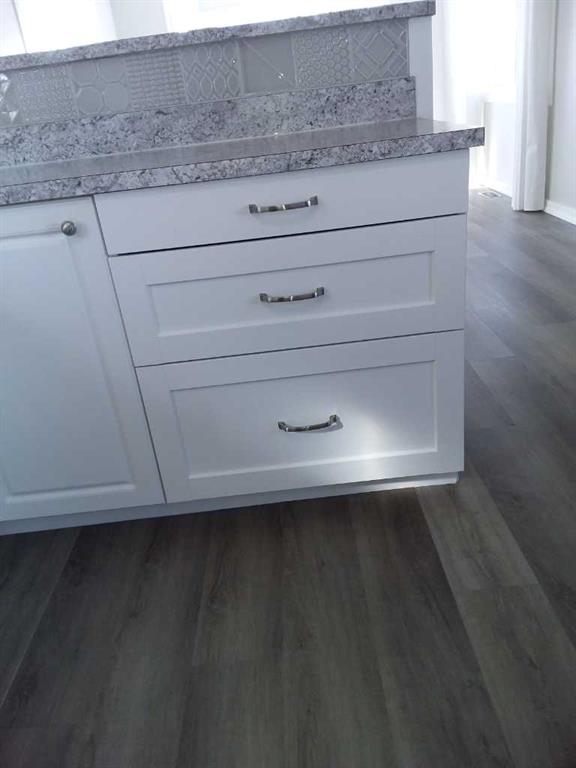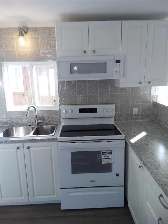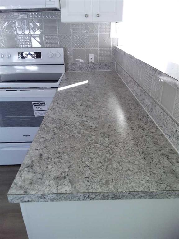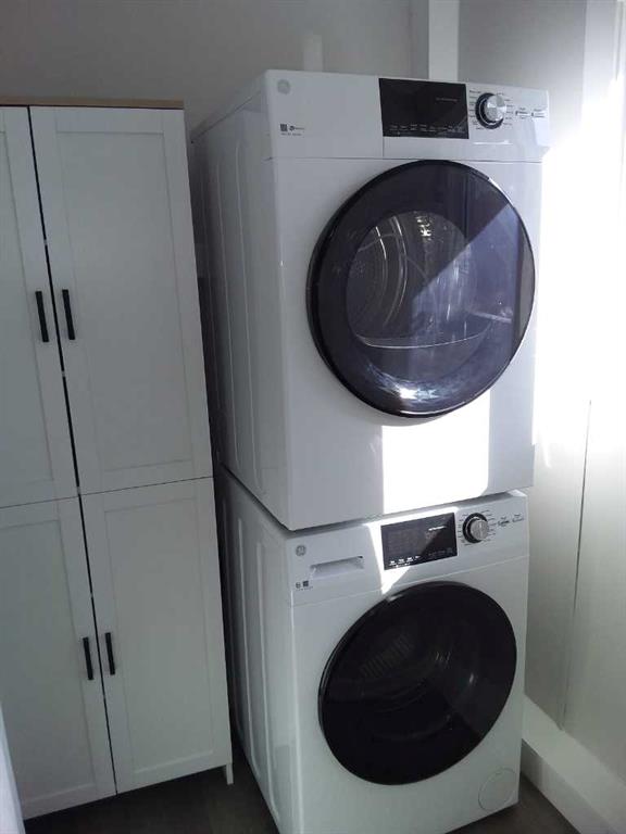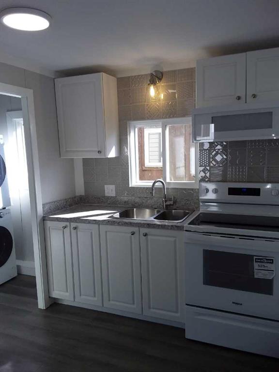Affordable living at its best! Available immediately! This 2 bedroom, 1 bath beauty has been refurbished with stylish vinyl plank flooring throughout and completely repainted. The bright kitchen has luxurious white cabinets, a huge peninsula and a stylish, modern backsplash. The home includes all new appliances, (with warranties) including a stacked washer / dryer set and microwave / hood fan with direct ventilation. The bedrooms are a good size, with double closets in each. New light fixtures throughout, including LED lights and bulbs. Kitchen and bath fixtures are new and upgraded. Every inch of this home is clean and fresh! The exterior has been clad in maintenance free vinyl siding plus a aluminum soffits. New, double paned vinyl windows with new drapes add to the comfort. This home is on a large, level lot that is partially fenced and includes a great garden shed on a new base. The parking pad in front has space for 2 vehicles. Listing agent is the current owner.