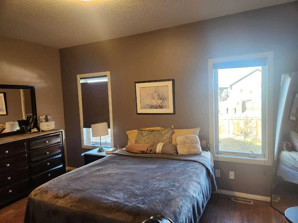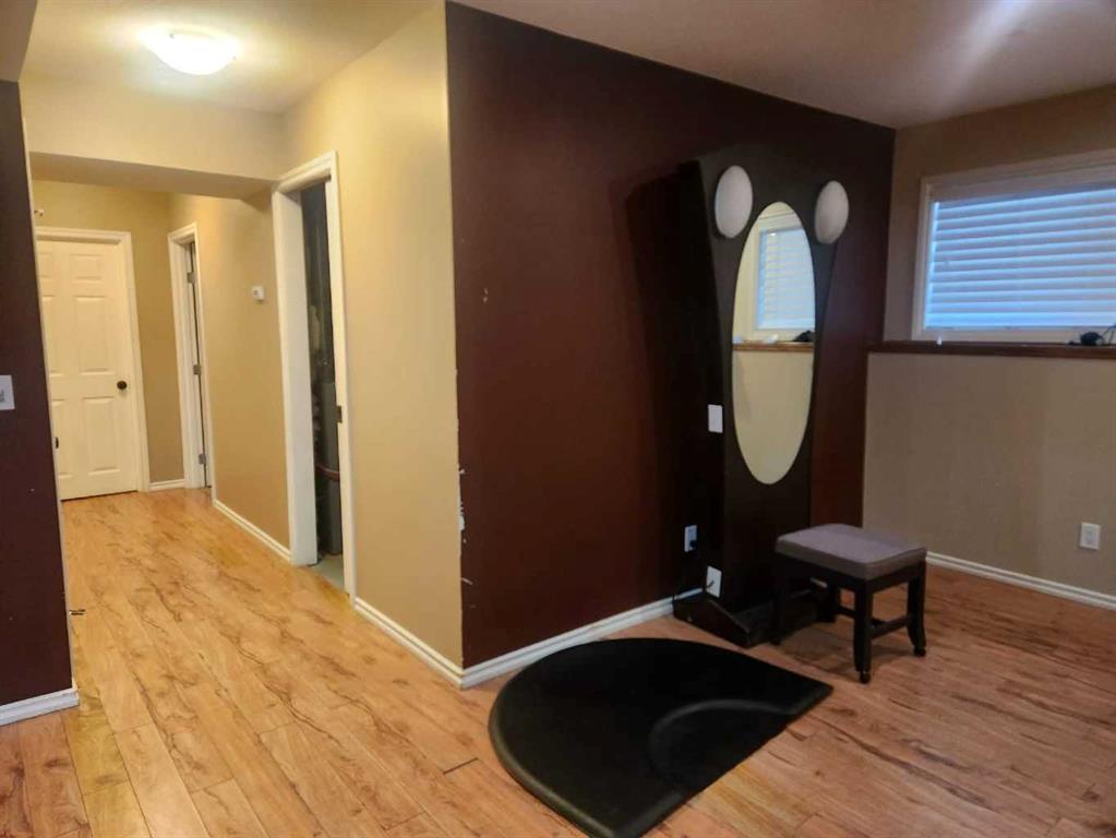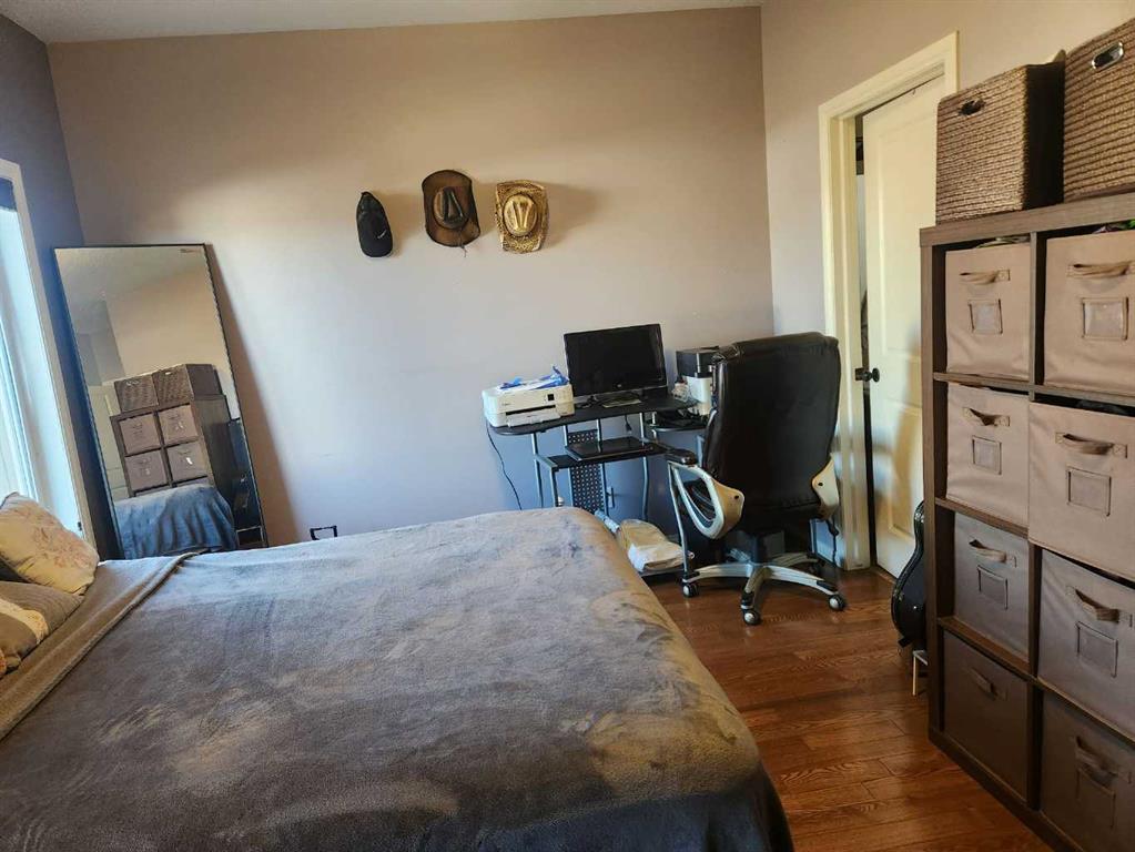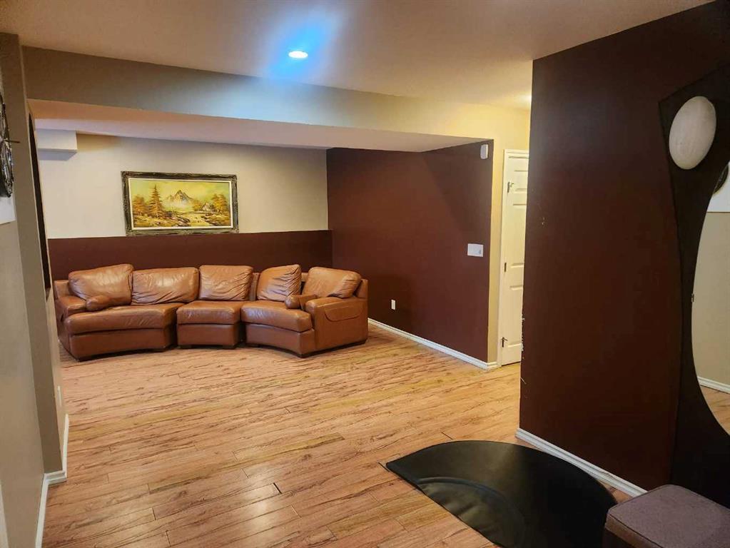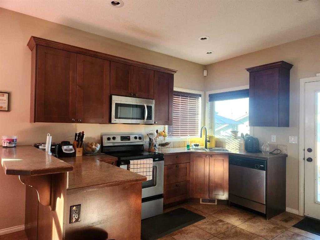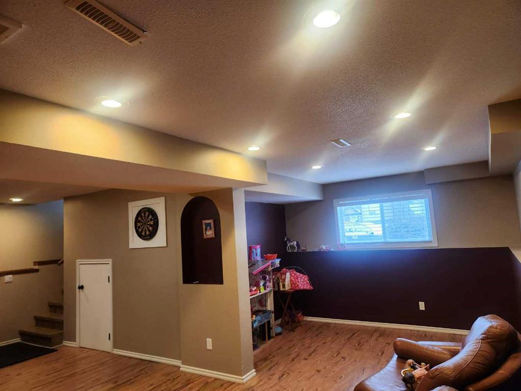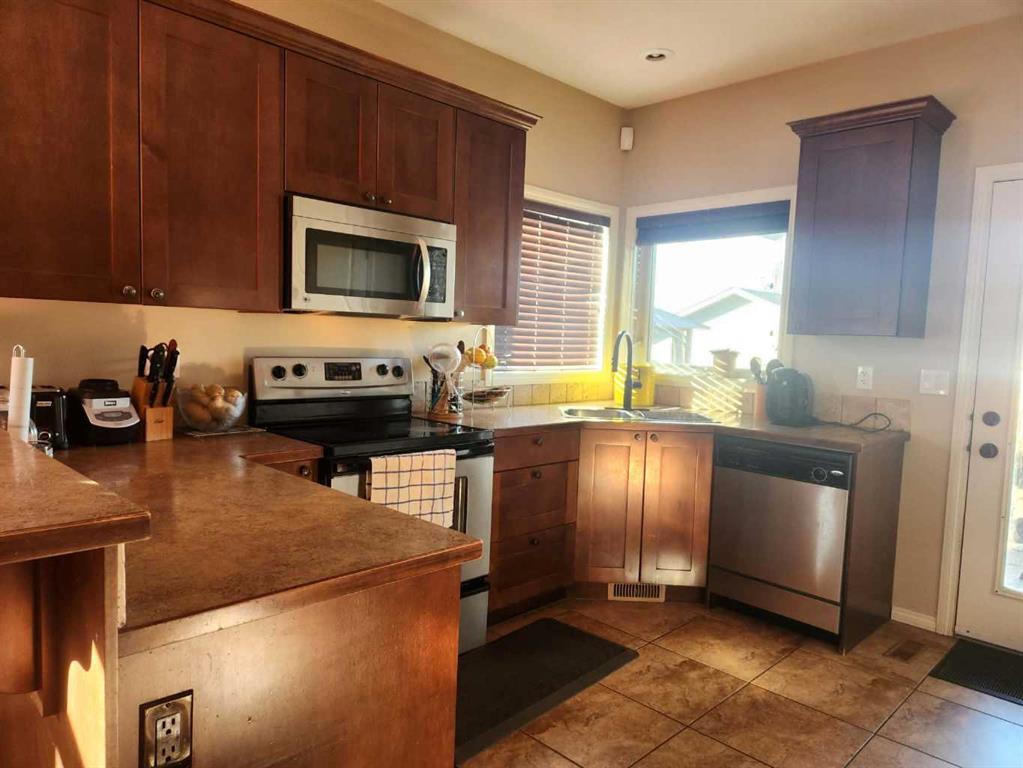 Discover this stunning, fully finished bi-level home, perfectly situated just steps from a family park. This beautifully maintained residence boasts a spacious, open-concept design with vaulted ceilings, hardwood floors, and an abundance of upgrades throughout. The inviting main floor features a U-shaped kitchen with medium-toned cabinets, a full tile backsplash, wall pantry, raised eating bar, and garden door access to a covered deck—ideal for outdoor entertaining. The large dining area seamlessly overlooks the living room, creating a perfect space for family gatherings. The primary suite comfortably fits a king-sized bed and furniture, complete with a walk-in closet and a luxurious 4-piece ensuite. Additional upstairs includes a second bedroom adjacent to the main bath. Two generously sized bedrooms across from the 3-piece bath are in the basement, perfect for family or guests. Downstairs, enjoy a spacious basement family room filled with pot lighting and an open home office space. The basement also offers room for personalized development, with in-floor heat rough-in ready. Outside, relax in the large fenced yard with backyard access via the back alley—ample space for RV parking, gardening, or outdoor activities. This home features elegant exterior accents like cultured stone, a large oversized lot, all ceramic tile entryway, and eye-catching trim details. Its prime location provides quick access to Highway routes, making commuting a breeze. Don’t miss the opportunity to own this exceptional family home—schedule your viewing today!