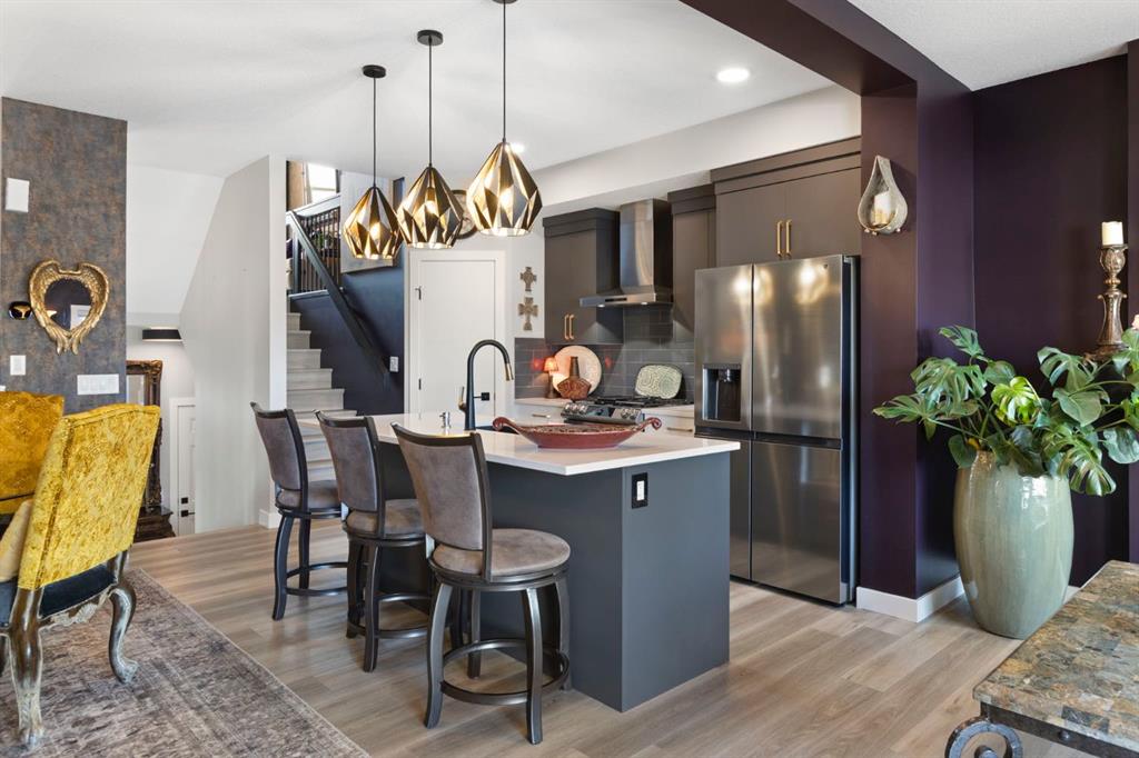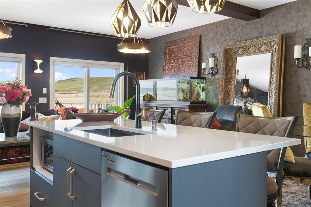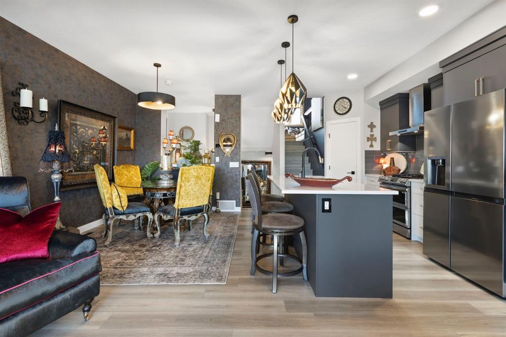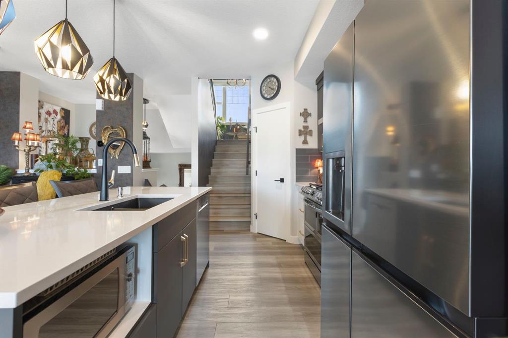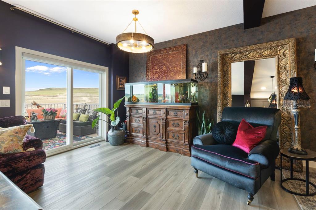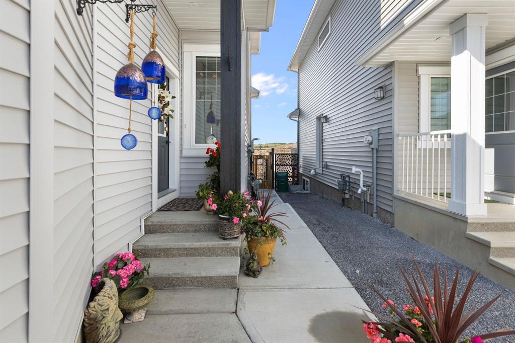 Welcome to this stunning semi-detached, 4-level split home located in the highly sought-after community of Heritage Hills in Cochrane. Offering 1,586 sq ft of developed living space, a walkout basement, and a double attached garage, this home blends dramatic architectural design with modern comfort — all framed by beautiful mountain views and unforgettable sunsets. From the moment you arrive, the impressive curb appeal sets the tone. Step inside to a spacious foyer with soaring ceilings that immediately create a sense of openness and light. The main level features an inviting open-concept layout anchored by a chef-inspired kitchen showcasing quartz countertops, high-end stainless steel appliances including a gas range, sleek modern cabinetry with elegant gold hardware, and designer Cartwright Lighting fixtures. The adjacent dining and living areas are equally impressive, highlighted by rich finishes, an electric fireplace, and oversized windows that flood the space with natural light. Patio doors lead to a 13-ft balcony complete with a gas line for your BBQ and a water hookup, making it the perfect spot to enjoy summer evenings and take in Cochrane’s stunning sunsets. Just a few steps up, the spacious bonus room provides an ideal space to relax, unwind, or enjoy family movie and game nights, with a gas line already in place for a future fireplace. The upper level is home to a generously sized primary retreat featuring a stylish 3-piece ensuite with quartz countertops and modern tile flooring. Two additional bedrooms, a full bathroom, and a convenient upper-level laundry room complete this level, offering both comfort and functionality for everyday living. The unfinished walkout basement presents a blank canvas ready for your ideas — whether a recreation room, home gym, or guest suite. The double attached garage offers secure parking and ample storage. Outside, the yard is beautifully landscaped with a 6-ft wrought iron fence, wide concrete walkways, a lower-level patio, and lush green lawn, designed for easy living, entertaining, and relaxing. Backing directly onto open land with no future neighbours behind, this home offers privacy and long-term value. Even better, the area directly behind is slated to become the future Horse Creek Sports Park, featuring a scenic lake, picnic areas, walking trails, sports fields, arenas, and a community gathering centre — an exceptional lifestyle amenity right at your doorstep. With its rare split-level design, refined finishes, and unbeatable location, this Heritage Hills home offers a truly unique opportunity. Ideally situated just minutes from the Bow River, Ghost Lake, under an hour to the mountains, and only 35 minutes to downtown Calgary, this is a location you simply won’t find anywhere else.