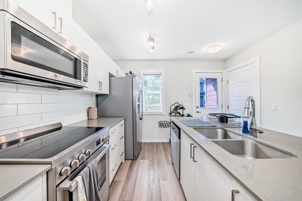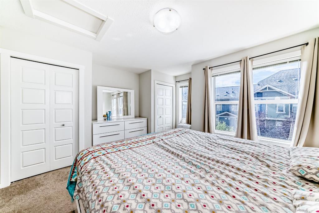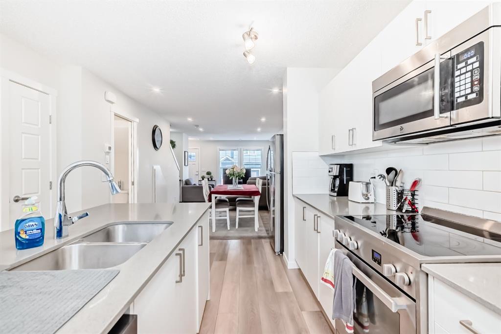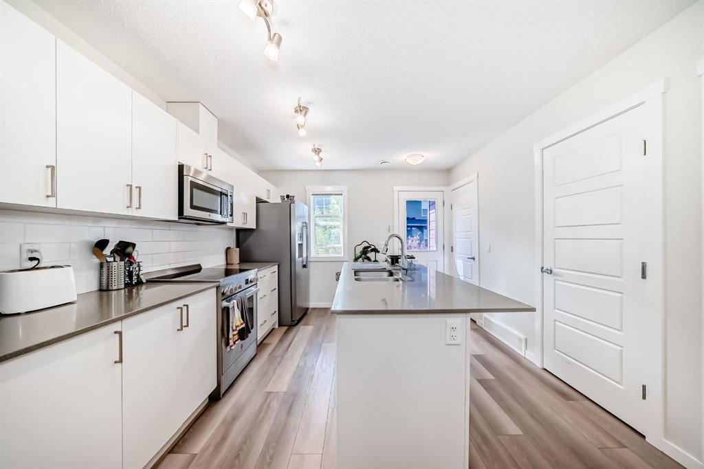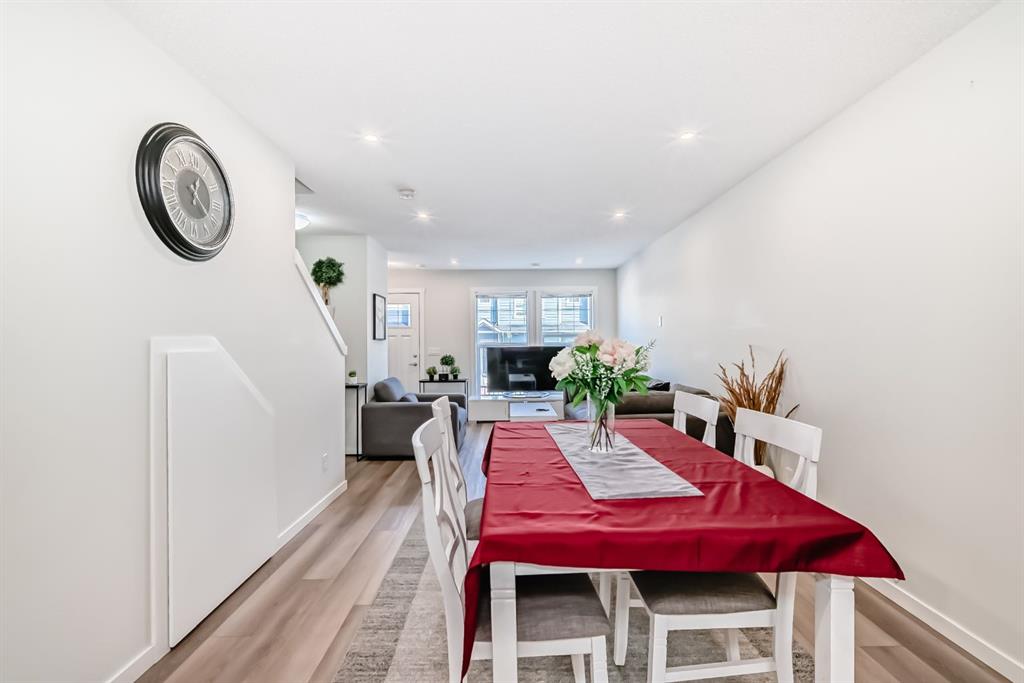 Welcome to this beautifully designed townhome in the desirable community of Cranston SE Calgary – offering modern finishes, thoughtful design, and incredible outdoor living spaces. The main floor features an inviting open-concept layout with a bright living room, spacious dining area, and a well-appointed kitchen with ample cabinetry and counter space. A convenient half bathroom completes the main level. Upstairs, you’ll find a large primary suite with its own private ensuite bathroom. The second bedroom is generously sized and served by a separate full bathroom, making it perfect for family, guests, or a home office. On the third level, discover a large flex space that can be used as a family room, entertainment area, or home office. From here, step out onto the impressive rooftop balcony – the ideal spot to relax, entertain, and enjoy Calgary’s summer evenings. Additional highlights include in-unit laundry, a private backyard for BBQs or gardening, and a dedicated parking stall conveniently located near the unit. All of this in the sought-after community of Cranston, with easy access to schools, parks, shopping, pathways, and major roadways like Deerfoot and Stoney Trail. This home combines style, comfort, and functionality – perfect for first-time buyers, downsizers, or investors. Book your showing today!