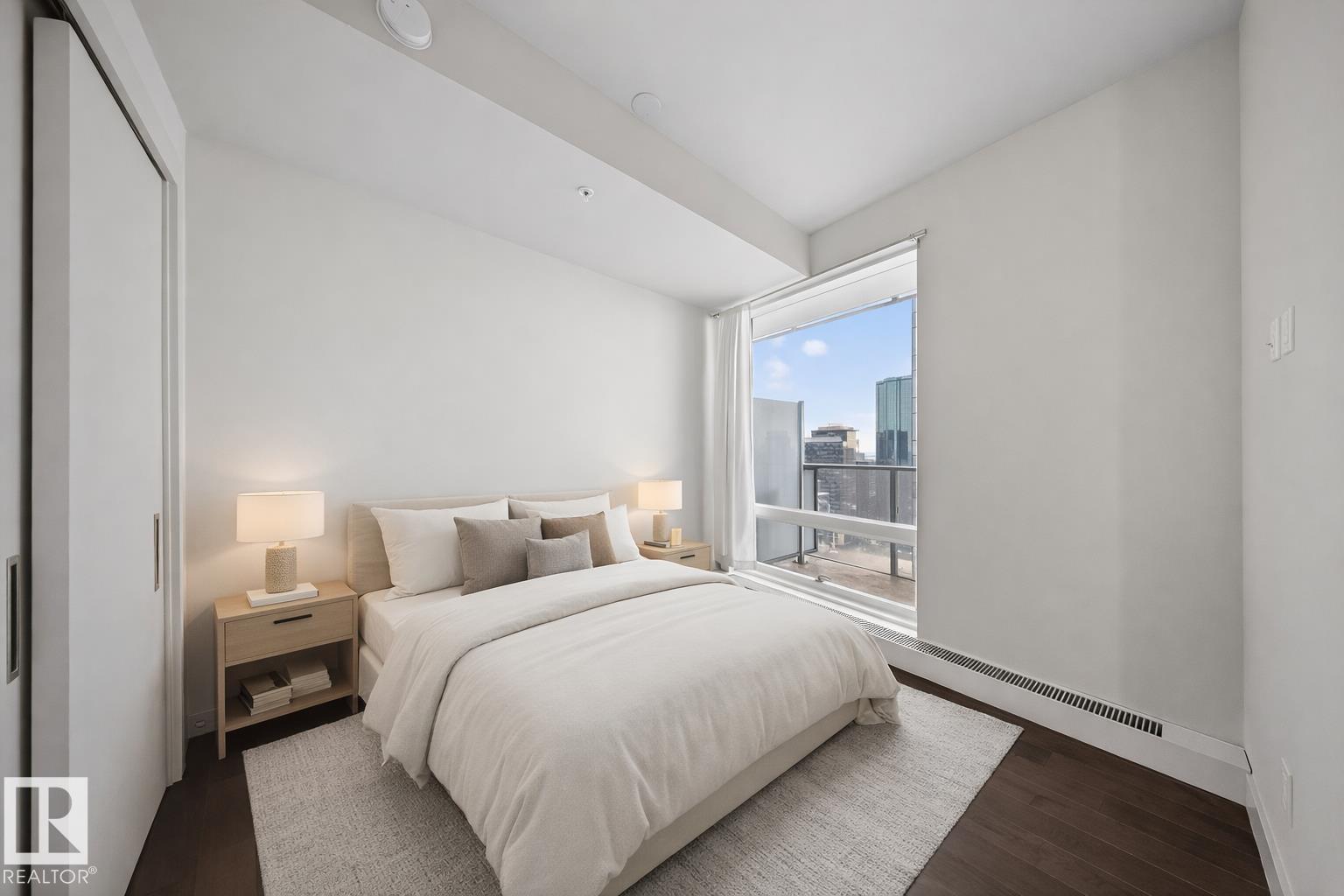 Welcome to The Legends Private Residences, located above the prestigious JW Marriott in the heart of the Ice District. This stylish, move-in-ready, one-bedroom, one-bathroom residence offers in-suite laundry, engineered hardwood flooring, floor-to-ceiling windows, and balcony with beautiful sunset views. The modern kitchen features quartz countertops and high-quality built-in Bosch and Miele appliances, combining sleek design with everyday functionality. The unit includes a titled parking stall, along with access to the JW Marriott’s premium amenities. Enjoy membership to the Archetype Fitness Centre, indoor pool, hot tub, steam room, and spa, plus exclusive use of The Residence Club amenities including a rooftop patio, billiards lounge, conference room, outdoor BBQ patio, dog run, and 24/7 concierge and security. Direct pedway access connects you to Rogers Place, restaurants, grocery, and more. Experience elevated living at The Legends Private Residences.