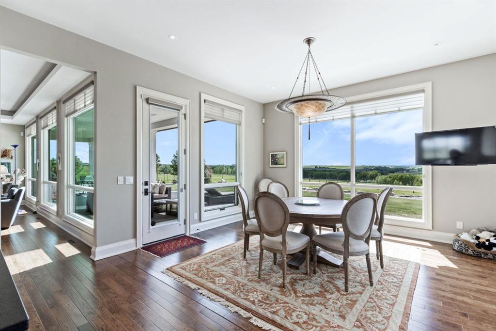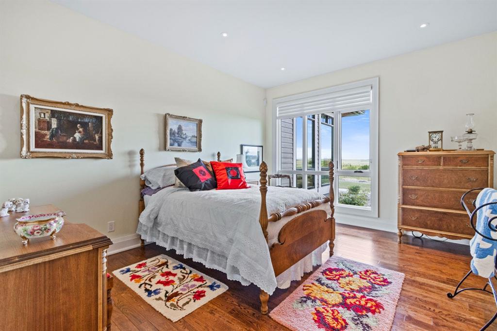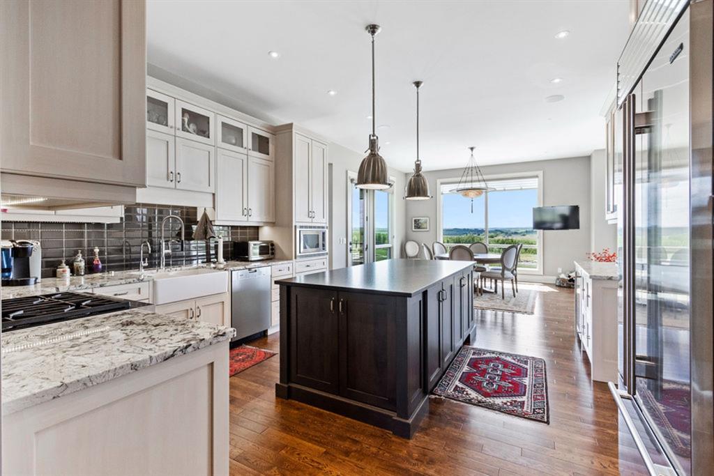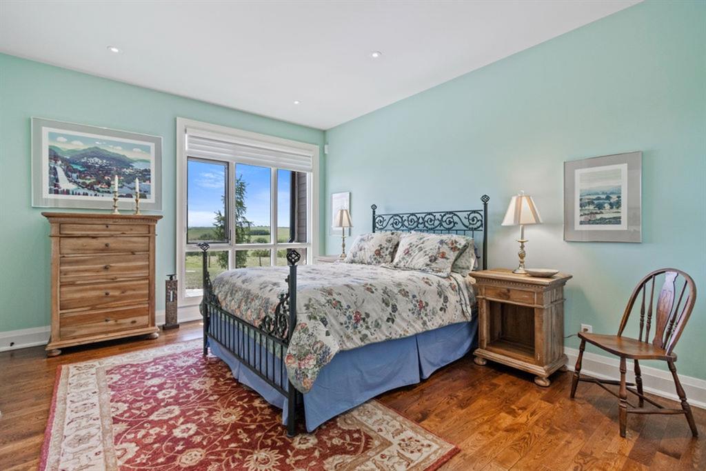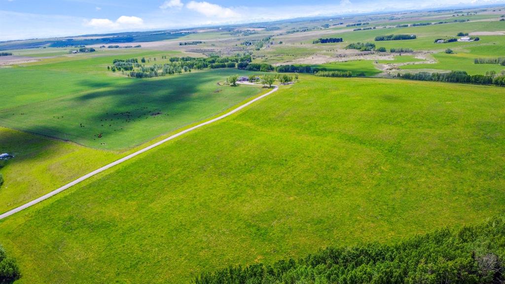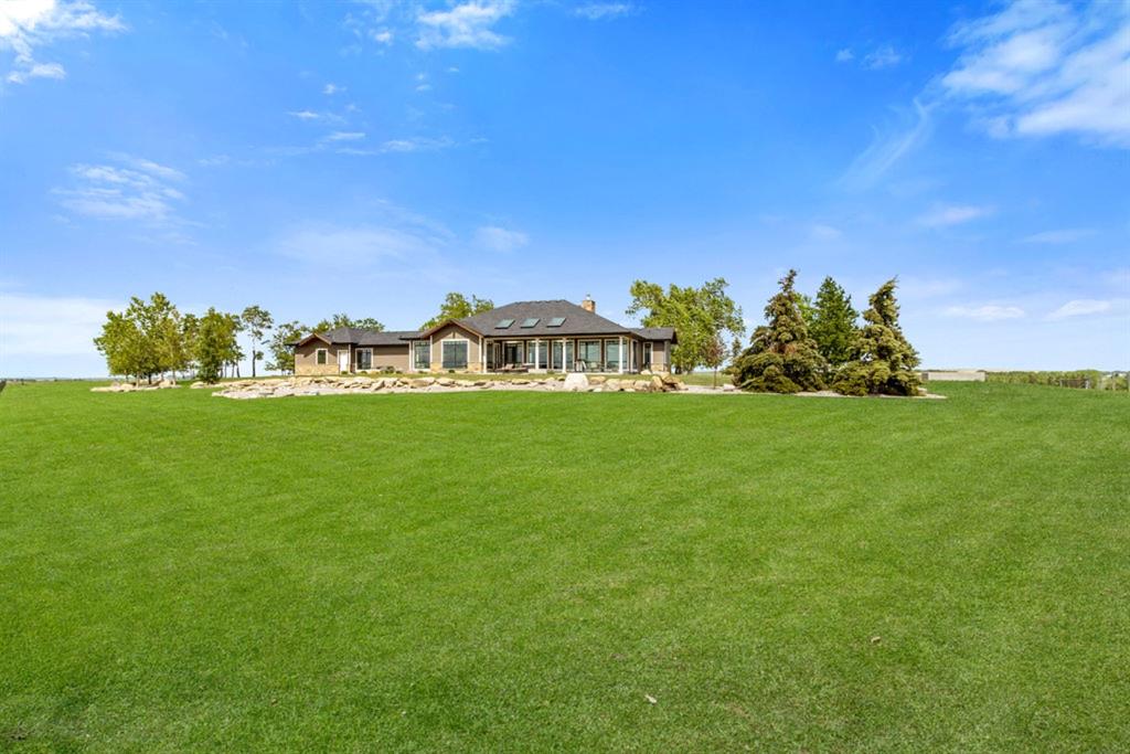 Stunning Custom Built Bungalow sitting atop the biggest hill on 122 acres with breathtaking views in all directions. Unobstructed mountain views to the west, golf course to the north, the friendly hamlet of madden east and south for miles! Enter from your gated private paved lane-way and find this architectural thing of beauty at the peak. This home is just shy of 4000 sq/ft on the main level and boasts another 2700sq/ft of developed space in the basement. The main floor has gleaming hardwood flooring throughout along with slate entry and heated tile flooring in all the bathrooms. Oversized low UV transmission windows with Hunter Douglas blinds throughout helps capture the most amazing landscapes. The executive chefs kitchen has stainless steel appliances including a Wolff gas stove, Sub Zero fridge, Dacor wall oven and microwave. All cabinetry milled by Legacy with soft close and upgraded shelving and storage. Huge center island with Cambrian Black satin granite is a classic focal point in this exquisite home. There are two dining areas for all sizes of gatherings and a huge living room with descending TV from the ceiling and natural gas fireplace. The large master bedroom comes with a 4 piece en-suite with modern tiled shower, his/her sinks in Bianco Rhino marble and a walk in California closet. Main floor is completed with two other bedrooms with California closets and Jack n Jill 4 piece bathrooms, an office, and den adjacent dining room. The second fireplace is found in the library or study for those that like to kick back with a glass of wine and enjoy a good book. Basement is finished with a huge family/ games room and tons of storage. The attached triple garage measures 38x22 it has a separate entry and big bright windows and upgraded wood doors. The west facing concrete patio is covered with skylights so you can enjoy it in all weather! The property is professionally landscaped with mature trees and raised garden boxes for the green thumb. Extra features include 2 independent furnaces and AC systems, in-floor heating, water softening system, instant hot water, in-wall Vacu flo, Sonos sound, Security system and more! Combination of pasture and grade A crop land with good perimeter fencing. Rare opportunity to own a beautiful parcel of land this size commutable to Calgary with an equally magnificent home to match!