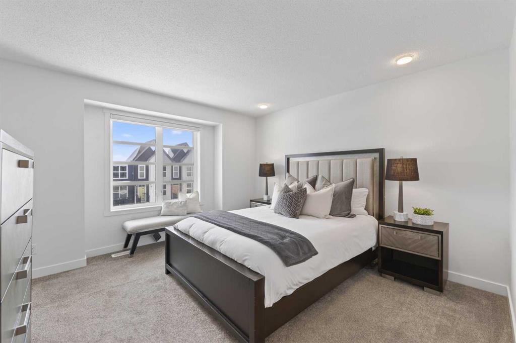 End-unit townhouse with double garage and modern finishes - this is the one you’ve been waiting for! Bright, open-concept main floor featuring wide-plank flooring, large windows, and a spacious living room with a sleek feature wall. The kitchen is clean and contemporary with quartz countertops, stainless steel appliances, shaker style cabinetry, and a stylish white tile backsplash. A generous dining area and convenient 2 piece bath complete the main level. Upstairs offers a well-designed layout with a spacious primary bedroom featuring a walk-in closet and private 3 pc. ensuite, plus 2 secondary bedrooms, a full 4 pc bath, and a convenient upper-floor laundry. The unfinished basement provides nearly 600 sq. ft. of future potential or excellent storage. The end unit means more light, more privacy, and better livability! Step outside to your fully fenced private backyard, complete with a detached double garage and located close to parks, pathways, and everyday amenities—ideal for first-time buyers, investors, or downsizers looking for low-maintenance living with NO CONDO FEES! Located in the growing community of Carrington, you’ll enjoy quick access to Stoney Trail, scenic walking paths, parks, and a beautiful re-naturalized wetland with lookout points. With future schools, shopping, and the planned Green Line LRT nearby, this is a smart opportunity for buyers.