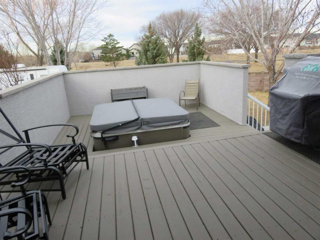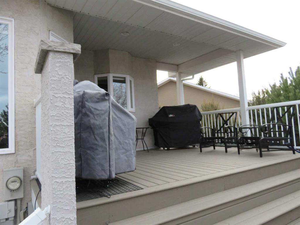 Unique 2 story fully developed, renovated with four bedroom up, quiet court location, backs onto city park and trail with back alley access. Large pie shaped lot with front RV parking 12' to 19' wide 40' deep. Spacious front landing, Beautiful oak kitchen/under cabinet lighting/island, walk in pantry, kitchen appliances are stainless steel fridge, gas stove, microwave, built-in dishwasher. Great room with gas fireplace, dining nook garden door to two tier covered deck/gas line for your bbq/under deck storage. Including Hot tub (permitted) on open deck. overlooking landscaped yard with trees and perennial, underground sprinklers and designer cinder block fence. Main floor laundry/den with closet, including washer & dryer. Upper level with 4 bedrooms, a huge primary bedroom for your king size bed and extra seating area. Bright 5 pieces Ensuite with double vanity, granite counter, large tile shower 5'6" X 3'4" with glass door, bathtub. Main bath 4 pcs. with granite counter and sky light. Three more bedrooms. Basement developed with large family room/gas fireplace. Including built in entertainment system with seven speakers and wall TV. Large windows, room to put in 5th bedroom. 3 pcs. bathroom. Attached 24' X 28' garage, ceiling 13' high, with floor drain and utility sink. Side RV parking. 24 triple glazed windows and coverings new in 2024. House with newer paint. Large back yard for your extra garage or swimming pool. Minutes walk to Leisure center, Co Op, restaurant, shopping and schools etc.