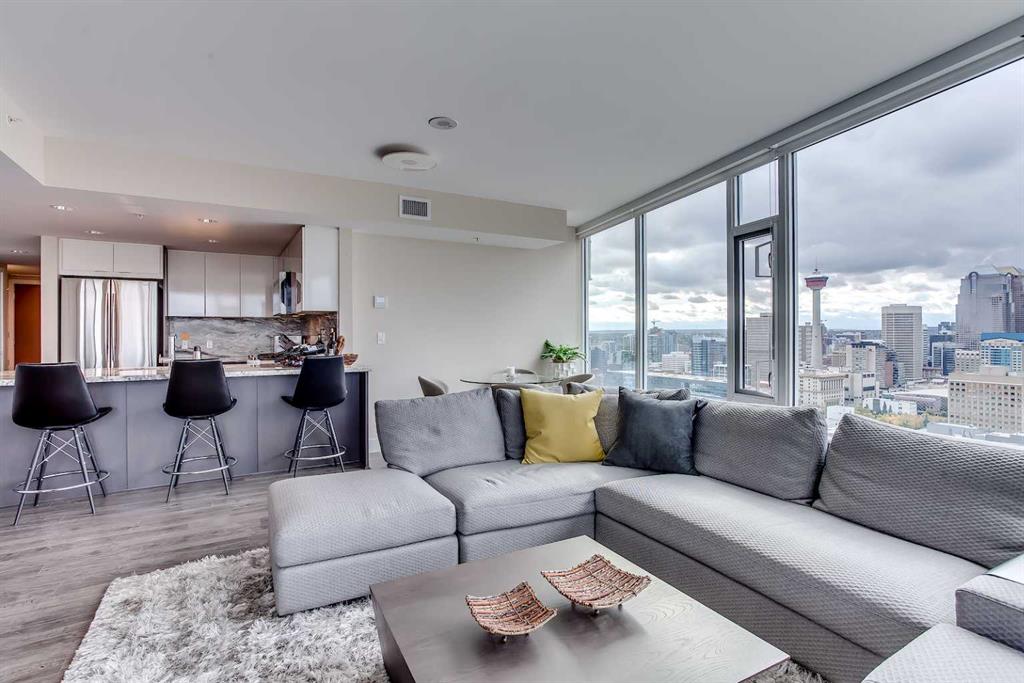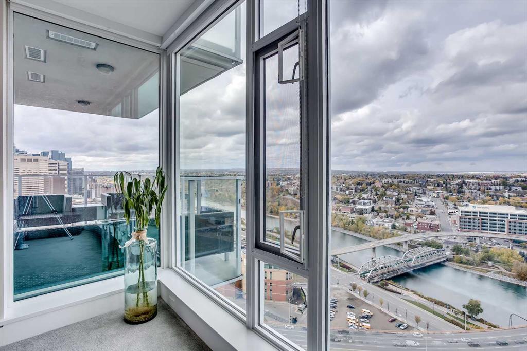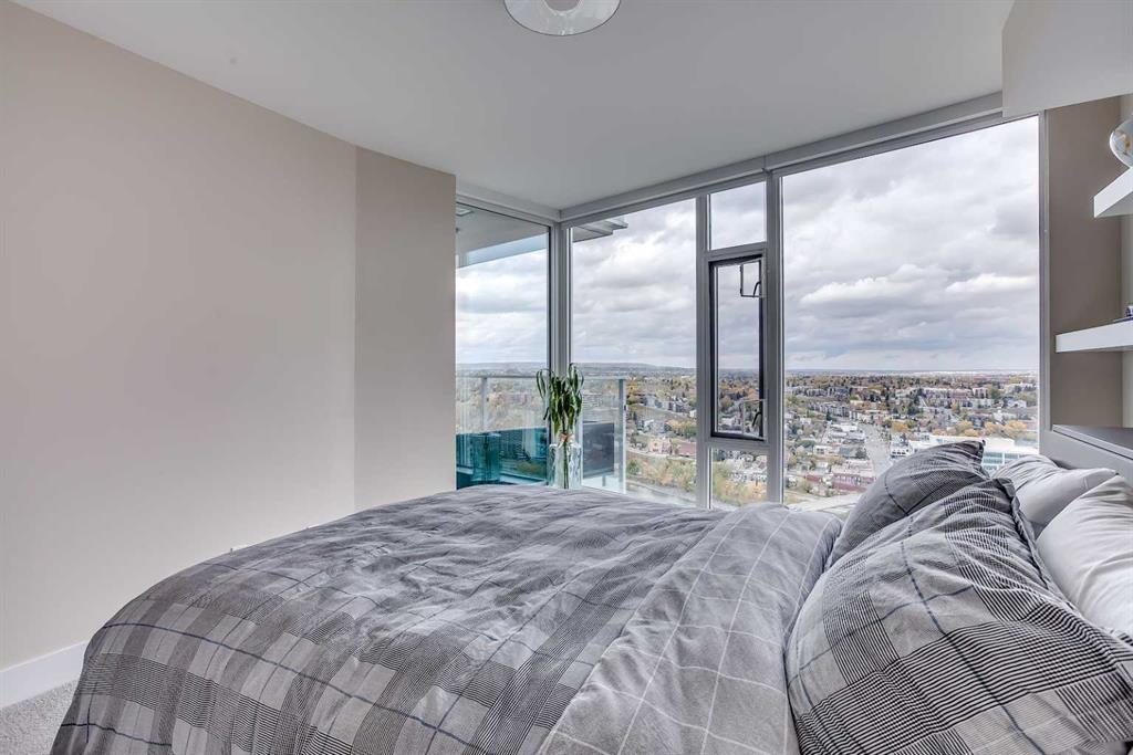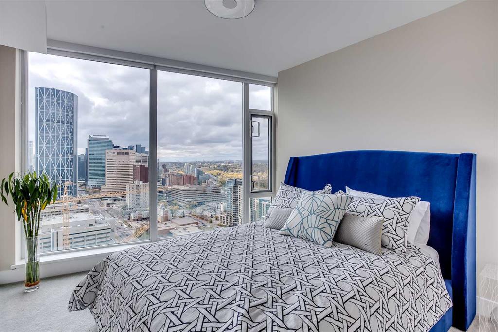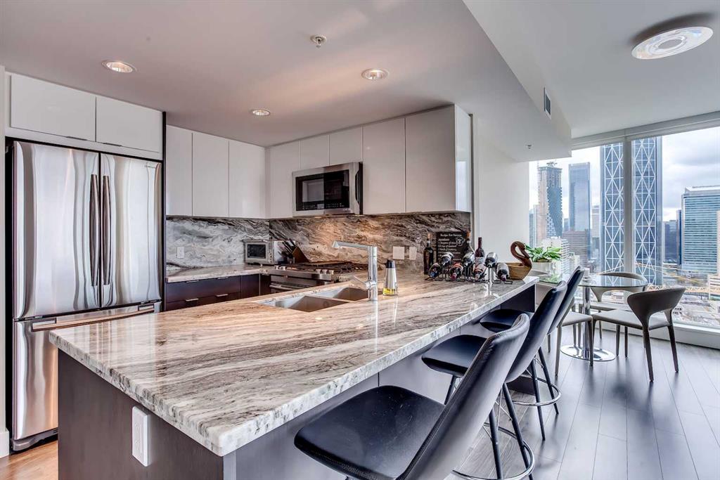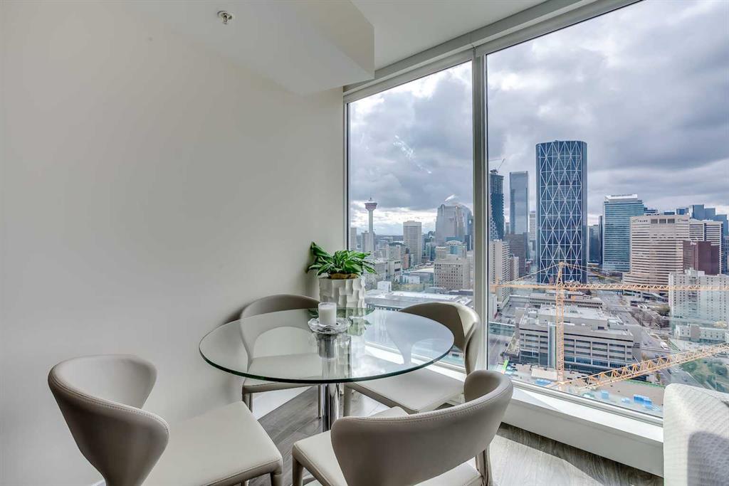 Wrap around incredible Views Upscale Urban Living in the Heart of East Village – Evolution Condo on the 30th floor for maximum Wow factor Experience sophisticated downtown living in this stunning 2-bedroom, 2-bathroom condo located in the sought-after Evolution complex in East Village. Designed with style and comfort in mind, this home offers an exceptional blend of high-end finishes, thoughtful layout, and unbeatable convenience. Floor-to-ceiling windows frame breathtaking views of the Bow River, the city skyline, and the mountains beyond, filling the space with natural light. The open-concept design connects the living room, dining area, and kitchen, creating an inviting atmosphere perfect for relaxing or hosting guests. The gourmet kitchen is equipped for serious cooking, featuring granite counters, a gas cooktop, stainless steel appliances, and an island with seating for casual meals. The primary bedroom serves as a peaceful retreat with a walk-through closet and a luxurious 5-piece ensuite complete with double sinks, a granite vanity, separate shower, and a deep soaking tub. The second bedroom is generously sized and sits next to a modern 3-piece bathroom—ideal for visitors, roommates, or a home office. Additional highlights include heated flooring in the bathrooms , in-suite laundry, a northwest-facing balcony with a gas hook-up for barbecuing, tandem underground parking for 2 cars, and a secure storage locker. Residents enjoy access to top-tier amenities, including a fully equipped fitness facility with sauna and steam room, a party room, rooftop terrace with BBQ areas, central air conditioning, and convenient concierge service. Everything you need is just steps away—shops, restaurants, entertainment options, transit, and the scenic Bow River Pathway for walking, cycling, or running. The newly opened “The Open” facility adds even more appeal, offering pickleball courts and public washrooms right in the neighbourhood. This exceptional condo offers more than a place to live—it provides a vibrant, elevated lifestyle with incredible views and unmatched convenience. A must-see opportunity.
