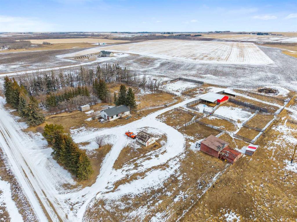 Welcome to this exceptional 155.98-ACRE property offering stunning MOUNTAIN VIEWS, functional farm infrastructure, and the rare benefit of 2 HOMES, all ideally located on pavement between DIDSBURY and CARSTAIRS. This versatile property is FULLY FENCED and cross-fenced, complete with a well-established BARNYARD SITE, 2 wells (10gpm- 2nd home & 14 gpm main house + 2 stock waterers, making it well suited for a variety of agricultural or hobby farm uses. Currently the majority of the land broke to seed crop & also has a well site on the north side of the parcel paying just under $2500 per year. The main residence, built in 2008, is a beautifully UPDATED and FULLY FINISHED home featuring a WALKOUT BASEMENT and a heated DOUBLE ATTACHED GARAGE (23.1 X 22.6) with a spacious, practical entry. Inside, the home offers 6 bedrooms and a bright, open layout designed for comfortable family living. The living room is warm and inviting with a GAS FIREPLACE, while the kitchen is the heart of the home, complete with a large ISLAND, granite countertops, and plenty of space for gathering and entertaining. The primary suite includes a 4-PIECE ENSUITE with a relaxing soaker tub, creating a private retreat at the end of the day. Recent updates in 2026 include fresh paint, refinished hardwood floors, and additional improvements, giving the home a clean, modern feel, while in-floor heat adds comfort and efficiency. A second home on the property adds incredible flexibility, offering a cute and quaint space with potential for 2+ bedrooms, ideal as a rental, guest house, or accommodation for farm help. With its combination of land, infrastructure, multiple residences, and breathtaking mountain views, this property presents a unique opportunity to enjoy country living while remaining conveniently close to nearby communities. Start living your DREAM COUNTRY LIFE south west of Didsbury !