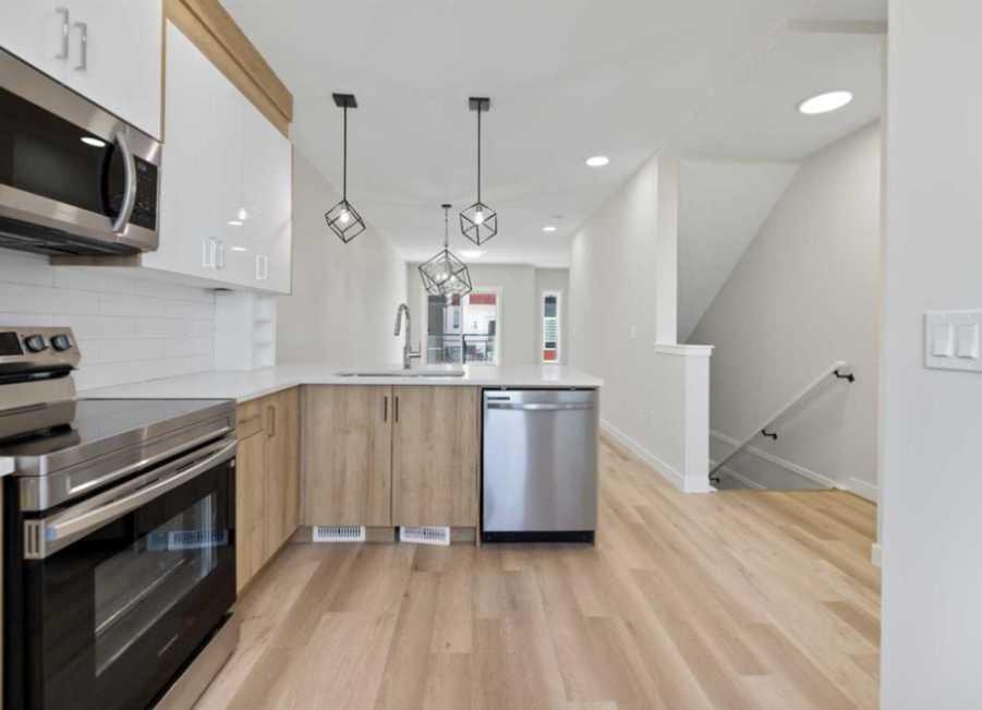 Welcome to this brand new modern townhouse offering 1,553 sq ft of thoughtfully designed living space in a desirable west facing location. This stylish 3-bedroom, 3.5-bathroom home delivers the ideal balance of comfort, function, and low-maintenance living. The main level features a welcoming entryway, direct access to the attached front garage, and a private bedroom with a full ensuite bathroom. This space is perfect for guests, a home office, or multi-generational living. The second floor showcases an open-concept layout filled with natural light, complete with a spacious living and dining area, a sleek modern kitchen with stainless steel appliances, and a private balcony that is ideal for evening relaxation or weekend BBQs. A convenient powder room completes this level. Upstairs, you will find two generously sized bedrooms, each with its own ensuite for maximum privacy. The laundry area with a stacked washer and dryer is also conveniently located on this upper floor. Positioned as the third unit from the corner, this west-facing home enjoys great natural light and modern curb appeal. Located near key amenities, green spaces, and commuter routes, this is an excellent opportunity to own a move-in-ready home.