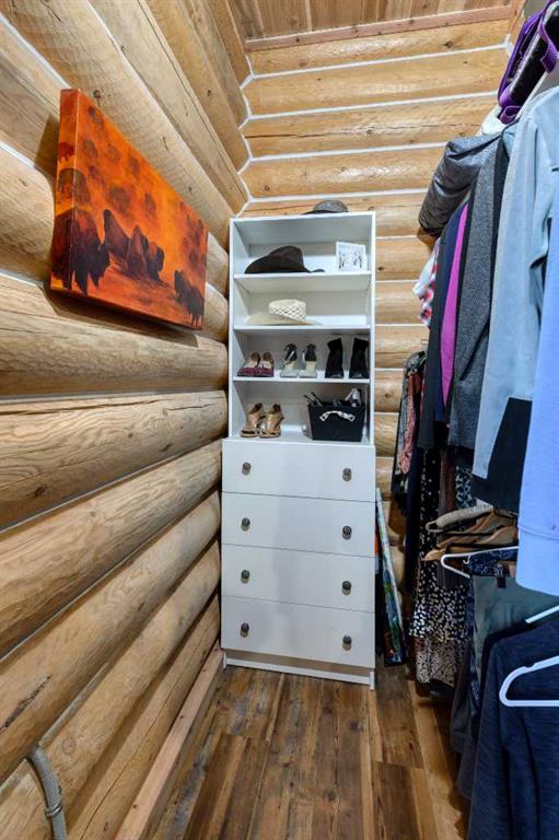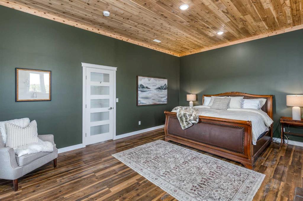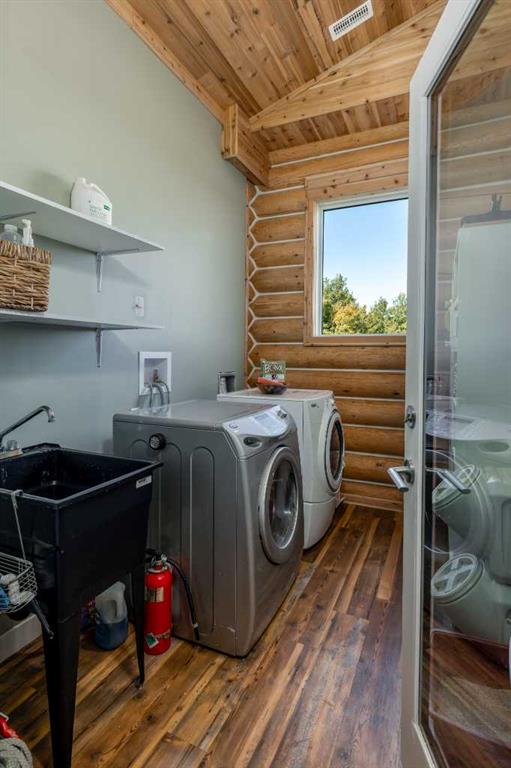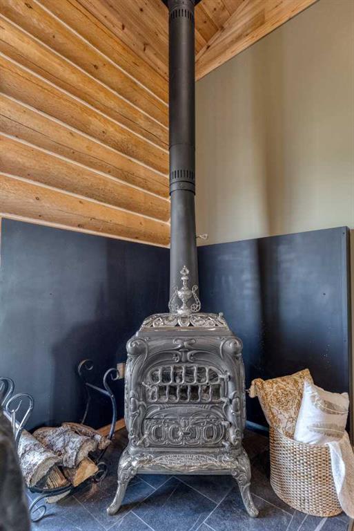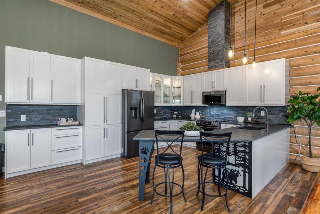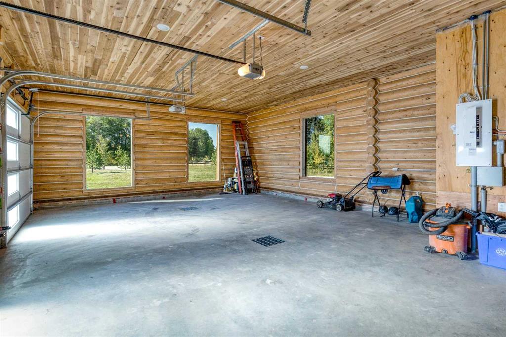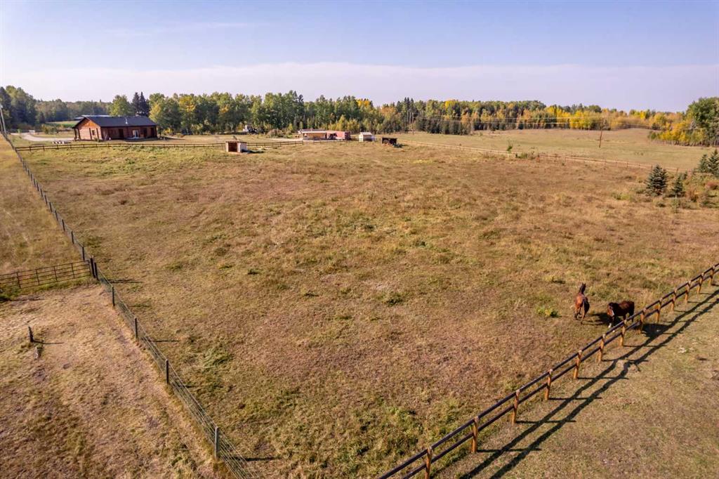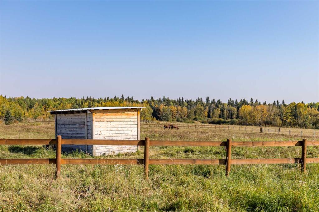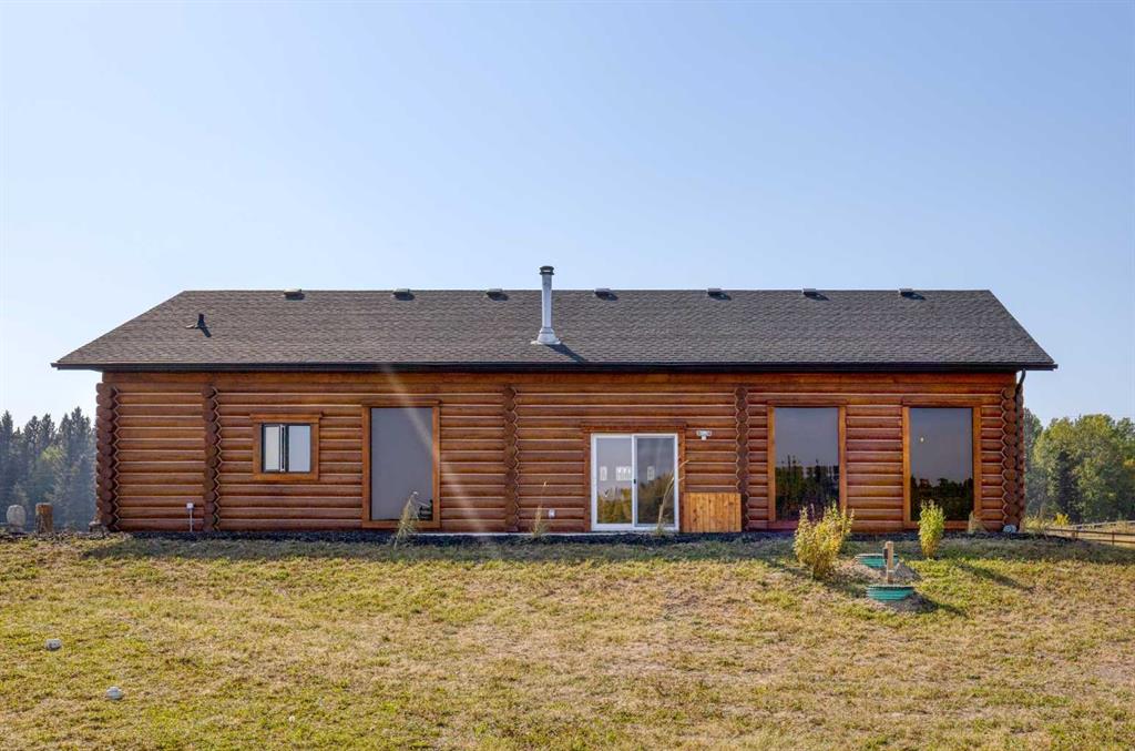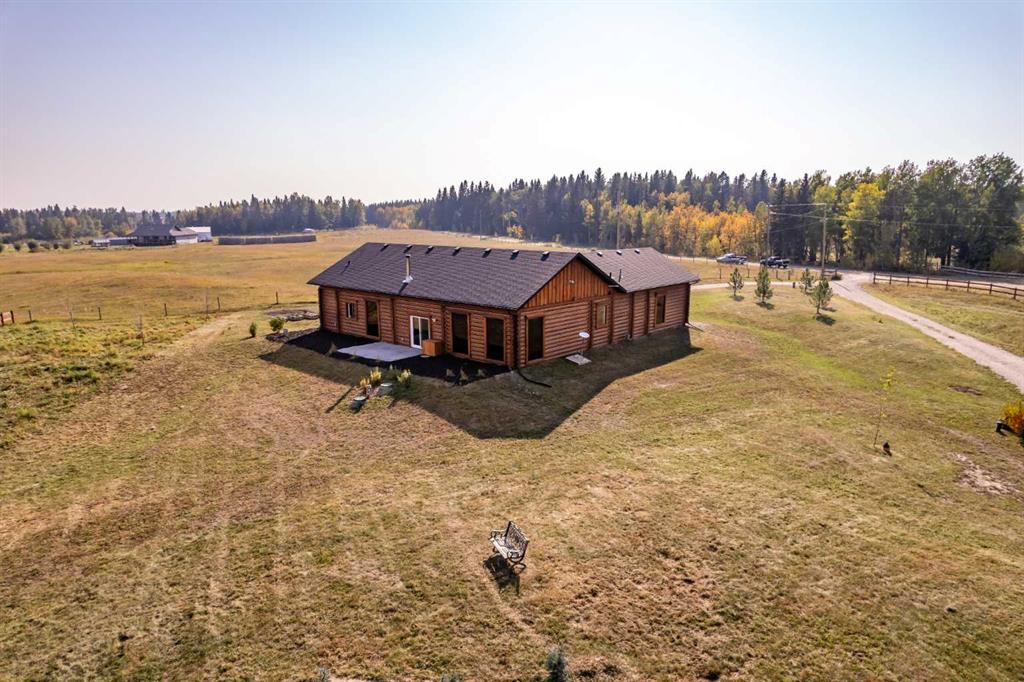 HORSE SET UP || QUALITY CONSTRUCTION || Experience the perfect blend of rustic charm and modern comfort in this stunning 2023-built log home, crafted from beautiful spruce and pine logs and designed with slab-on-grade construction and in-floor heating throughout. Set on 5 fully fenced acres complete with paddocks, auto-waterers and horse shelters, this property is a dream for horse lovers or anyone craving country living with contemporary convenience. Step onto the welcoming front porch and into a bright, open-concept living space where timeless details meet modern finishes. The living room features a beautifully restored 1920s wood-burning stove as its centerpiece, complemented by warm wood-clad vaulted ceilings and tempered, tinted windows that offer added privacy and style. The kitchen is as functional as it is striking, showcasing crisp white cabinetry, granite countertops with a leather finish and stainless steel appliances. Insulated interior walls ensure comfort and quiet throughout the home. This 3-bedroom, 2-bath layout includes a double attached garage with huge windows which fill the space with light, man door, doggy door and drains leading to a catchment system beneath. The home also offers a boiler system, HRV and a convenient laundry rough-in with hot and cold taps in the garage. Outside, you will find thoughtful touches that make this property stand out even more. A tranquil pond with its own thriving ecosystem invites you to relax and enjoy nature, while raised garden beds provide the perfect space for growing your own produce. The property also includes a prepared gravel pad currently where the cabin sits serviced with electrical and water. With every detail carefully considered, from the tinted windows to the vibrant outdoor spaces, this property offers a rare opportunity to enjoy modern log-home living with authentic country charm.