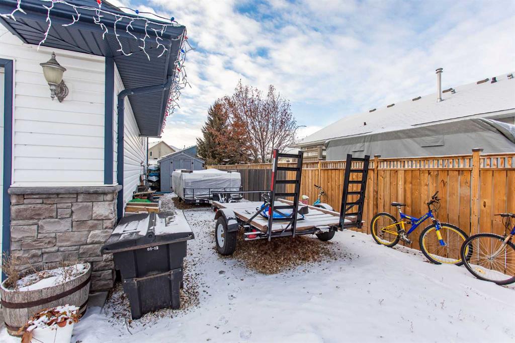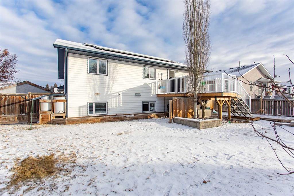 Welcome to this spacious 1520 sq ft family home in the desirable Iron Wolf community of Lacombe. Designed for comfort and room to grow, this property offers 5 bedrooms (3 up/2 down), main floor laundry, and a bright, functional kitchen with an abundance of cabinetry and a corner pantry. The lower level features in-floor heat, a generous family room, and a den with French doors—perfect for a home office, hobby room, or quiet retreat. Numerous upgrades include new windows (2025) and solar panels, adding long-term efficiency and value. Step outside to a beautifully landscaped yard complete with fruit trees (Saskatoon & plum), a large deck with gas line for BBQ, a patio block firepit, and a dedicated pad for a future hot tub. The rock side yard provides oversized RV parking, and the attached heated garage adds year-round convenience. A welcoming home with thoughtful features throughout—ready for its next family.
