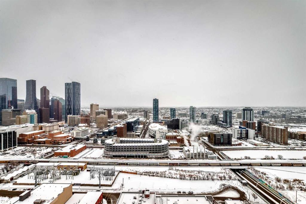 Experience elevated downtown living at The Guardian! Located on the 34th floor, this bright and beautifully designed 2-bedroom, 2-bath condo captures sweeping city views and a dynamic urban backdrop from one of Calgary’s most recognizable high-rise communities. The open layout is anchored by a modern, European-style kitchen featuring integrated appliances, streamlined cabinetry, under-cabinet lighting, and a large island that naturally connects the kitchen, dining, and living spaces. Floor-to-ceiling windows bring in abundant natural light and showcase the cityscape, creating a welcoming environment ideal for both everyday living and entertaining. The primary bedroom offers a comfortable retreat with a private 4-piece ensuite, while the second bedroom is versatile and conveniently located near a sleek 3-piece bathroom with a walk-in glass shower—perfect for guests, roommates, or a home office. Additional conveniences include in-suite laundry, a private balcony with impressive views, titled underground parking, and assigned storage. Residents of The Guardian enjoy an outstanding selection of amenities, including a fully equipped fitness centre, yoga studio, social and games rooms, resident lounge, workshop, garden terrace, secure bike storage, and 24-hour concierge service. Positioned just steps from Stampede Park, the Saddledome, East Village, Central Library, and some of downtown Calgary’s best restaurants, shops, and entertainment, this home offers a connected and effortless urban lifestyle. Don’t miss the opportunity to own a high-level residence in one of the city’s premier downtown location!