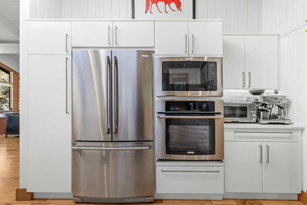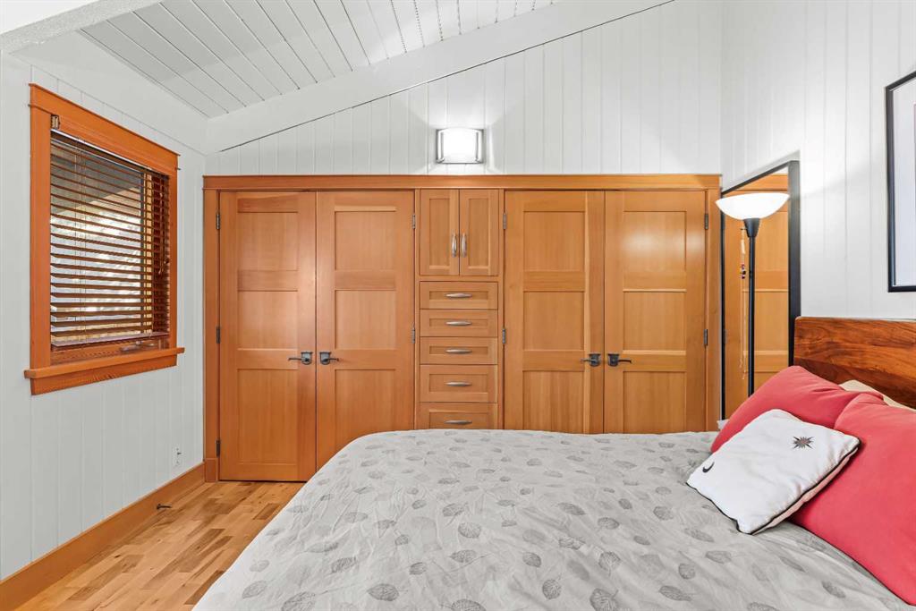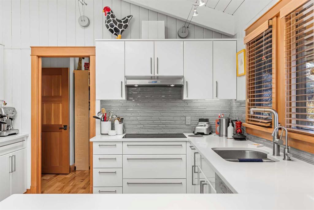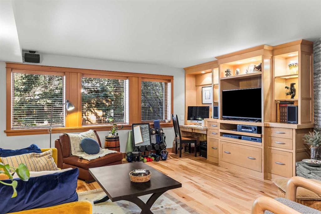 Unique Mountain Modern Four Bedroom Bungalow with Walkout Lower Level with Mountain Views, Loads of Sunshine and Large Private Backyard! Designed by local renowned architect Phillippe Delasalle this home features: Rundle rock foyer; hardwood floors; cedar panelled walls and ceilings; vaulted ceilings with exposed structural wood beams and numerous sky lights; Douglas Fir doors, baseboard, trim, hand railing, and stairs with open risers; custom fir and maple built ins; beautiful custom corner floor to ceiling rock faced wood burning fireplace with wood mantel; recently renovated kitchen with stainless steel appliances and Quartz counter-tops; renovated full four piece bathroom upstairs and three piece bathroom downstairs; cozy gas fireplace in spacious family room walking out to backyard; heated garage and workshop with additional storage; two additional parking spaces outside. This home truly must be seen to be appreciated!