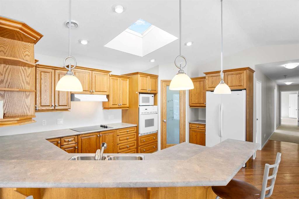 Welcome to effortless living in the highly sought-after 55+ community of Silverlynx Park in the heart of Olds. This beautifully maintained home offers 1,537 sq ft of thoughtfully designed space, combining comfort, functionality, and timeless finishes throughout. Step inside to an inviting open-concept layout highlighted by vaulted ceilings, a skylight, and large windows that flood the home with natural light. The main living area showcases immaculate hardwood floors and rich oak trim, creating a warm and elegant atmosphere. The spacious living room features a stunning corner fireplace with a stone surround and custom oak built-in—perfect for displaying art or mounting your TV—while a large bay window and door frames peaceful views of the greenspace behind. The kitchen is designed for both everyday living and entertaining, offering abundant cabinetry and counter space, a corner pantry, wall oven, and a raised breakfast bar. The adjoining dining area is generously sized and includes a built-in oak cabinet for additional storage, along with direct access to the expansive wraparound deck—ideal for outdoor dining. The primary retreat is impressively sized and features a thoughtfully designed 5-piece ensuite with double vanity, stand-up shower, and a large soaker tub, along with a spacious walk-in closet. A second bedroom provides comfortable accommodation for guests, while a dedicated office offers flexibility for hobbies or working from home. A convenient 2-piece bathroom and a well-appointed laundry room with utility sink and stacked washer/dryer complete the interior. Outside, the wraparound deck offers multiple access points and serene views, perfect for relaxing or entertaining. The oversized single attached garage is insulated, drywalled, and includes a closet space for extra storage space, with an additional paved parking pad out front for extra convenience. Lovingly cared for by the original owner, this home has seen recent updates including fresh paint and newer carpet, ensuring it is truly move-in ready. Silverlynx Park is a vibrant, well-managed 55+ community, and the Town of Olds is known for its welcoming spirit and strong connection to agriculture and prairie living. Enjoy the many amenities Olds has to offer - shopping, restaurants, a sportsplex, fitness centre, swimming pool and so much more! A rare opportunity to enjoy low-maintenance living in a peaceful and friendly setting—this home is ready for its next chapter.