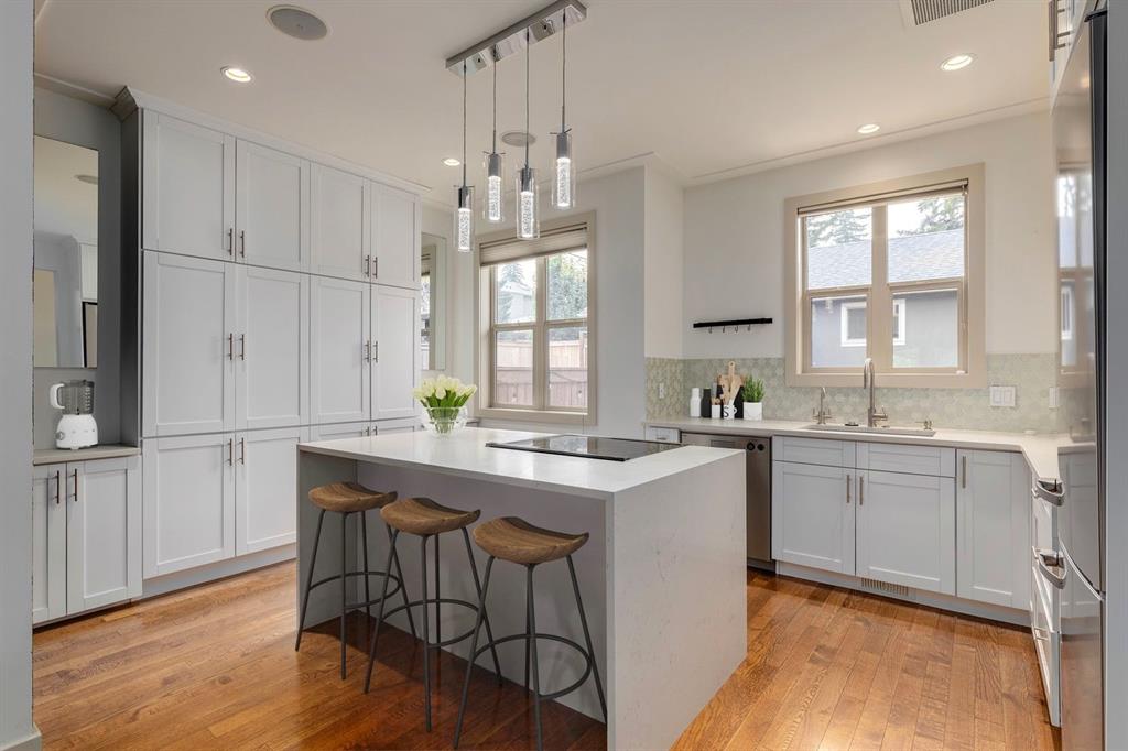 Welcome to 3823 16 Street SW, an exceptional custom-built home located on a quiet, low-traffic street in the highly sought-after community of Altadore. Perfectly positioned across from a beautiful green space and park, this residence combines contemporary design, luxurious finishes, and a thoughtfully curated layout that defines modern inner-city living. From the moment you arrive, you’ll appreciate the west-facing backyard, paved rear lane, and double detached garage, providing both functionality and style. The exposed aggregate patio with gas line for your BBQ or fire table, rock retaining wall, and low-maintenance landscaping create a private outdoor retreat ideal for entertaining or relaxing in the sun. Step inside to discover a bright and open floor plan designed to maximize natural light through large, oversized windows. Soaring 9-foot ceilings, rich hardwood flooring, and high-end window coverings set an elegant tone throughout the main level. The chef-inspired kitchen is truly the heart of this home — featuring sleek full-height white cabinetry, quartz countertops, a Sub-Zero 7-foot wine fridge, Butler’s station, and a massive island with waterfall edge. Whether hosting a dinner party or preparing a casual meal, this kitchen offers both form and function with premium appliances and seamless flow. The living area is anchored by a modern gas fireplace, creating a cozy yet sophisticated atmosphere. The adjoining dining area and sitting space allow for effortless entertaining, while thoughtful details such as built-in shelving, central air conditioning, and a built-in central vacuum system add to the convenience and comfort. Upstairs, you’ll find three spacious bedrooms, including a stunning primary suite with spa-like en suite — featuring double sinks, glass-enclosed shower, freestanding tub, and walk-in closet with custom organizers. Every detail has been designed with luxury in mind. The fully finished basement continues the high-end feel with in-floor heating, a fourth bedroom, full bathroom, and a versatile family or media room perfect for movie nights or a home gym. With four bedrooms and three and a half bathrooms, this home offers over 2,600 square feet of beautifully finished living space. Modern lighting, clean architectural lines, and timeless finishes ensure this home will impress for years to come. Located steps to Altadore Park, River Park, and Marda Loop’s boutique shops, restaurants, and cafes, this is a prime inner-city address offering the perfect blend of tranquility and convenience. Quick access to downtown, top-rated schools, and major routes make this an unbeatable location. Experience luxury, comfort, and impeccable design in one of Calgary’s most desirable communities.