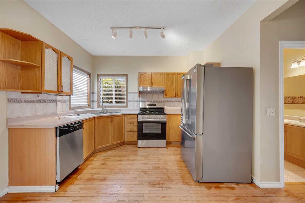 Exceptional value! Fully finished 2-storey home with a heated double detached garage, located on a quiet cul-de-sac in the community of Monterey Park. This property offers a convenient location close to schools, parks, public transportation, the Monterey Park Wetlands, Rotary Mattamy Greenway walking paths, and a variety of amenities. Recent updates include a newer asphalt shingle roof (2023), central air conditioning, and newer modern stainless steel kitchen appliance package. The main floor features 9-foot ceilings, large windows, and a cozy living room with a central gas fireplace. The kitchen is fitted with oak cabinetry and flows into a bright dining nook with patio doors that lead to a west-facing, fully fenced, and landscaped backyard—ideal for outdoor enjoyment. Upstairs, the primary bedroom includes a walk-in closet and a 3-piece ensuite. A second spacious bedroom and a 4-piece main bathroom complete the upper level. The fully finished basement offers a large family/games room with a second gas fireplace, an additional bedroom or den, and generous storage space. The oversized double detached garage is fully insulated and heated with its own gas furnace, providing excellent utility year-round. Additional features include a central vacuum system and a natural gas BBQ hookup. This home offers great potential in a family-friendly neighborhood.