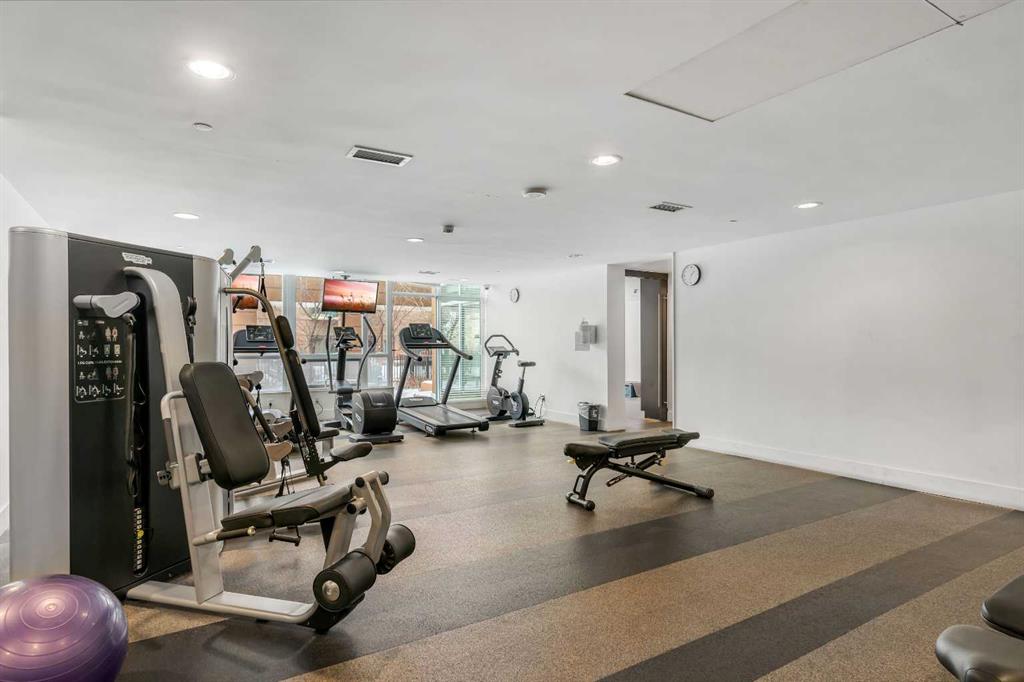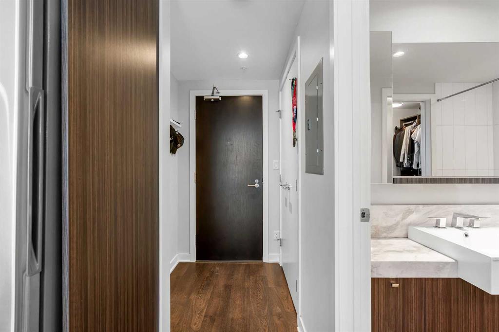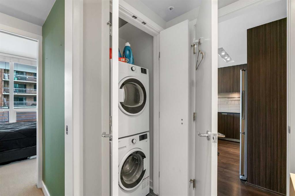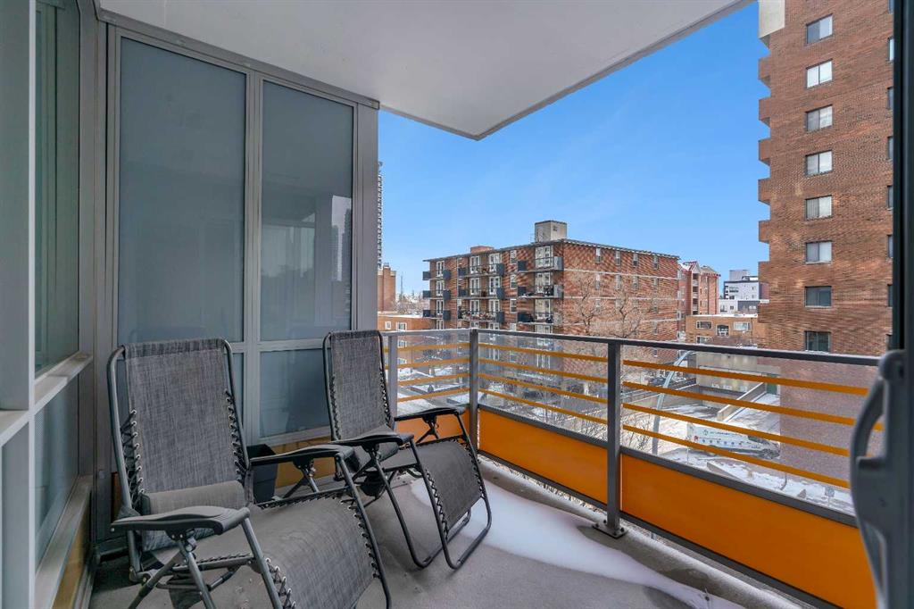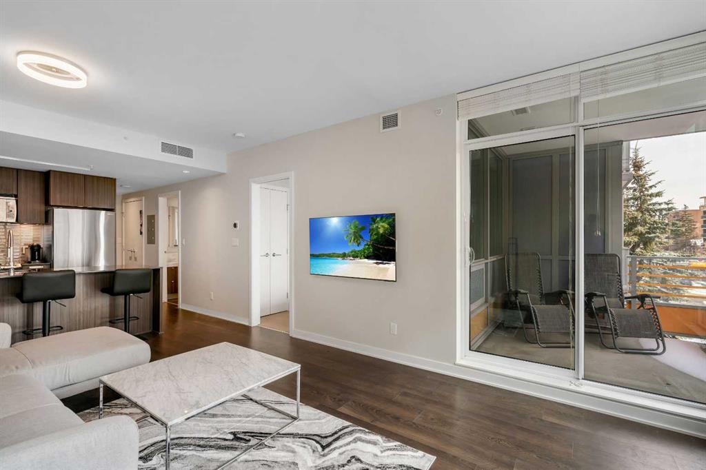Welcome to Unit 407 in Calla, a beautifully appointed one bedroom plus den in the heart of Calgary’s vibrant Beltline, perfectly positioned next to Lougheed House and just steps from the shops, restaurants, and nightlife of 17th Avenue SW. This stylish condo offers central air conditioning and an upgraded kitchen featuring quartz countertops, full height cabinetry, and modern finishes that blend elegance with everyday functionality. The open concept layout flows seamlessly into the bright living area, complete with durable vinyl plank flooring and large windows that flood the space with natural light. Step out onto the south facing balcony, an ideal spot to enjoy your morning coffee or unwind in the evening. The primary bedroom features a walk through closet that leads to a well appointed four piece cheater ensuite, while the versatile flex space is perfect for a home office or den. Additional highlights include in suite laundry, one titled underground parking stall, and a separate storage locker. Residents of Calla enjoy premium amenities including a well equipped fitness centre, yoga studio, sauna, and guest suite. With elevated finishes, thoughtful design, and an unbeatable inner city location, this home offers the very best of urban living.