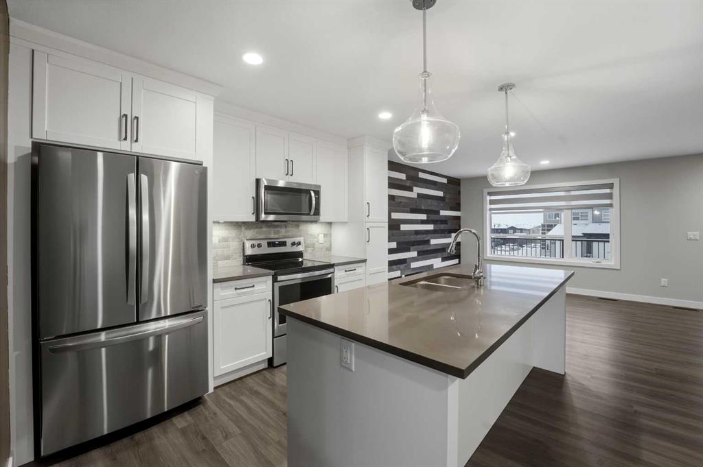 Welcome to this move-in ready townhouse in Ryders Ridge, Sylvan Lake! This beautifully maintained, fully developed property offers three finished levels, no condo fees, and incredible value. The ground level offers a large, versatile space that works as a family room or 4th bedroom. This level also includes a 4-pc bathroom and access to front attached heated garage. You’ll love the open-concept layout of the main floor that features a modern kitchen with stainless steel appliances, a large island, quartz countertops, tile backsplash and gorgeous white cabinetry with plenty of storage. The bright family room opens onto a zero-maintenance balcony with beautiful Sylvan Lake views. A convenient 2-pc bathroom with in-suite laundry is tucked behind a barn door. Off the dining room, patio doors lead to the fully fenced and landscaped yard that backs onto open fields. Ideal for privacy and those stunning Alberta sunsets. Upstairs, features three generous bedrooms. The primary bedroom is exceptionally spacious and includes its own 3-pc ensuite. A third 4-pc bathroom serves the remaining two bedrooms, offering comfort and convenience for families or roommates. Located in one of Sylvan Lake’s most sought-after, family-friendly neighbourhoods, this home puts you close to everything: parks, walking trails, playgrounds, and several excellent schools, including École Mother Teresa School and H.J. Cody High School. You’re just minutes to shopping, restaurants, and quick access to Highway 20, making commuting a breeze. Additional features include: Central A/C & Water Softener If you're looking for a beautifully updated, low-maintenance, move-in ready home in Sylvan Lake, this Ryders Ridge townhome offers the perfect mix of comfort, convenience, and lifestyle.