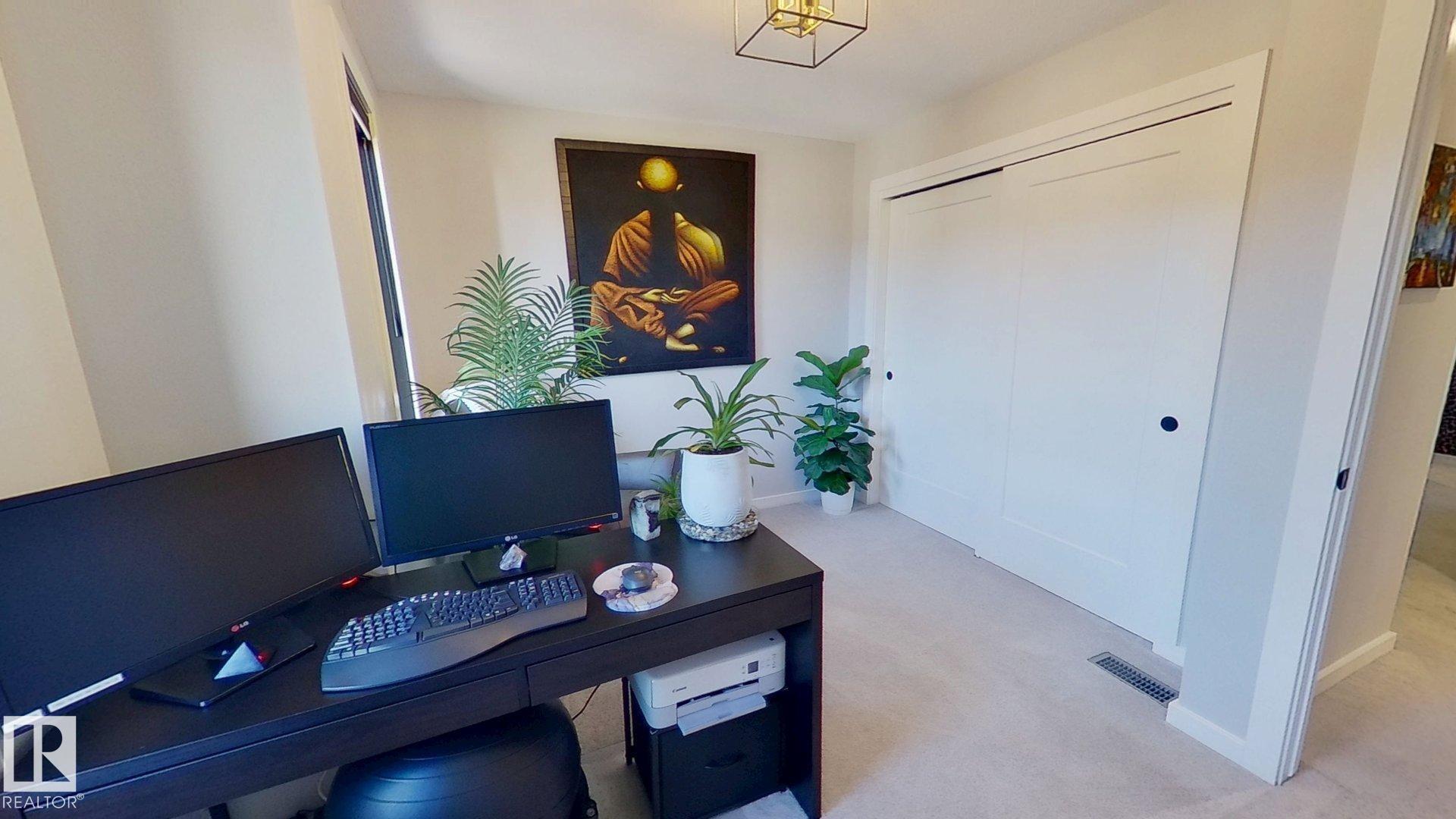 Welcome to maintenance free living in Pivot at Rutherford. This immaculate 1,872 sq. ft. home features a tandem 4 car garage and over 1,100 sq. ft. of tranquil outdoor patio space over 3 levels. Customizations include a beverage center, tile accents, upgraded mirrors and lighting in all bedrooms & bathrooms with feature walls throughout. Laundry is located on the upper level for your convenience. The main level boasts power blinds, with each bedroom having blackout blinds for your sleeping comfort. Kitchen includes top of the line appliances with granite counter tops and oversized island. Open riser staircases provide an airy feel. Enjoy a private viewing of some of Edmontons best sunsets from your fabulous rooftop patio. This property backs onto a forested area with natural walking trails. Schools and a newly developed hockey rink are just a 2 minute walk away. Don't miss this opportunity to own a luxury property with the convenience of urban amenities embeded in serene nature scapes.