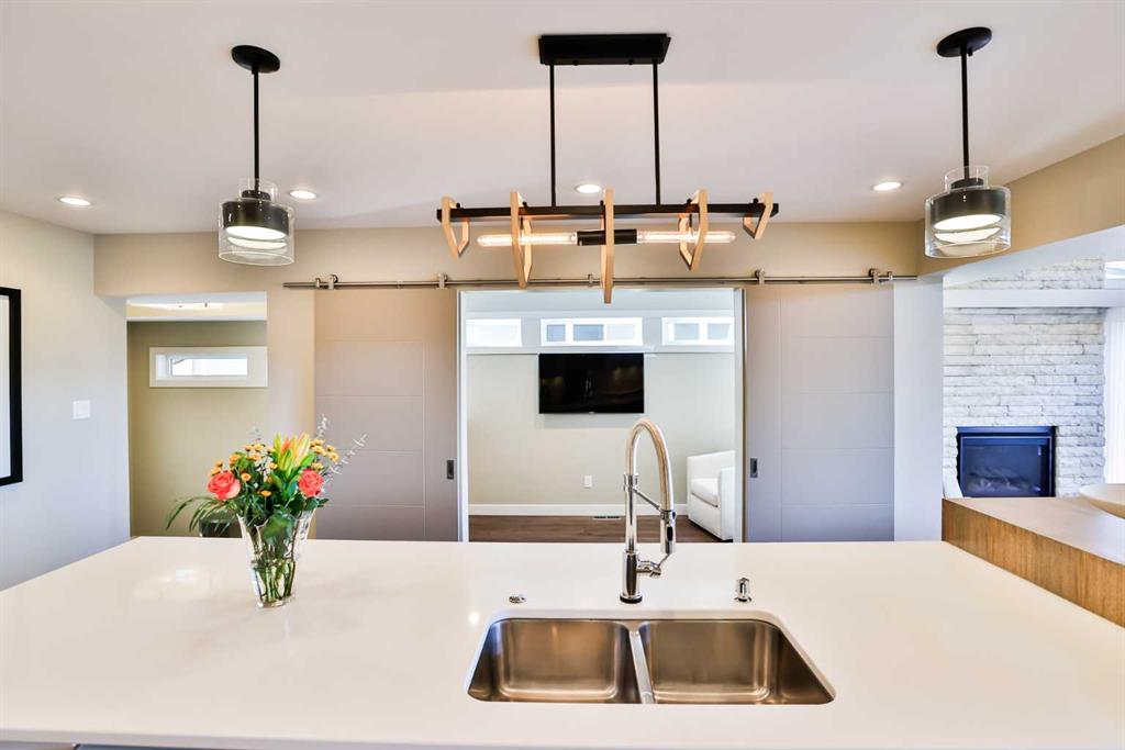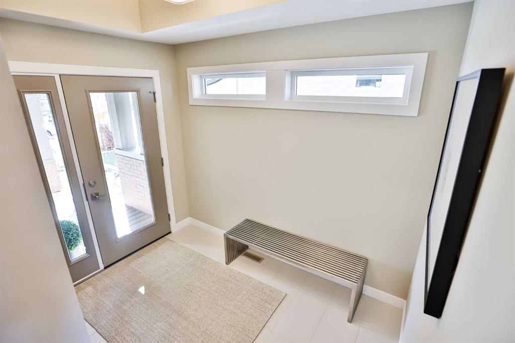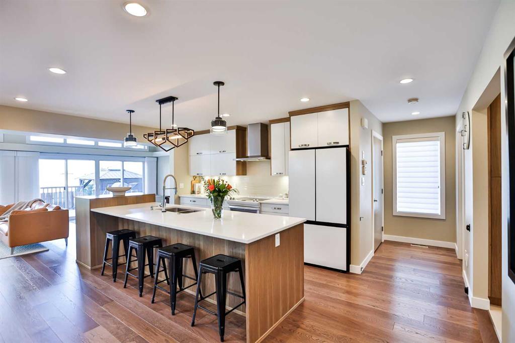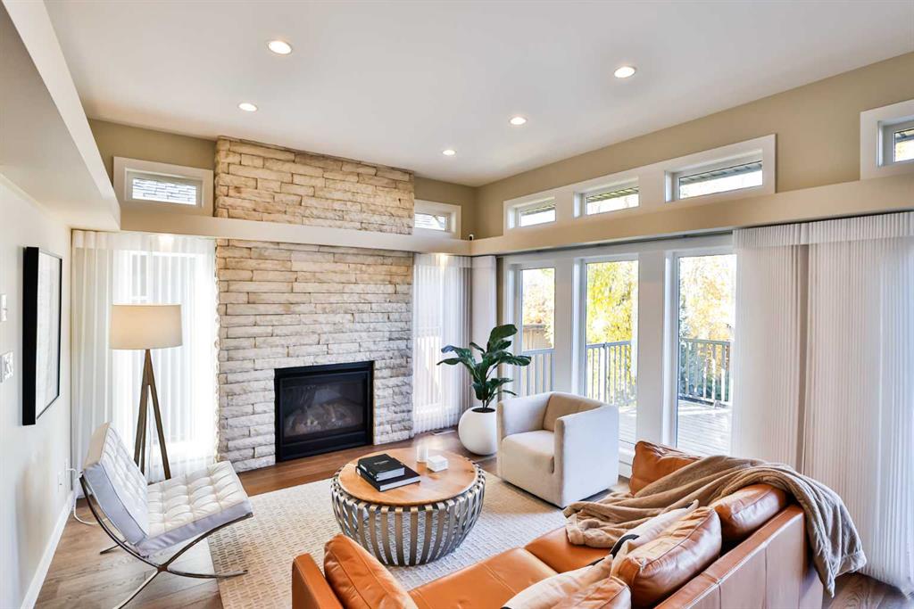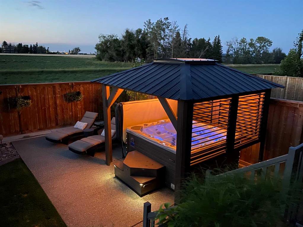 This modern masterpiece embodies luxury without compromise. From the moment you arrive, it’s clear that no detail has been overlooked and no expense spared. Clean architectural lines, expansive windows, and seamless indoor-outdoor living set the tone for a home that’s equal parts style and substance. The exterior features durable Hardy board siding and a beautifully detailed vestibule entryway that welcomes you inside. Coffered ceilings, a step-up to stunning engineered hardwood floors, and a sleek white quartz kitchen with two-tone modern cabinetry make an immediate impression. Gold-accented Whirlpool appliances in ice white complement the cabinetry, while a built-in modern china cabinet with interior lighting anchors the island and provides stylish separation. Off the kitchen, double sliding doors open to a versatile flex space—perfect for a home office, lounge, or playroom—complete with built-in cabinetry and a temperature-controlled wine fridge. The rear entry showcases a custom coffee bar, built-in cabinetry, and roll-out pantry drawers, making for an ideal prep and storage area. A tucked-away powder room features stunning wallpaper for a touch of drama, and the unfinished basement offers room for additional bedrooms, a bathroom, and a large family space. The living room impresses with 10-foot ceilings, bulkhead detailing with striking window coverings ($15,000) and floor-to-ceiling limestone rockwork surrounding a gas fireplace. Oversized windows and patio doors bring the outdoors in, leading to a large rear deck with aluminum railing, natural gas hookup, and beautifully landscaped yard. Features include underground sprinklers, decorative curbing, exposed aggregate, and a eight-person hot tub beneath a charming pergola—your private backyard oasis. An extra-wide staircase with photo-sensor lighting leads to the upper level, where 10-foot ceilings in the bonus room and a skylight flood the space with natural light. Two spacious front bedrooms, a large main bath, and second-floor laundry add everyday convenience. The primary suite is a true retreat, set apart by a custom glass-railed staircase and modern crown molding with pot-light detailing. A walk-in closet and two custom built-ins provide abundant storage. The spa-inspired ensuite features a double floating vanity, water closet, exquisite glass-tiled shower with dual heads, and heated floors for year-round comfort. Additional highlights include a dual-furnace system, gemstone exterior lighting (front and back), garburator, soft-close toilets, central vacuum, humidifier, and extensive lighting upgrades. The heated, oversized epoxy-floored garage offers ample storage and built-ins. Located in desirable Sixmile, this exceptional home offers easy access to Southside amenities and feels like a show home that’s just been built and READY FOR YOU TO MOVE INTO!