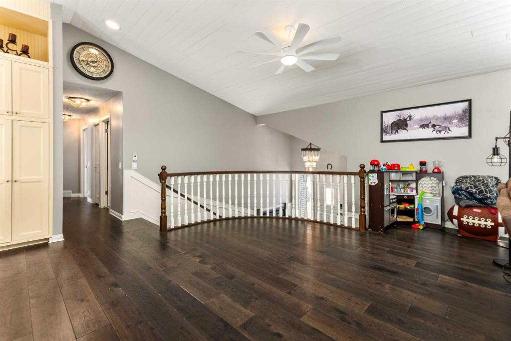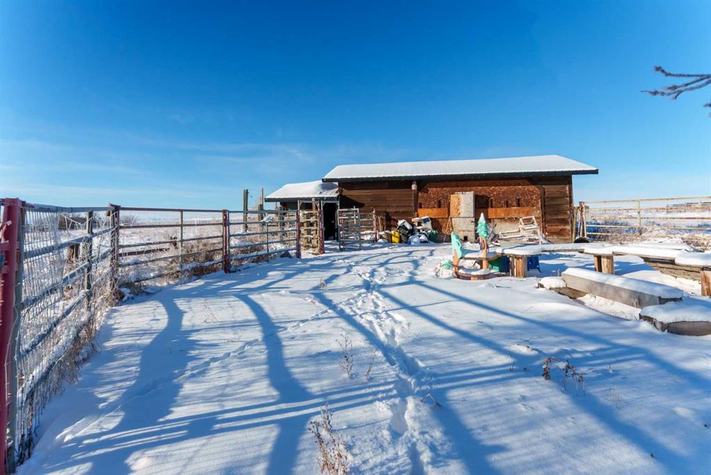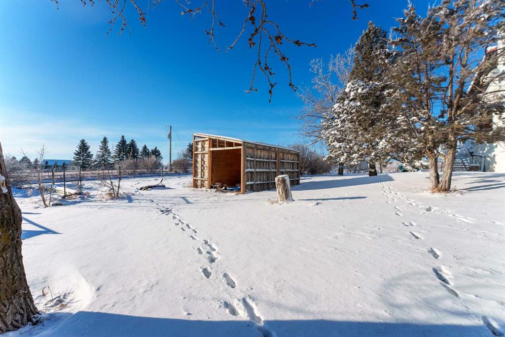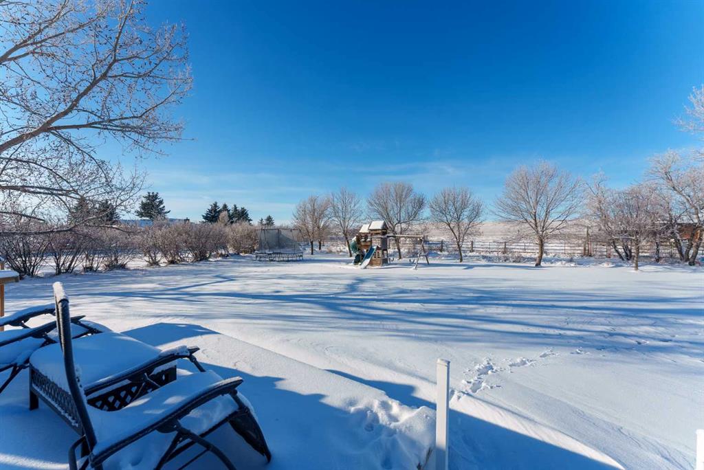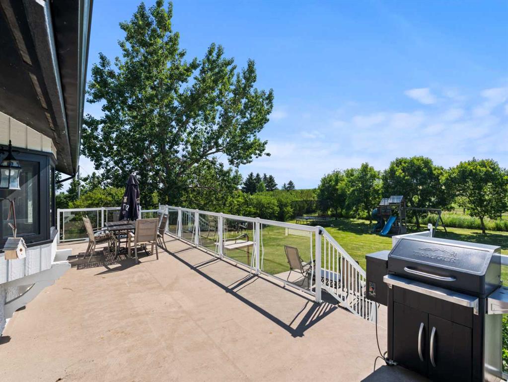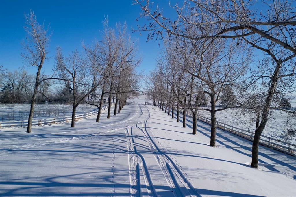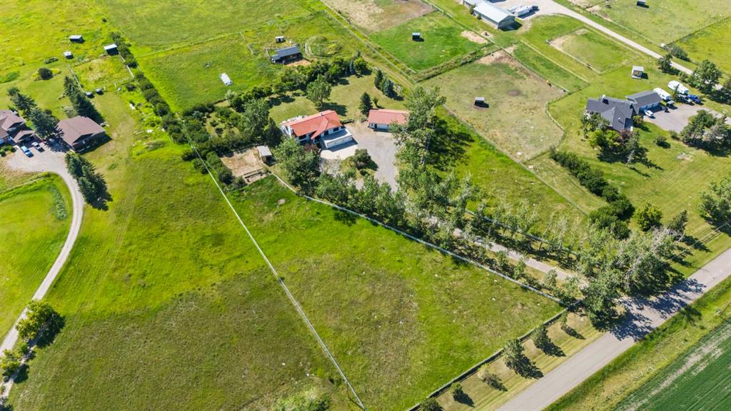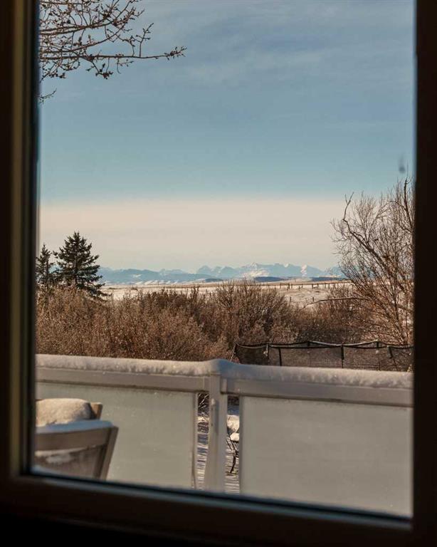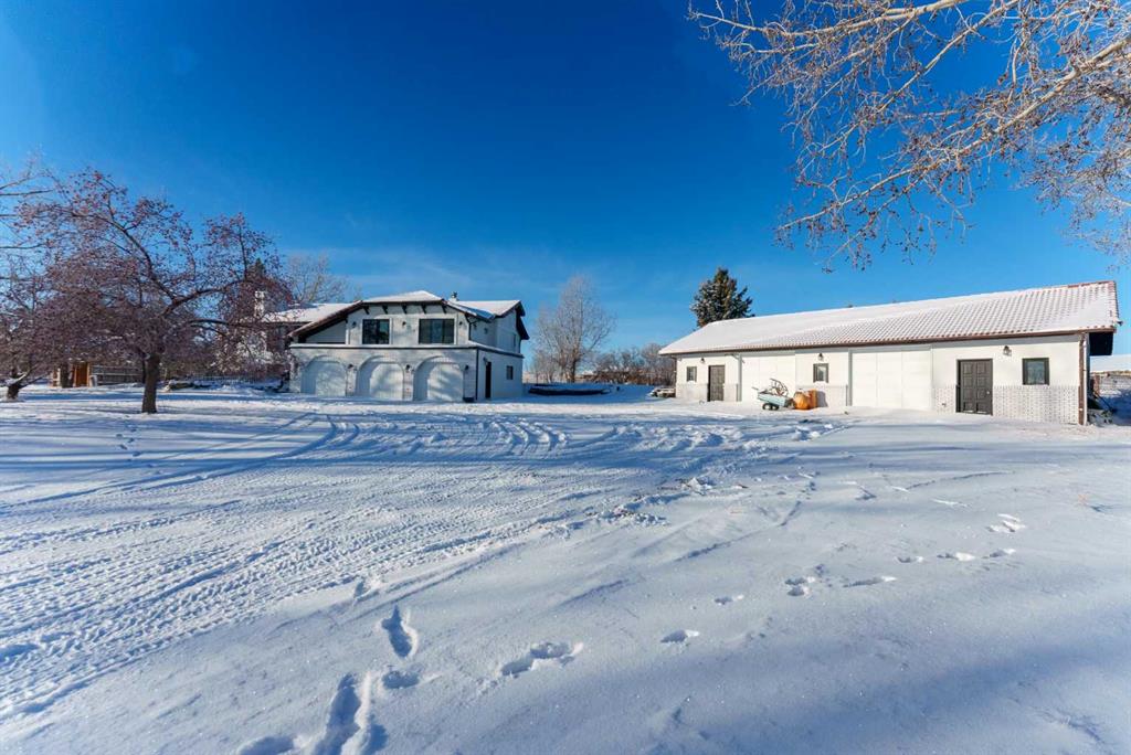 This exceptional 5-bedroom, 3-bath residence offers over 4,000 sq ft of beautifully appointed living space. It sits on 5 acres with sweeping mountain views and is set up for horses. Highlights include: extensive 2018 renovations, air conditioning, soaring ceilings, two fire places and a triple oversized garage. A striking entry with a curved staircase leads to a sun-filled living room featuring vaulted open-beam ceilings and a dramatic floor-to-ceiling stone wood-burning fireplace. The dining area opens to a west-facing deck, ideal for entertaining. The bright chef’s country kitchen is designed for gatherings, showcasing an oversized island, quartzite countertops, farmhouse sink, bar fridge, 6-burner gas range, and custom floor-to-ceiling cabinetry concealing the fridge/freezer. The spacious primary suite offers a walk-through closet and a spa-inspired 5-piece ensuite with a clawfoot tub. The walk-out lower level provides an inviting family retreat with fireplace, wet bar, generous entertaining space, two additional bedrooms, and a laundry/mudroom with garage access. The property features mature trees, garden or orchard areas, chain-link and pipe fencing, cross-fencing, a small barn, two stock waters, and a workshop. Perfect for a large family and entertaining, this exceptional home offers country living at its finest—just minutes from all amenities as it is conveniently situated between Okotoks and High River.