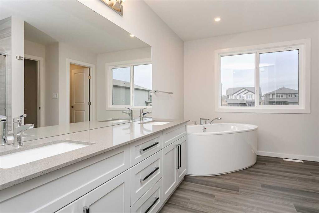 Welcome to this Bedrock Homes quick possession, ideally located on a premium corner lot in the vibrant Heartwood community of SE Calgary. Offering over 2,500 sq ft of thoughtfully designed living space, this home features a central flex room perfect for a home office or guest area, and a striking open-to-below staircase that fills the home with natural light. The chef’s kitchen is equipped with built-in microwave, chimney hood fan, and a large island that opens to the dining area and great room—ideal for entertaining. A 50” electric fireplace adds warmth and style, while metal spindle railings and custom melamine shelving elevate the finish throughout. Upstairs, enjoy a spacious bonus room and retreat to the luxurious primary bedroom featuring a freestanding tub, tiled shower, dual sinks, and private water closet. Complete with a walk-through mudroom and pantry and double attached garage, this home offers exceptional comfort, design, and location close to amenities and parks. Photos are representative.
