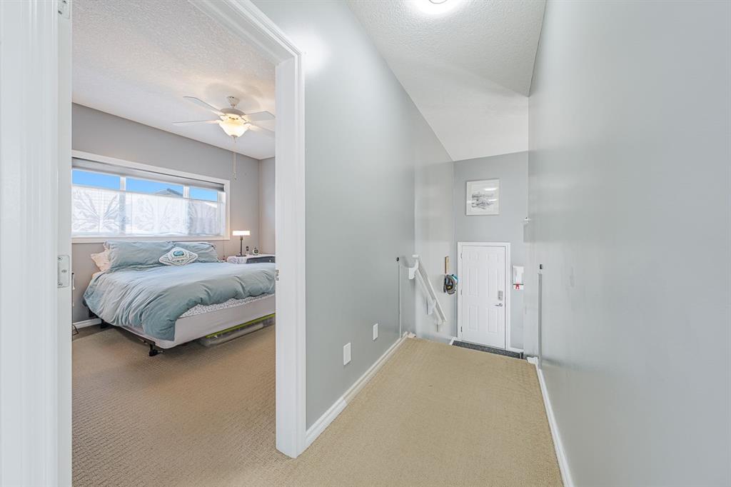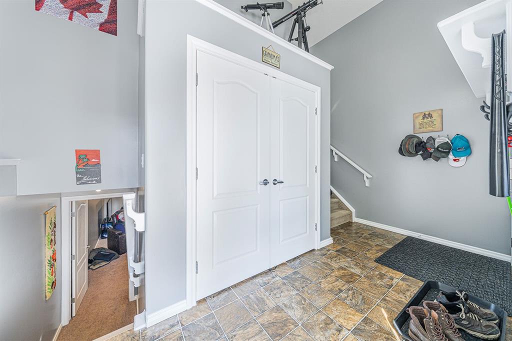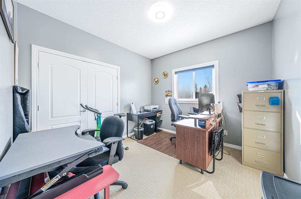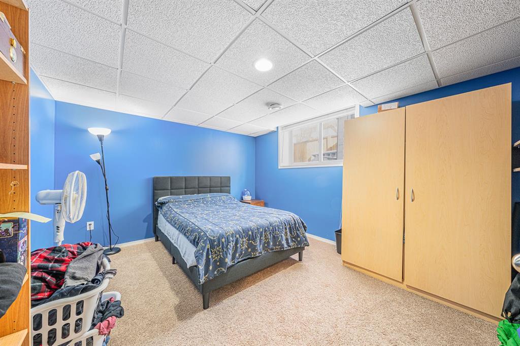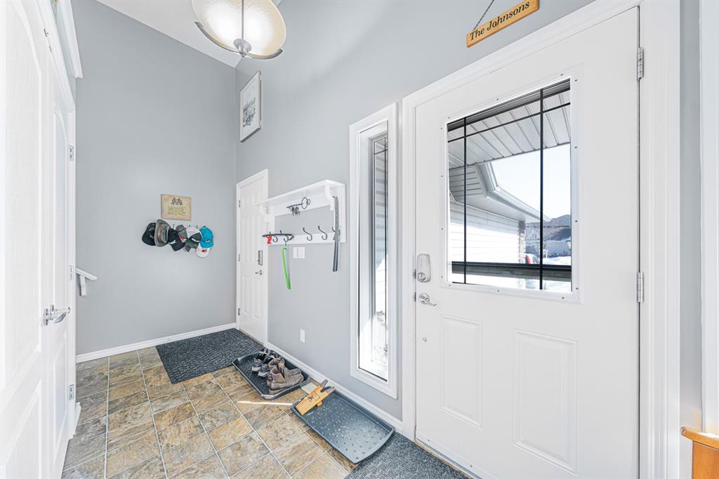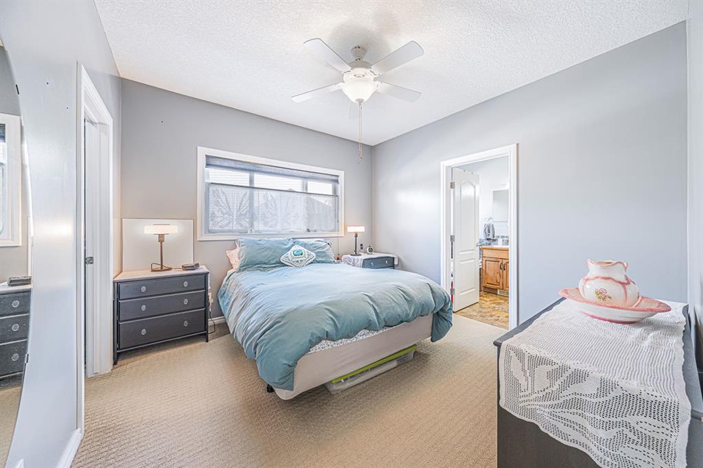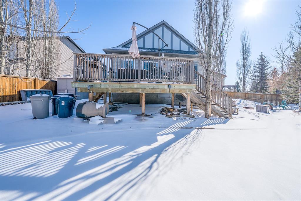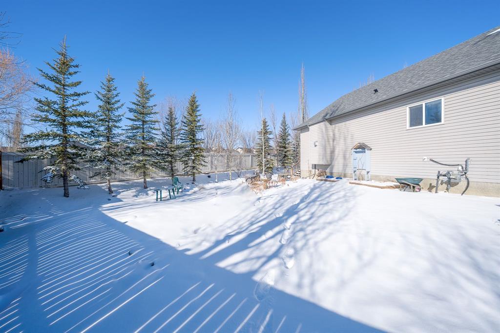 Situated on a pie lot in the lake community of Crystal Shores, this home offers a total of 3 bedrooms, 2 full bathrooms and nearly 2000 sq ft of developed living area. The main level features a great room with easy to care for laminate flooring and a warm, cozy fireplace. The eat-in kitchen boasts a corner pantry, full height tiled backsplash, black appliances and island with eating ledge, pendant lighting & built-in wine rack. Access to the deck is found through the sliding doors off the breakfast nook. Completing this level are 2 bedrooms including the master retreat with walk-in closet and convenient 4 pc ensuite bath. Basement development includes an incredibly spacious rec room, office niche, 3rd bedroom and storage area. The back yard offers a park like setting with tastefully landscaped flower beds, bushes and mature trees. Located near schools, within walking distance to the Crystal Ridge Golf Club and with lake access privileges, this home is ideal for a growing family.