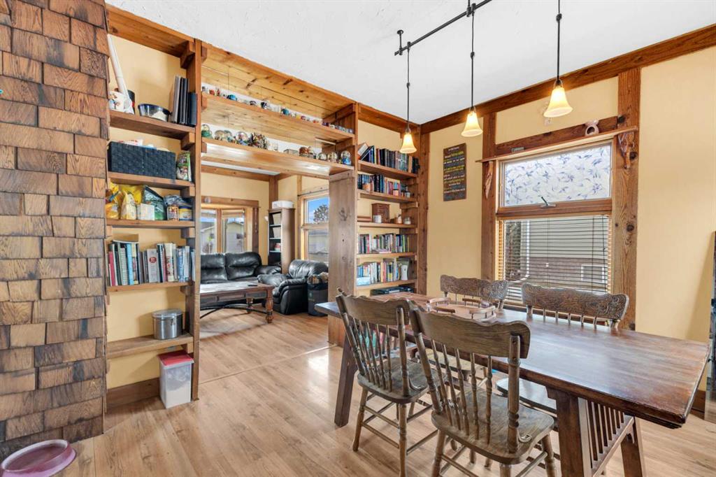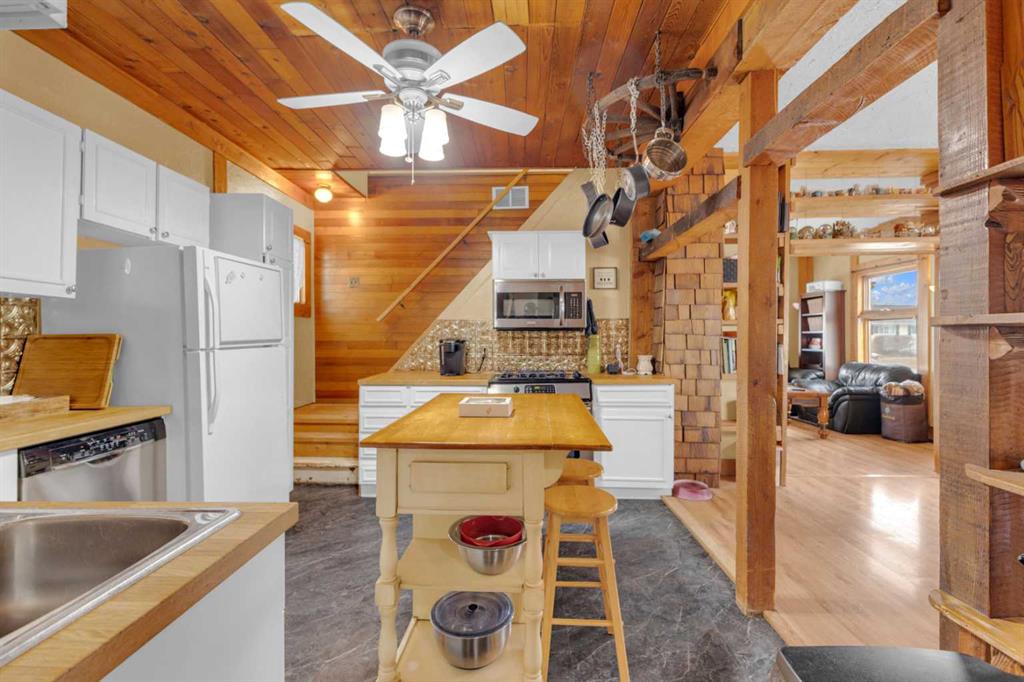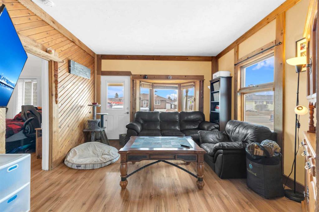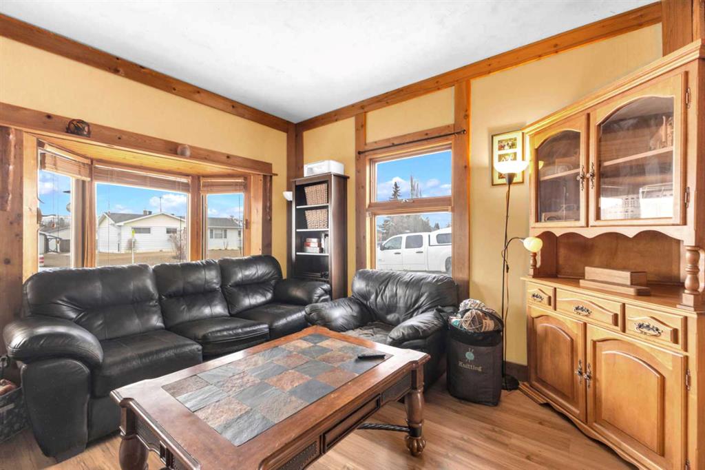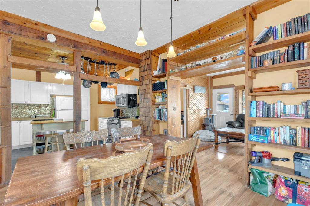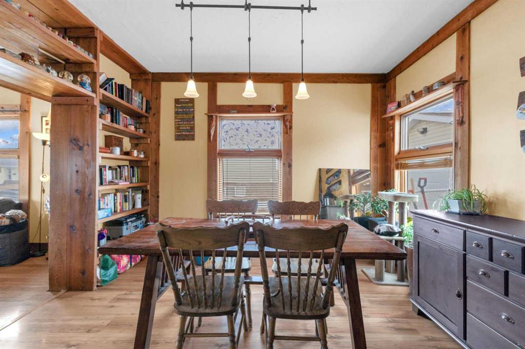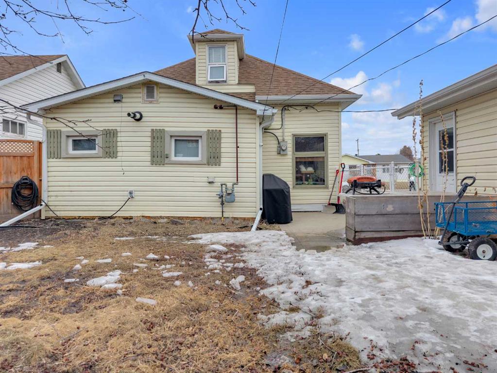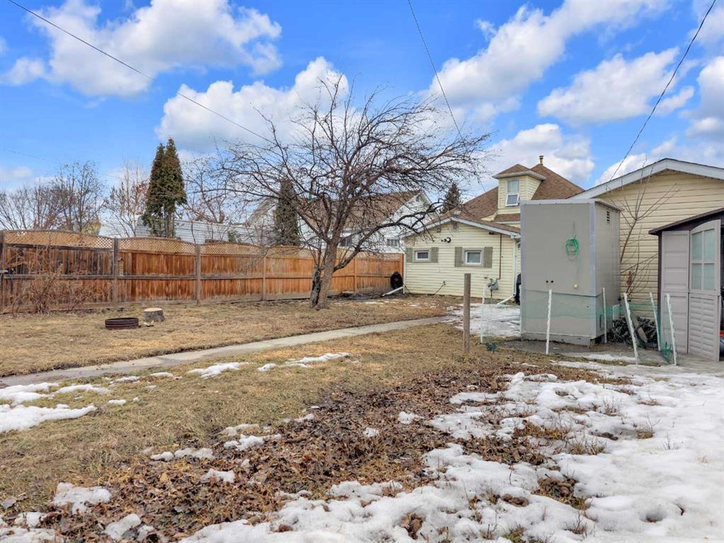 Charm, character, and over a century of Lacombe history — this 1920 one-and-a-half storey is one of a kind. Sitting on a mature double lot in the heart of Downtown Lacombe, it offers the kind of setting that is simply not replicated in newer neighbourhoods: a covered front porch framed by established trees, a fenced yard with flowering and apple-producing trees, and a neighbourhood you can walk from. Inside, the home features beamed ceilings, a practical main floor layout with a good-sized kitchen, dining room, and living room, main floor laundry, and the primary bedroom all on the main level. The upper loft offers a generous second bedroom. A full bathroom completes the main floor. Updates over the years include new roof and eavestroughs on both the house and garage, some new windows, a refreshed kitchen with new cupboards, countertop, and backsplash, an updated electrical box, and in-floor heat and tile in the back entry and bathroom. All appliances are included. Outside, the 50 x 120 lot provides plenty of room to breathe. A detached single garage (14 x 22), a fenced backyard, extra parking, and a deck round out the property. Parks, schools, a playground, and the full amenities of downtown are all close by. A perfect starter home, a smart revenue property, or a place for anyone who appreciates the character and craftsmanship of a true Lacombe original.