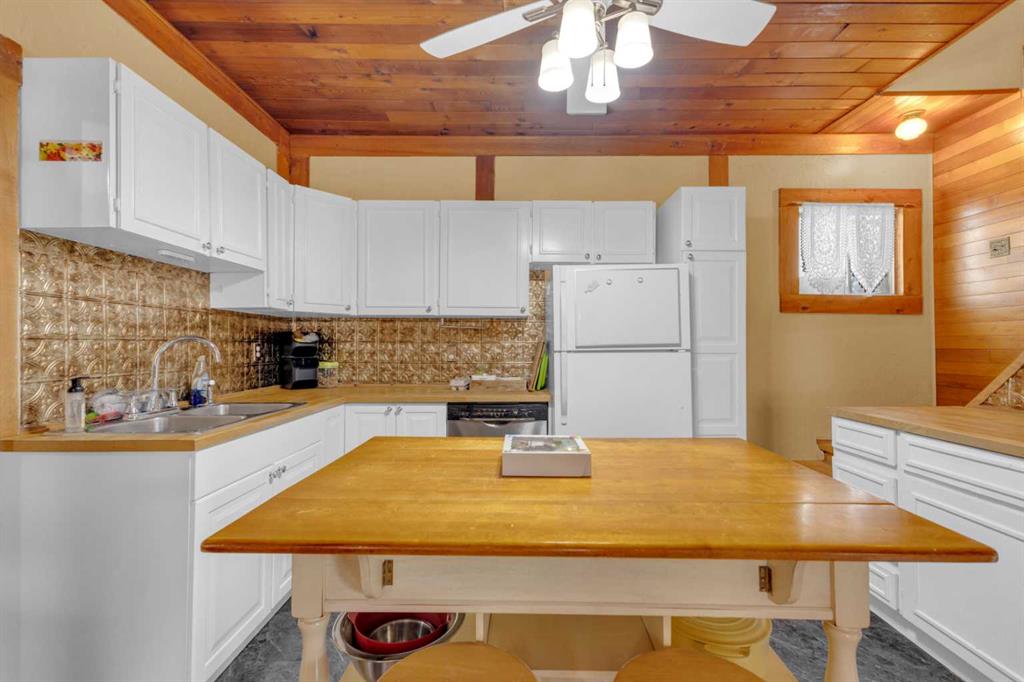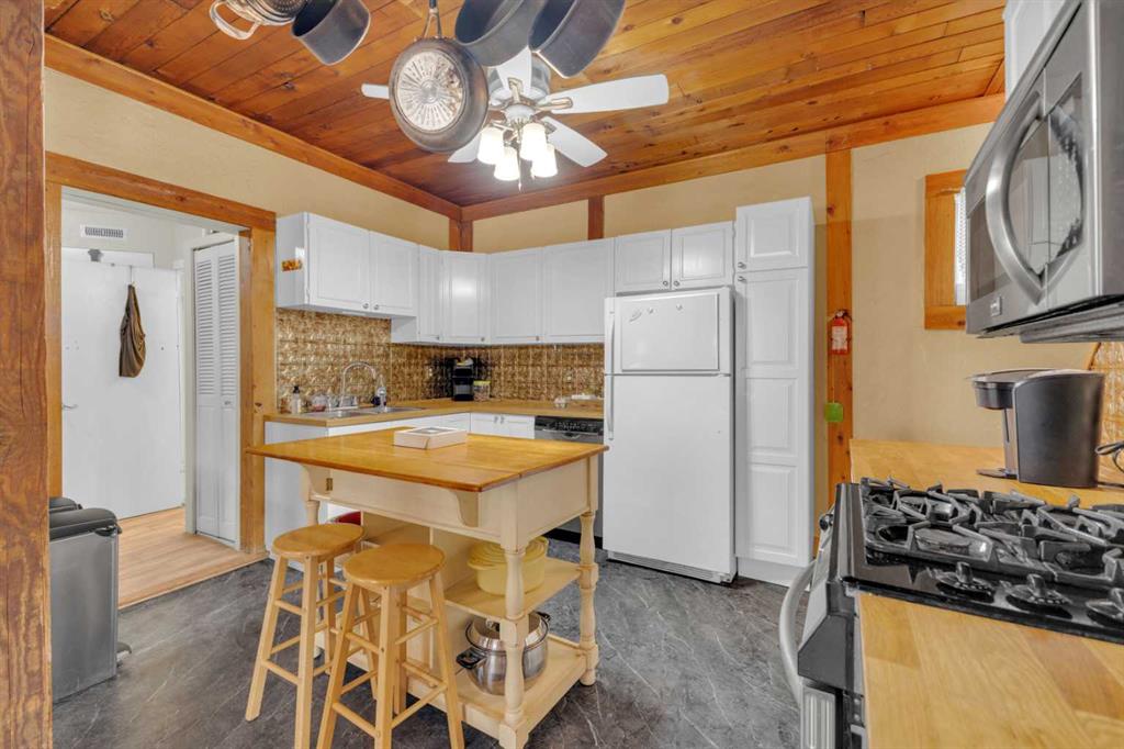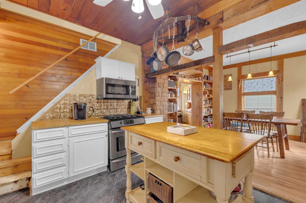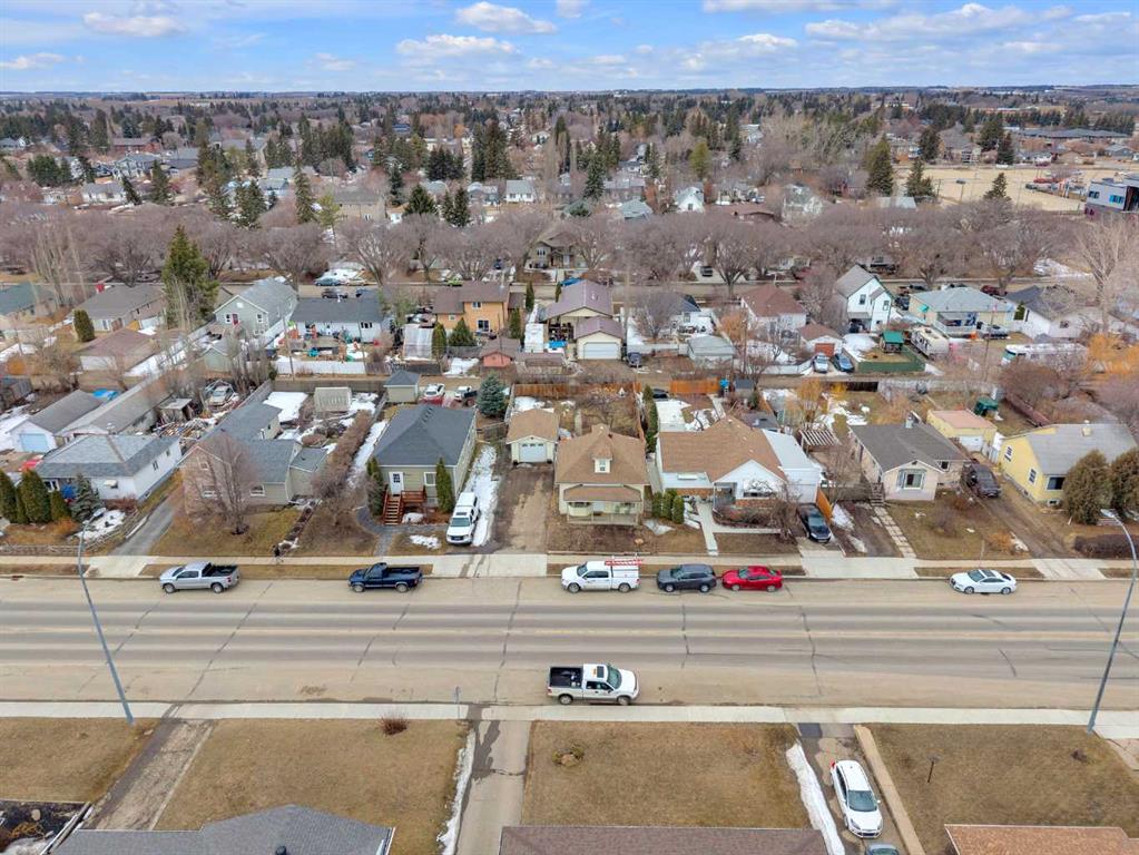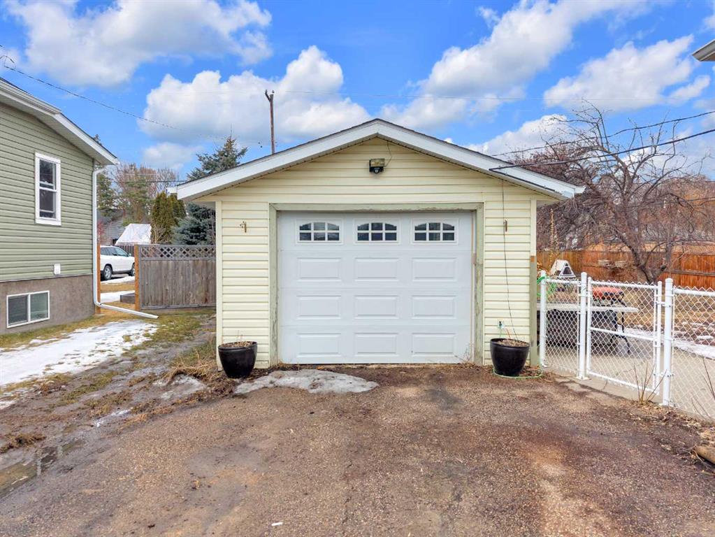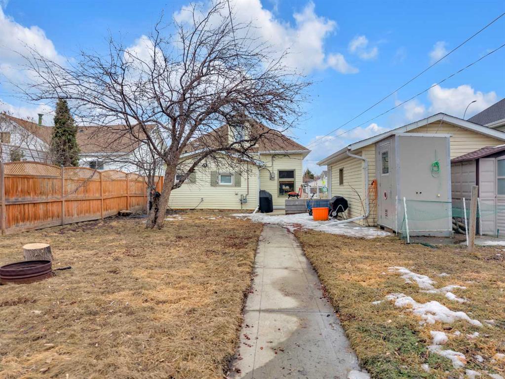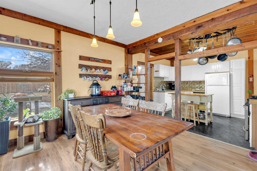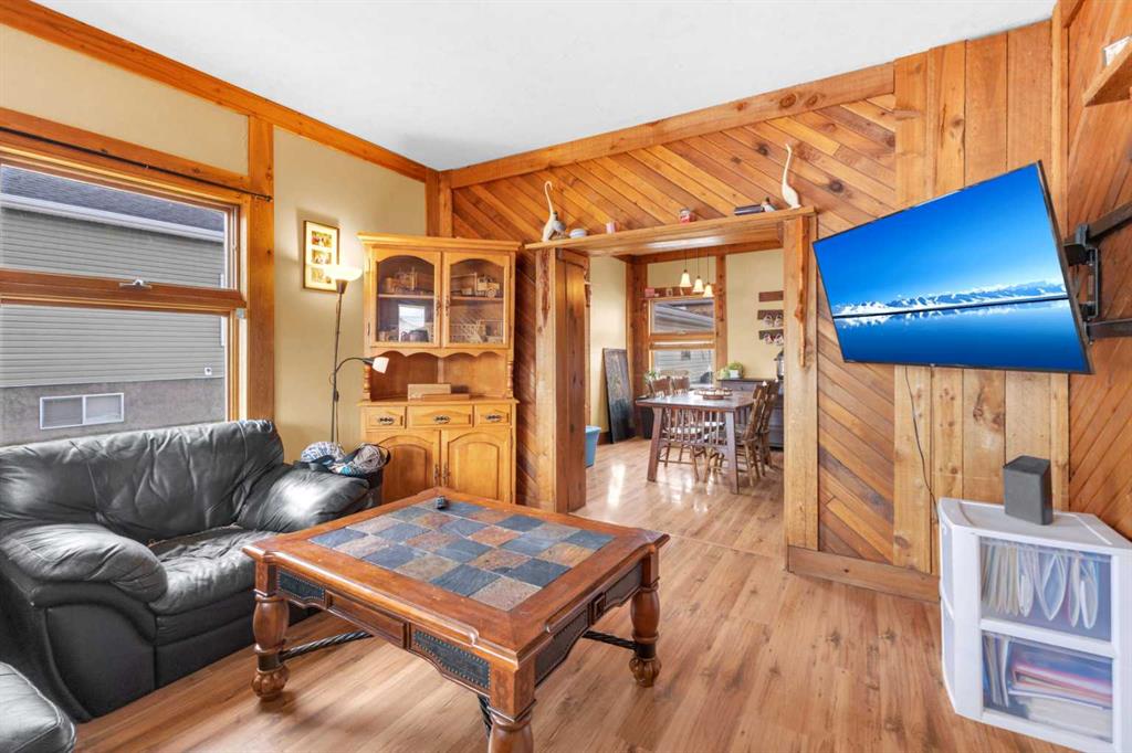 Charm, character, and over a century of Lacombe history — this 1920 one-and-a-half storey is one of a kind. Sitting on a mature double lot in the heart of Downtown Lacombe, it offers the kind of setting that is simply not replicated in newer neighbourhoods: a covered front porch framed by established trees, a fenced yard with flowering and apple-producing trees, and a neighbourhood you can walk from. Inside, the home features beamed ceilings, a practical main floor layout with a good-sized kitchen, dining room, and living room, main floor laundry, and the primary bedroom all on the main level. The upper loft offers a generous second bedroom. A full bathroom completes the main floor. Updates over the years include new roof and eavestroughs on both the house and garage, some new windows, a refreshed kitchen with new cupboards, countertop, and backsplash, an updated electrical box, and in-floor heat and tile in the back entry and bathroom. All appliances are included. Outside, the 50 x 120 lot provides plenty of room to breathe. A detached single garage (14 x 22), a fenced backyard, extra parking, and a deck round out the property. Parks, schools, a playground, and the full amenities of downtown are all close by. A perfect starter home, a smart revenue property, or a place for anyone who appreciates the character and craftsmanship of a true Lacombe original.