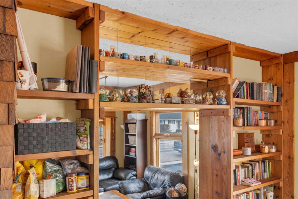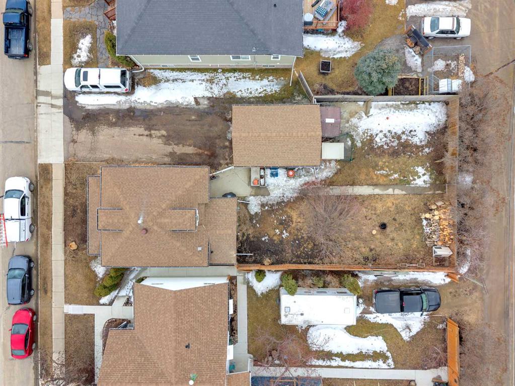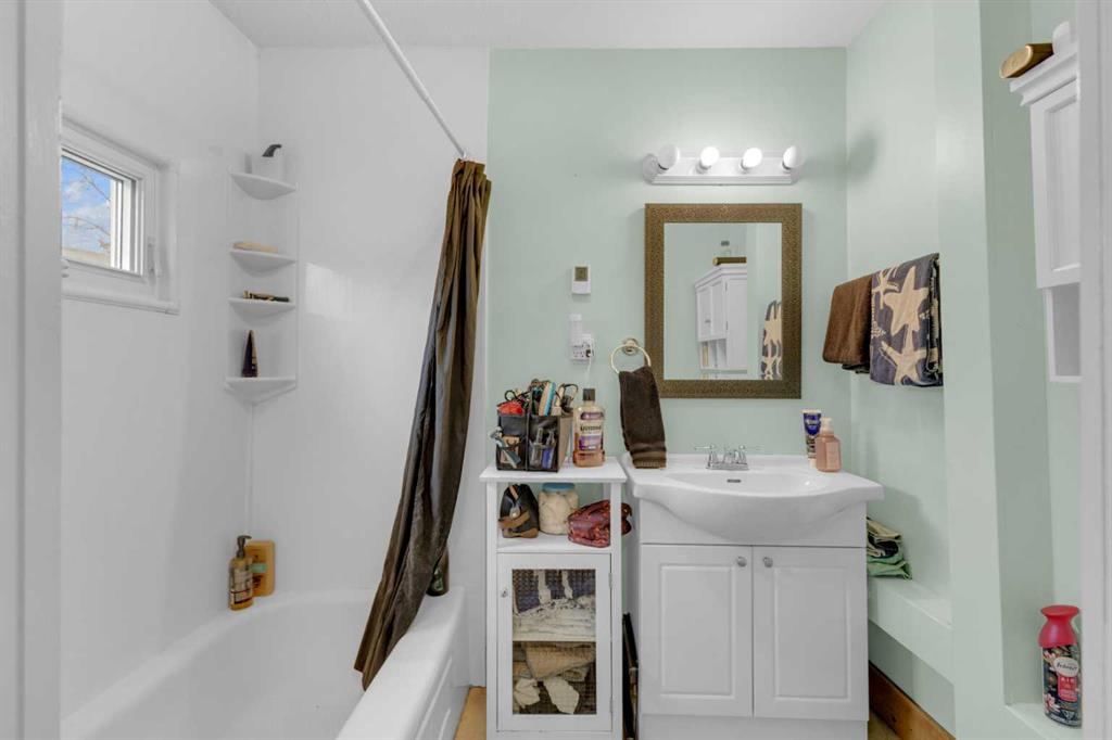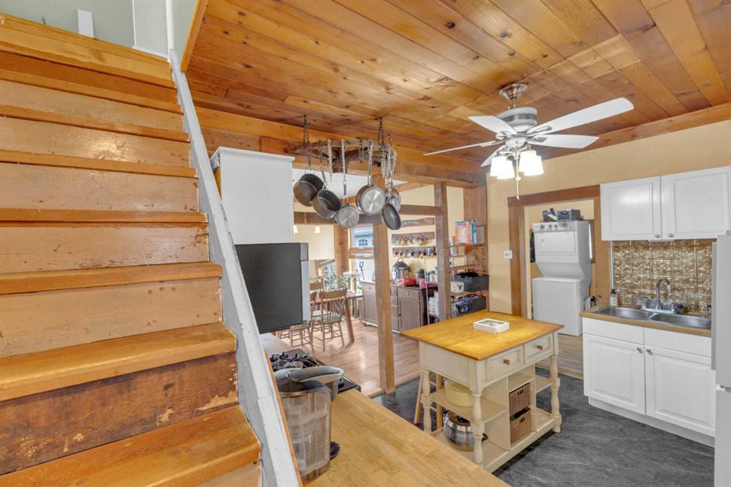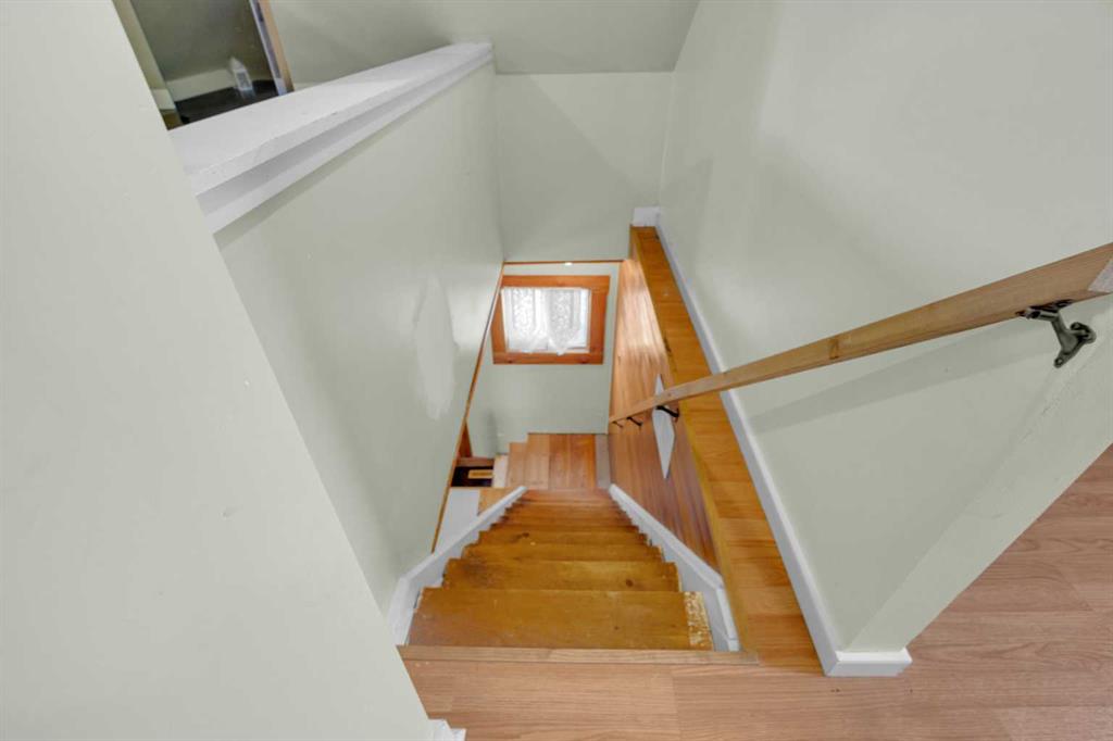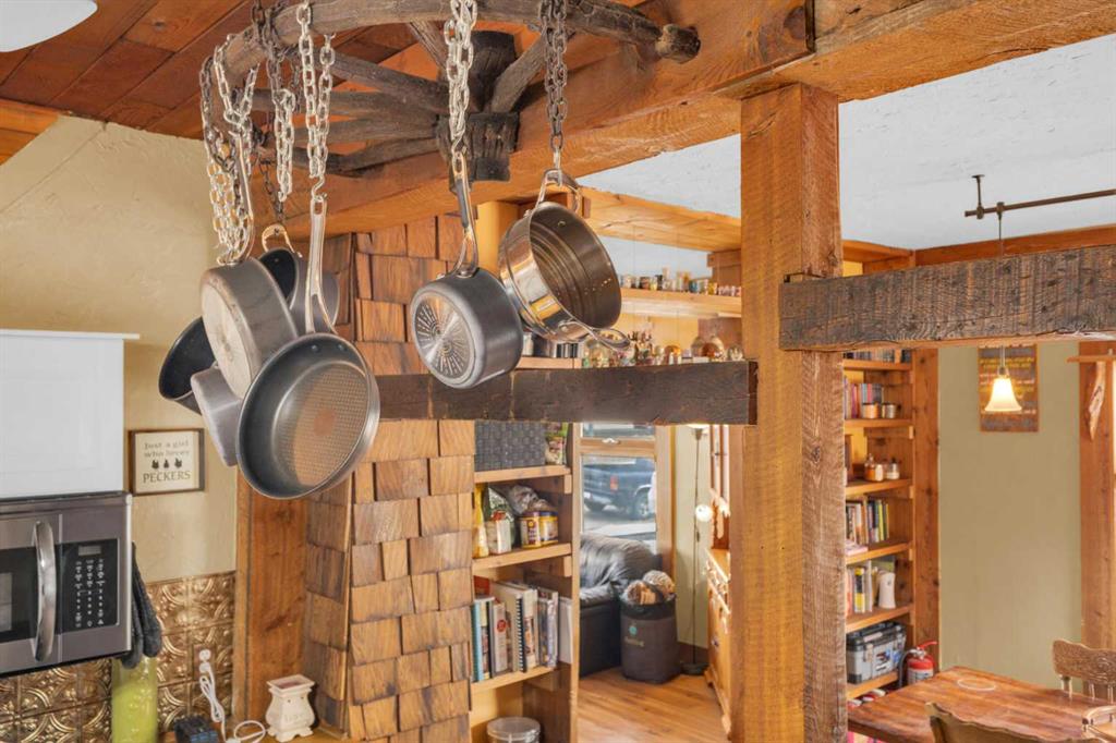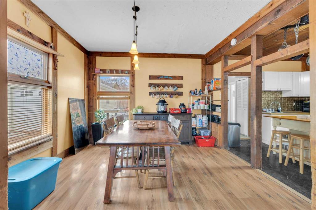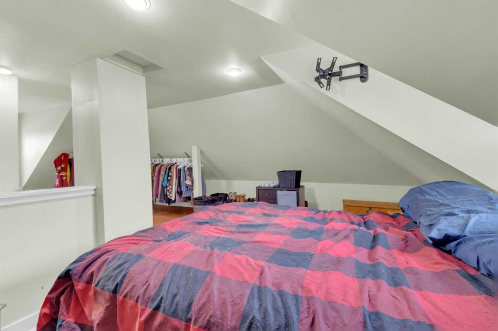 Charm, character, and over a century of Lacombe history — this 1920 one-and-a-half storey is one of a kind. Sitting on a mature double lot in the heart of Downtown Lacombe, it offers the kind of setting that is simply not replicated in newer neighbourhoods: a covered front porch framed by established trees, a fenced yard with flowering and apple-producing trees, and a neighbourhood you can walk from. Inside, the home features beamed ceilings, a practical main floor layout with a good-sized kitchen, dining room, and living room, main floor laundry, and the primary bedroom all on the main level. The upper loft offers a generous second bedroom. A full bathroom completes the main floor. Updates over the years include new roof and eavestroughs on both the house and garage, some new windows, a refreshed kitchen with new cupboards, countertop, and backsplash, an updated electrical box, and in-floor heat and tile in the back entry and bathroom. All appliances are included. Outside, the 50 x 120 lot provides plenty of room to breathe. A detached single garage (14 x 22), a fenced backyard, extra parking, and a deck round out the property. Parks, schools, a playground, and the full amenities of downtown are all close by. A perfect starter home, a smart revenue property, or a place for anyone who appreciates the character and craftsmanship of a true Lacombe original.