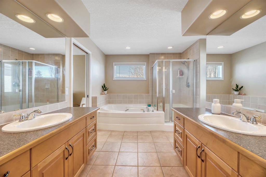 Welcome to this exceptional, custom 2341 sq ft plus finished basement 2 story residence, perfectly situated on a corner lot (no sidewalks) and quiet crescent, in the prestigious community of Evergreen Estates. This immaculate home delivers both comfort and functionality for modern family living. A grand foyer sets the tone as you enter, leading into an open-concept main floor, designed for effortless entertaining. The spacious living and dining areas flow beautifully into a well-appointed kitchen, featuring a highly functional layout and walk-in pantry. A private den, convenient main floor laundry, and a stylish powder room complete this level. Upstairs, retreat to the expansive primary suite—your own private sanctuary — a luxurious 5-piece ensuite, complete with separate vanities, a jetted soaker tub, walk-in closet, and exclusive balcony access. Two additional generously sized bedrooms and a well-designed bathroom with an oversized shower provide ample space for family or guests. Tiled kitchen & 2nd floor bathrooms have electric underfloor heating. The developed basement is fantastic featuring hydronic in-floor slab heating, a fourth bedroom with walk-in closet, a 3-piece bathroom with a relaxing sauna, and a versatile rec room/office space. For hobbyists or professionals, the rec room offers incredible flexibility - it was once used as a workshop and is currently a fun games room! Other things to note, both furnaces have been replaced and the home was built with PEX plumbing. Outside, enjoy beautifully mature landscaping, enhanced by an underground sprinkler system, along with a two-tier deck and covered patio—ideal for relaxing in your private outdoor oasis. The oversized double attached garage is finished and complemented by an exposed aggregate driveway and walkway that add to the home’s curb appeal. This home has been lovingly maintained and is presented in excellent condition. Located on a quiet street with minimal traffic, yet close to parks, schools, pathways and trail systems of Fish Creek Park as well as many other amenities, This is a rare opportunity to own a refined home in one of Calgary’s most desirable communities.